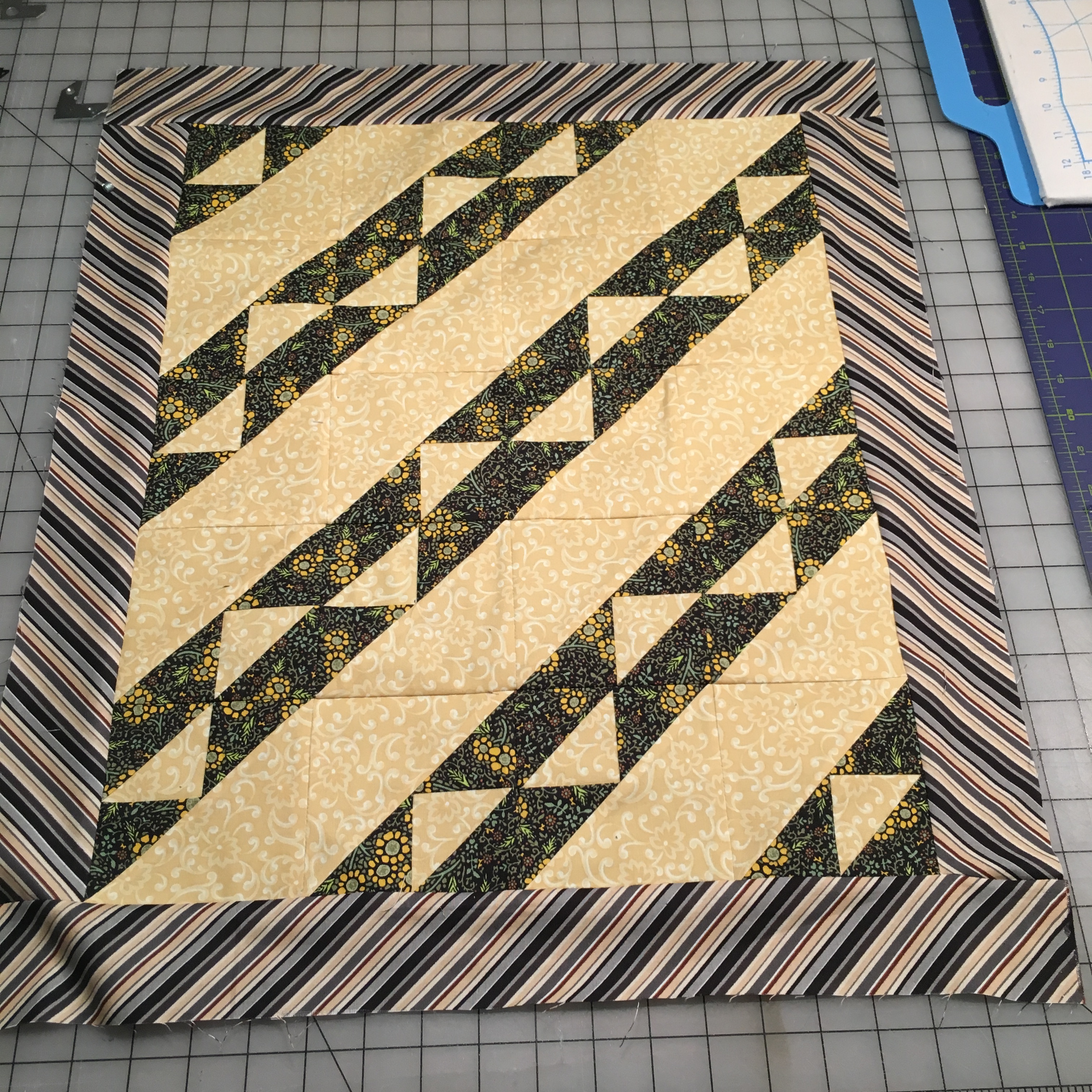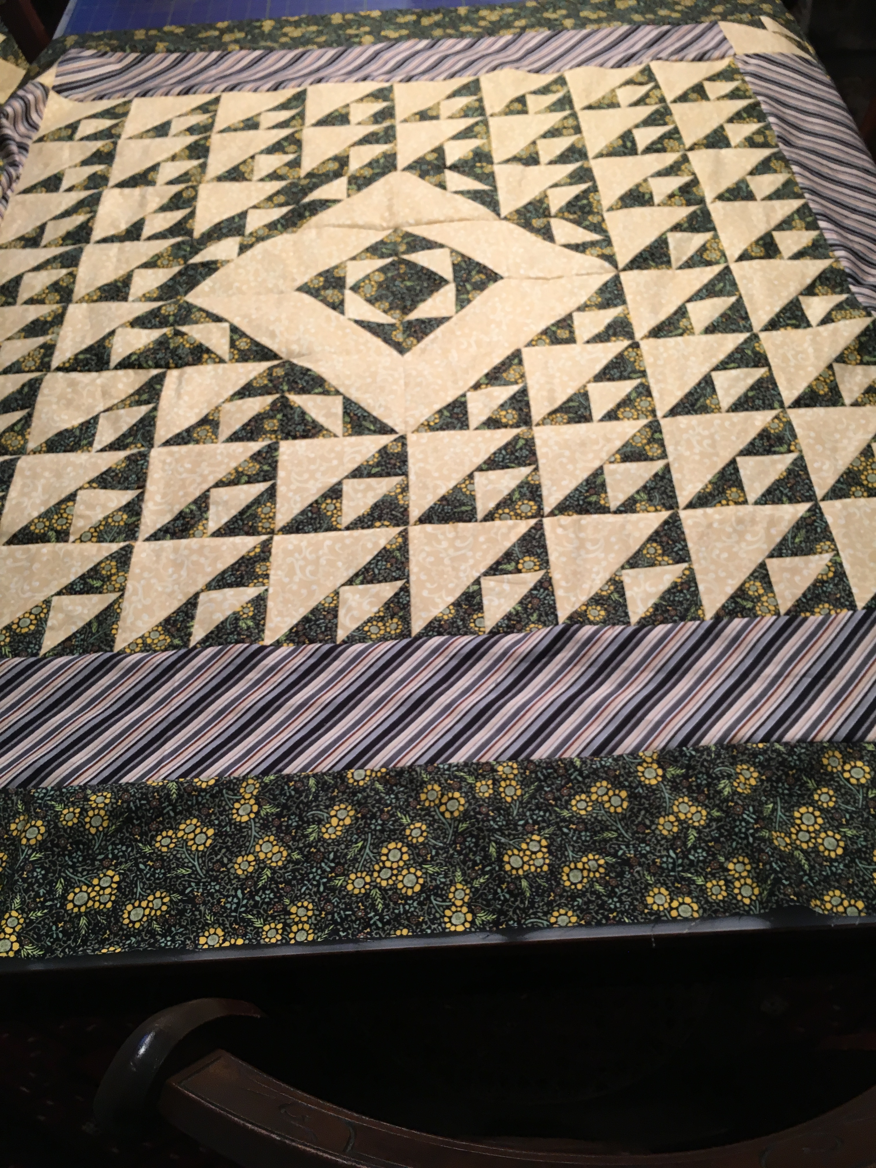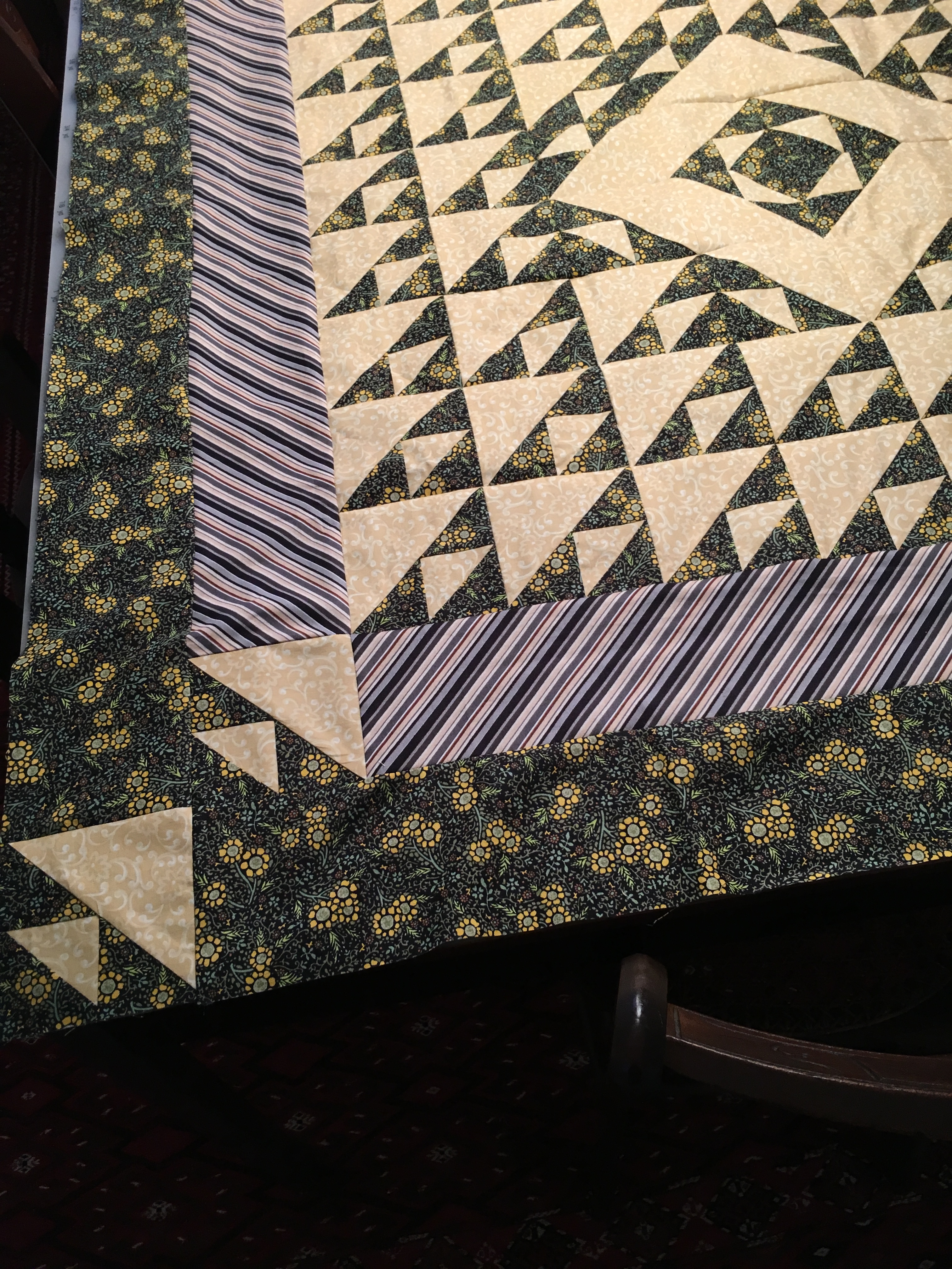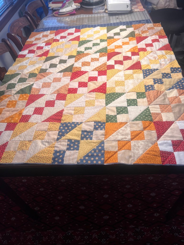 This is a classic quilt block, Jacob’s Ladder. Again, using my collection of five-inch squares, and cutting them either diagonaly, or into quarters, these blocks came together swiftly. Arranging them on the diagonal moves the eye, and creates direction. For the binding I joined strips of fabric the colors used in the quilt.