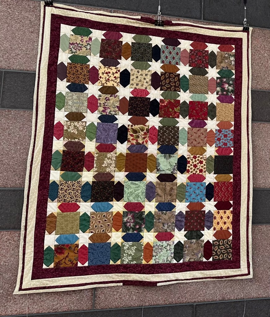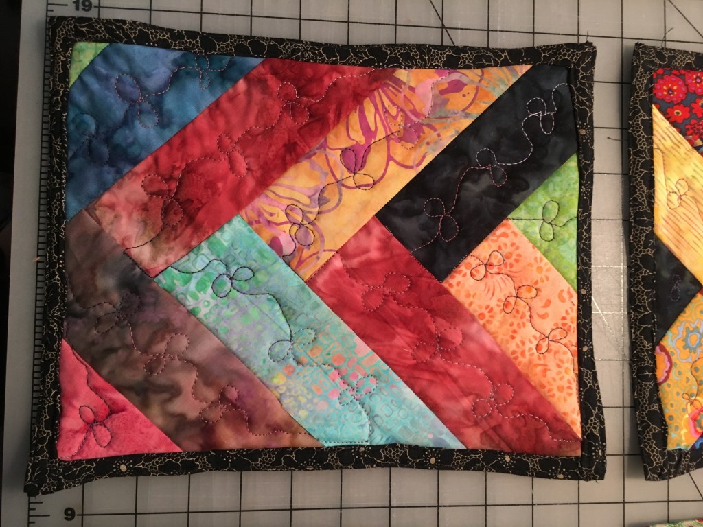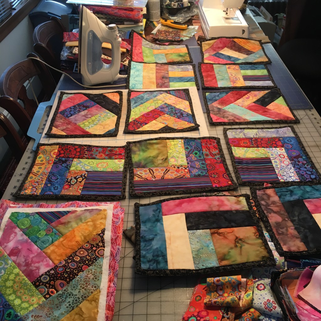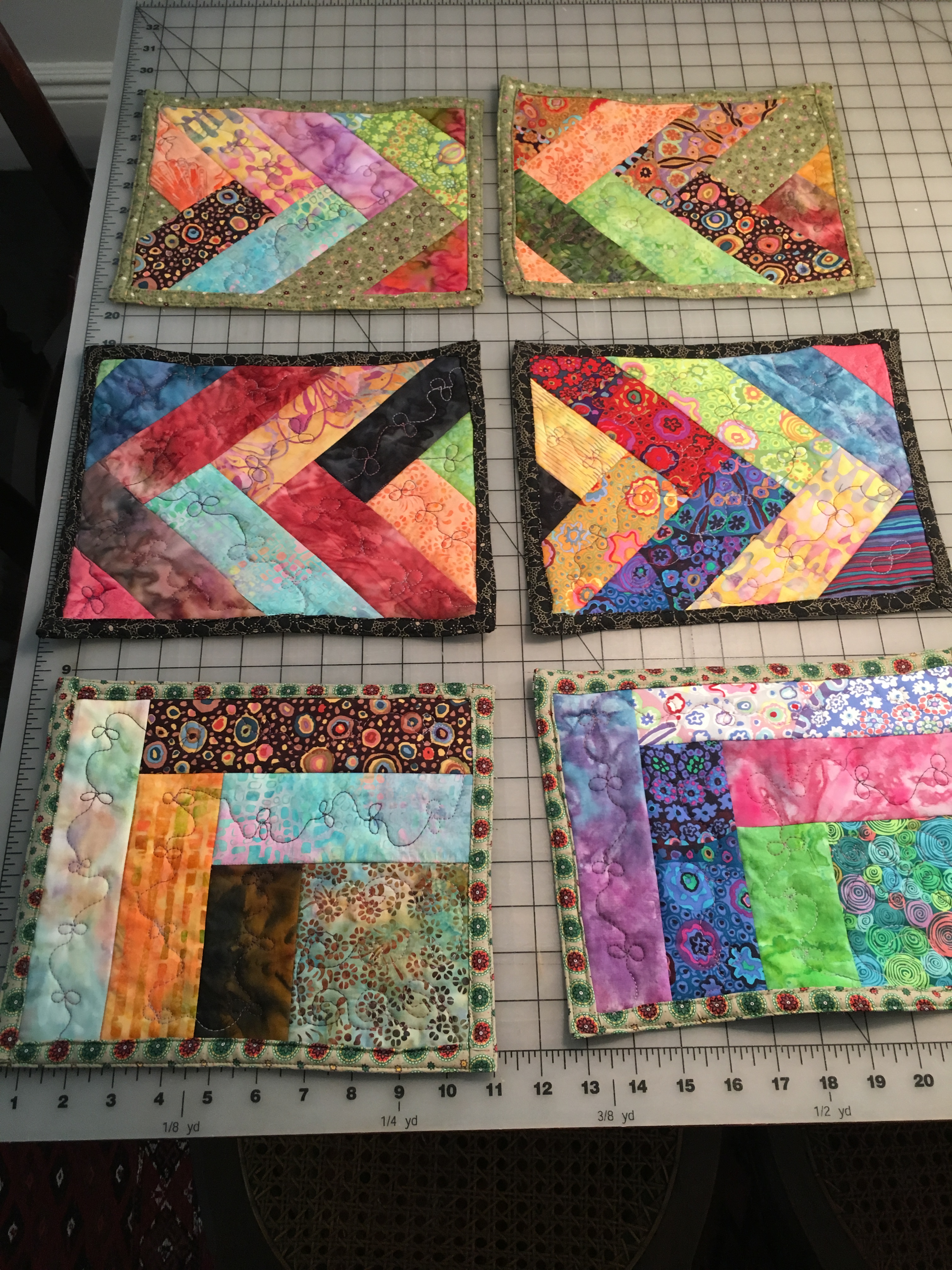 As a thank you gift for the members of my Womens’ Club of Forest Hills Board, I made 38 of these mug mats. Two inch wide cuts in a variety of colors and patterns, they went together quickly. Quilting was a breeze in such small pieces, and the ladies loved them. Small practical gifts always please.