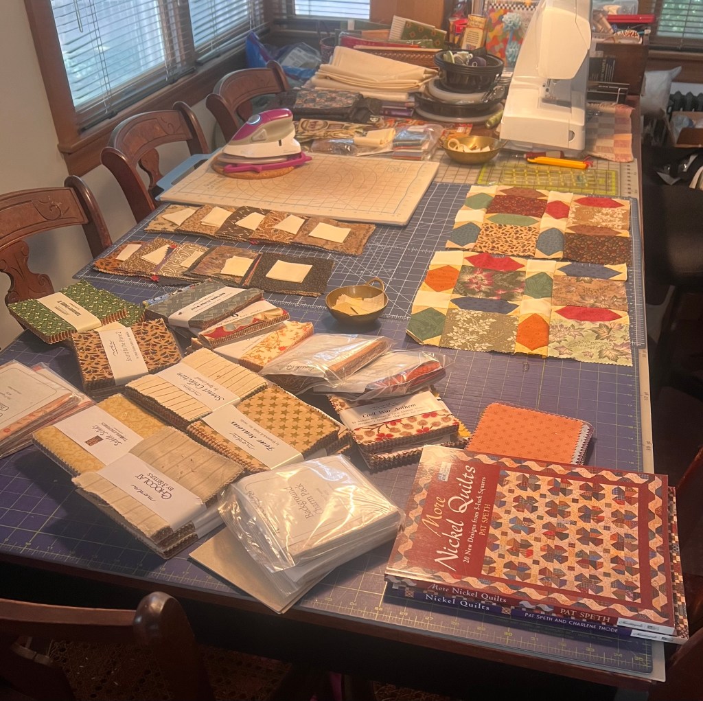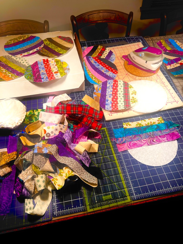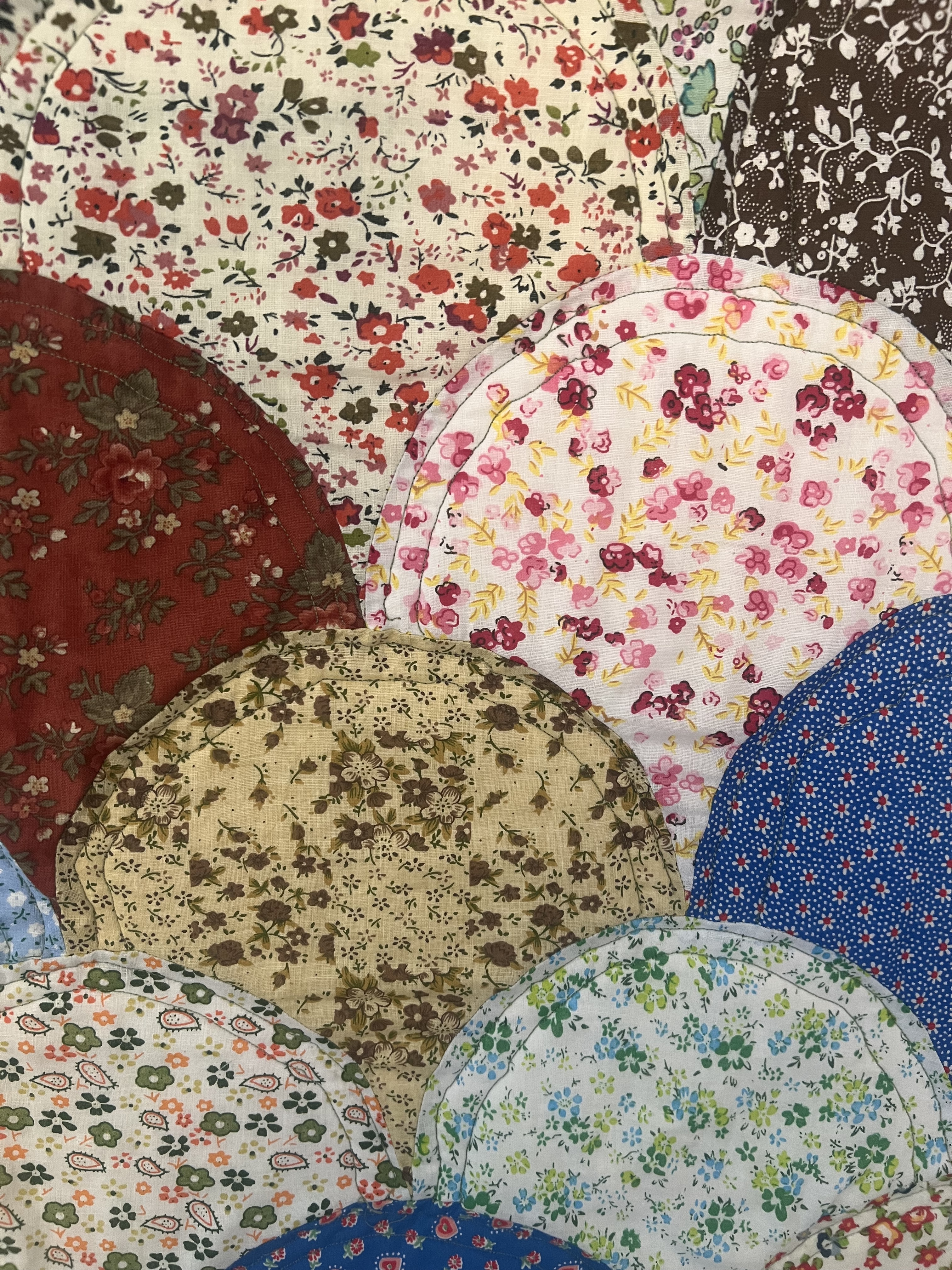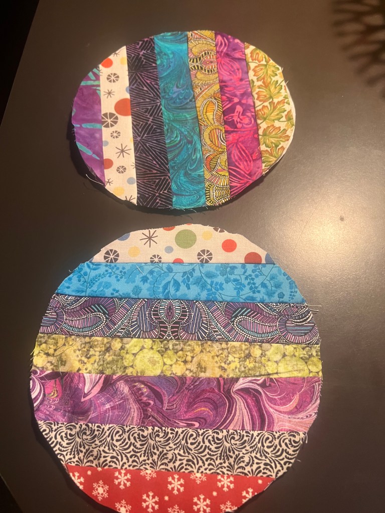 As a thank you gift for the members of my Womens’ Club of Forest Hills Board, I made 38 of these mug mats. Two inch wide cuts in a variety of colors and patterns, they went together quickly. Quilting was a breeze in such small pieces, and the ladies loved them. Small practical gifts always please.