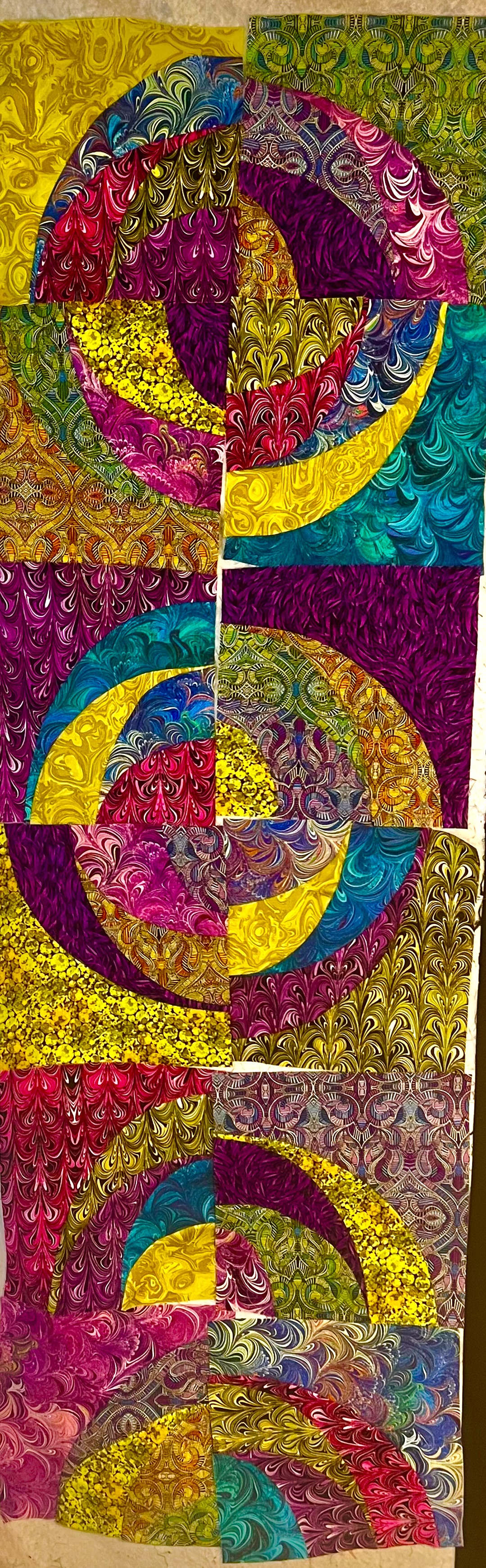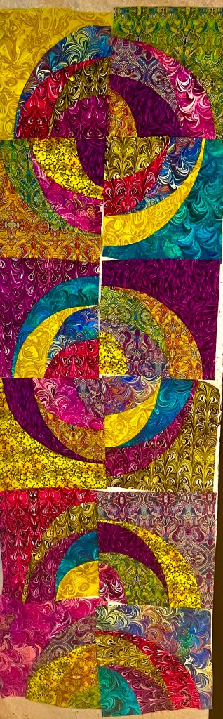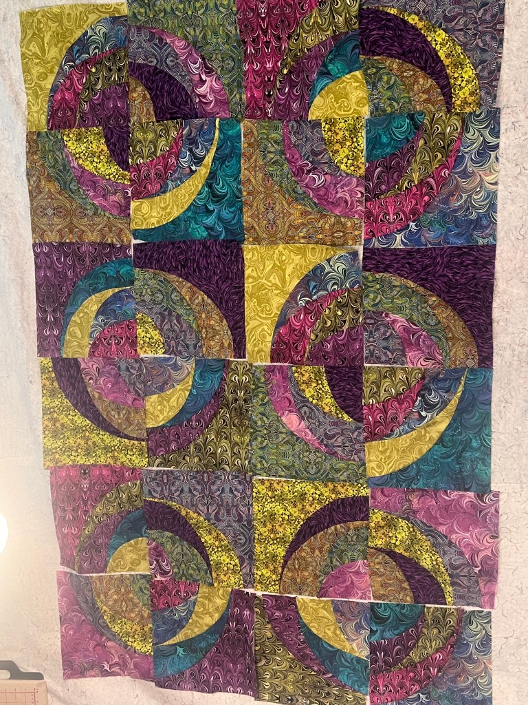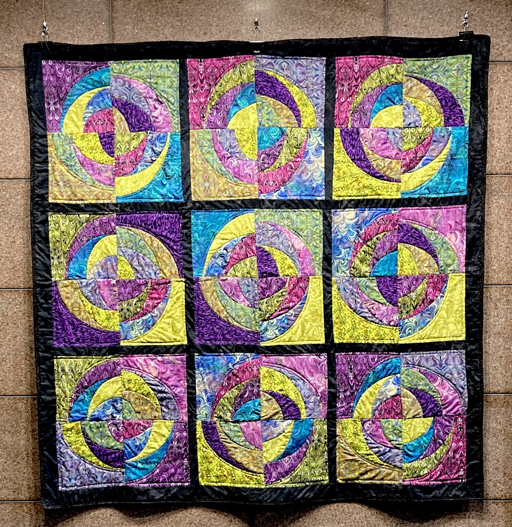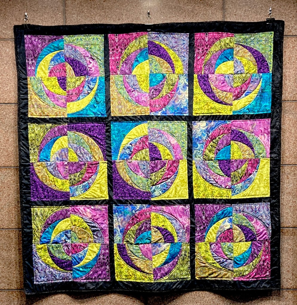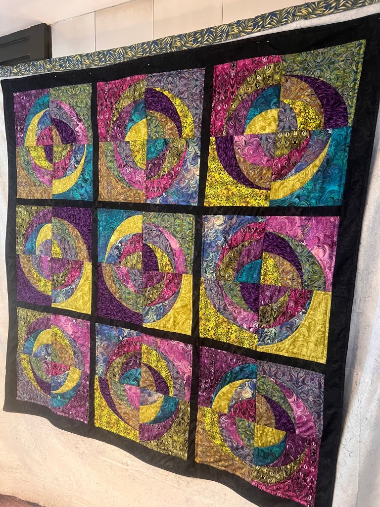 This pattern called “Blue Onion” inspired me, but I wanted it to be multi-colored. I chose background fabrics from several Paula Nadelstern fabric lines. VERY careful cutting using a specialty ruler, and precise directions, garnered all the curved pieces. It was helpful to have experience sewing curves. Lots of colors, lots of movement. I am delighted with how it turned out.