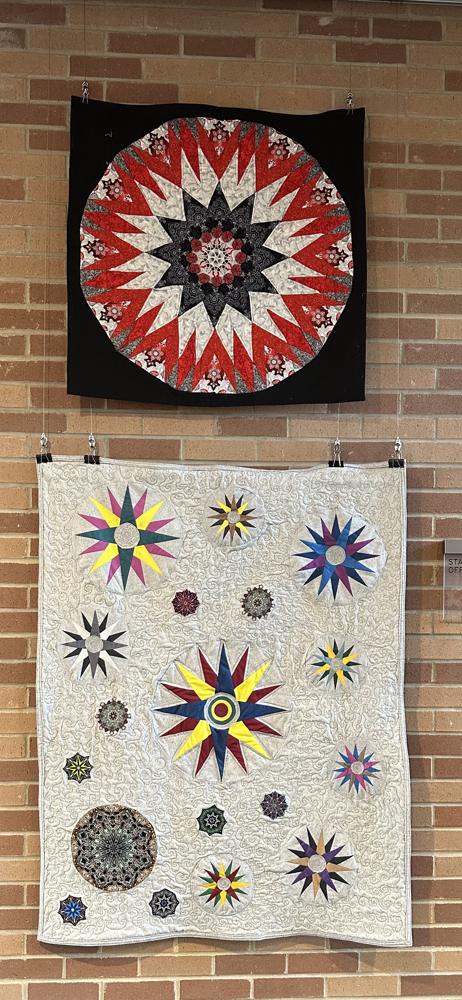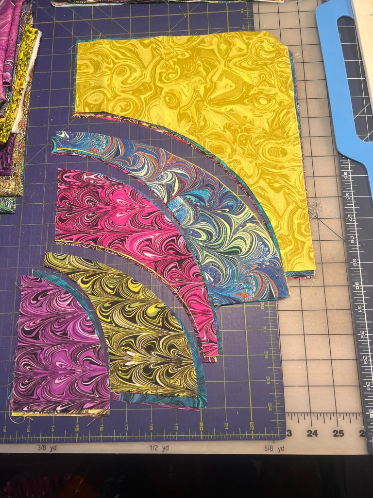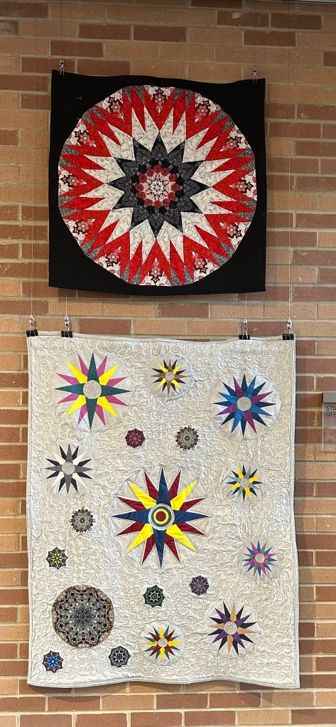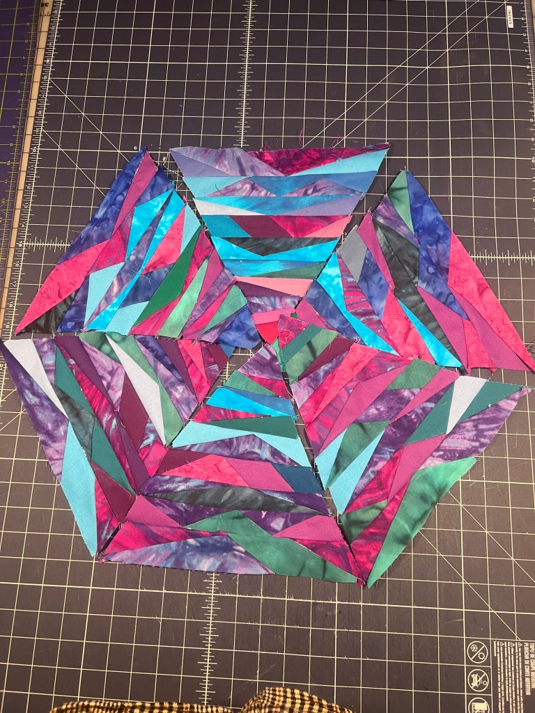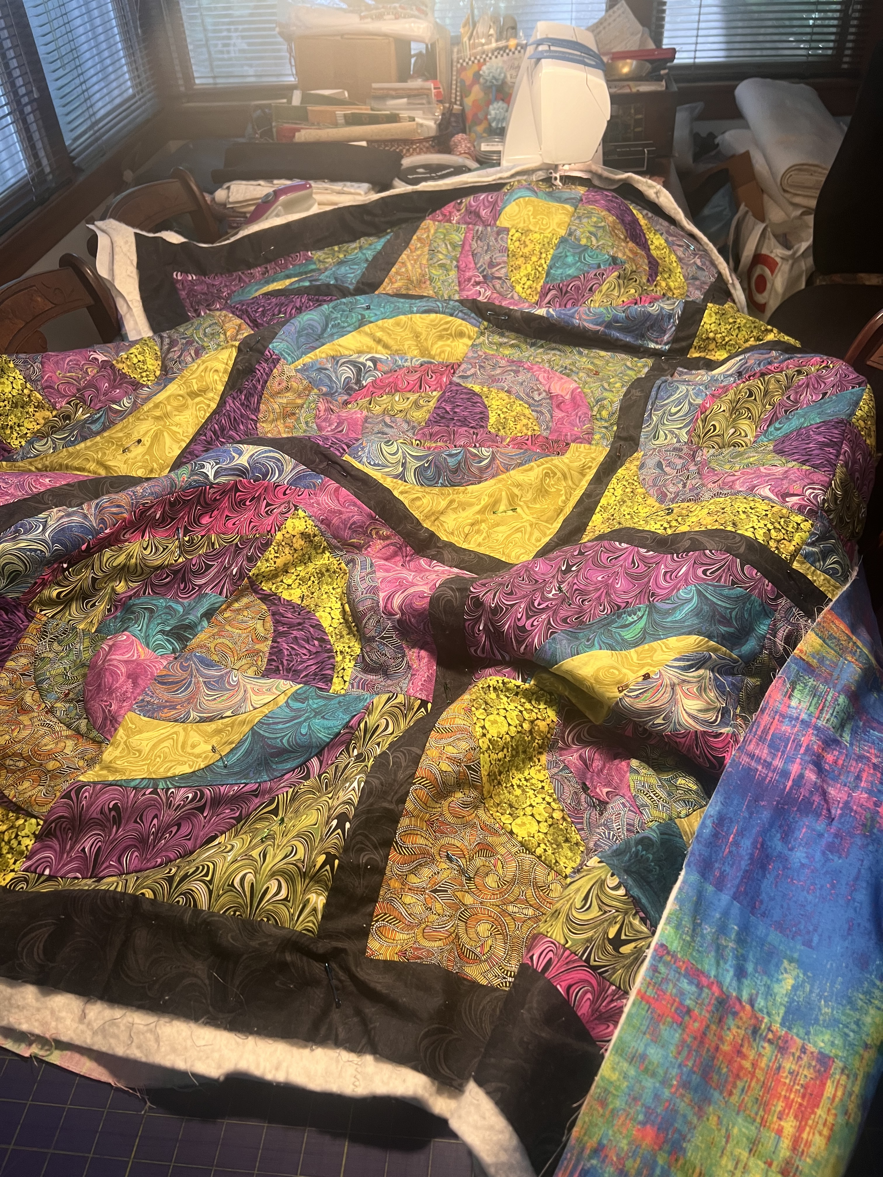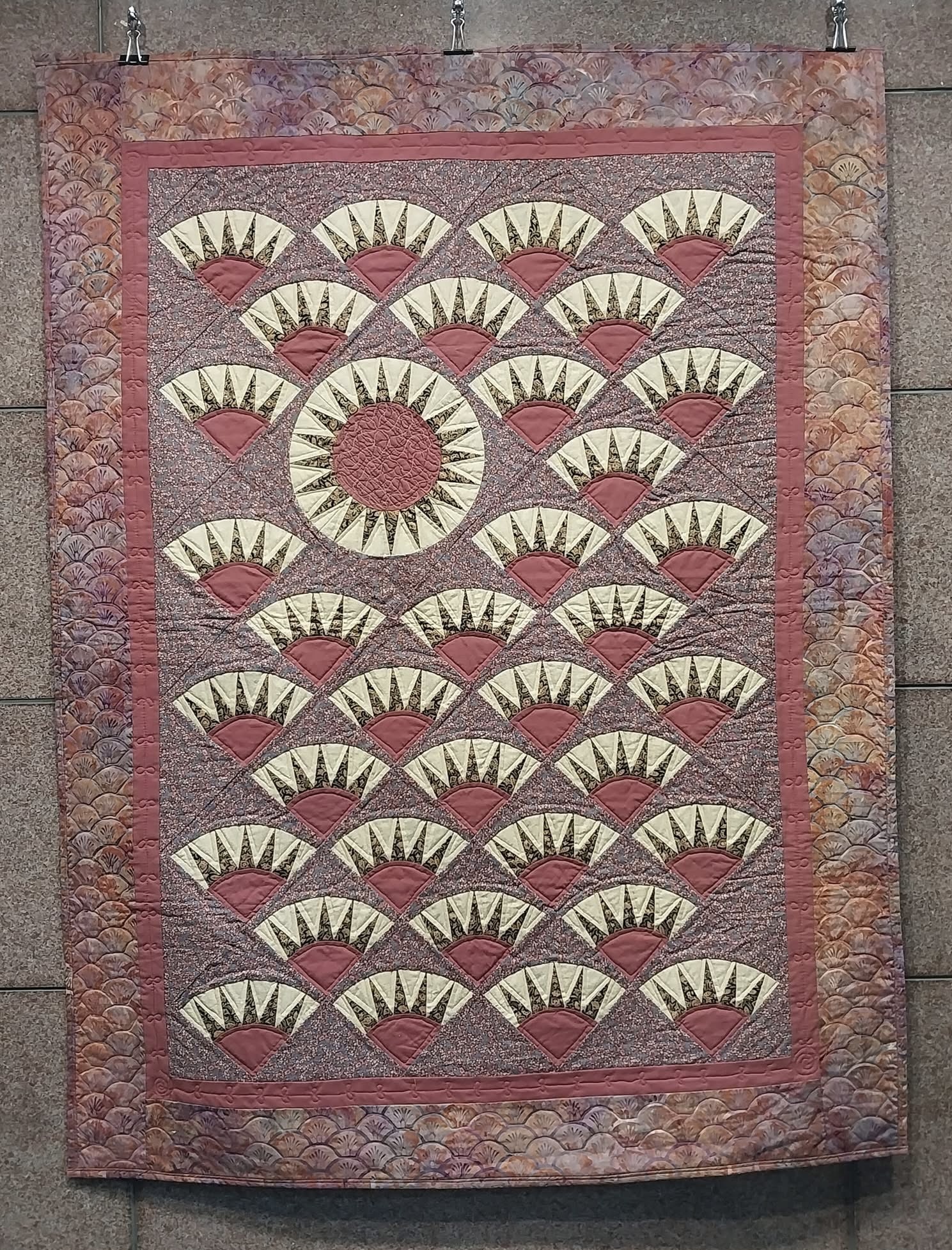 This pattern called “Blue Onion” inspired me, but I wanted it to be multi-colored. I chose background fabrics from several Paula Nadelstern fabric lines. VERY careful cutting using a specialty ruler, and precise directions, garnered all the curved pieces. It was helpful to have experience sewing curves. Lots of colors, lots of movement. I am delighted with how it turned out.
