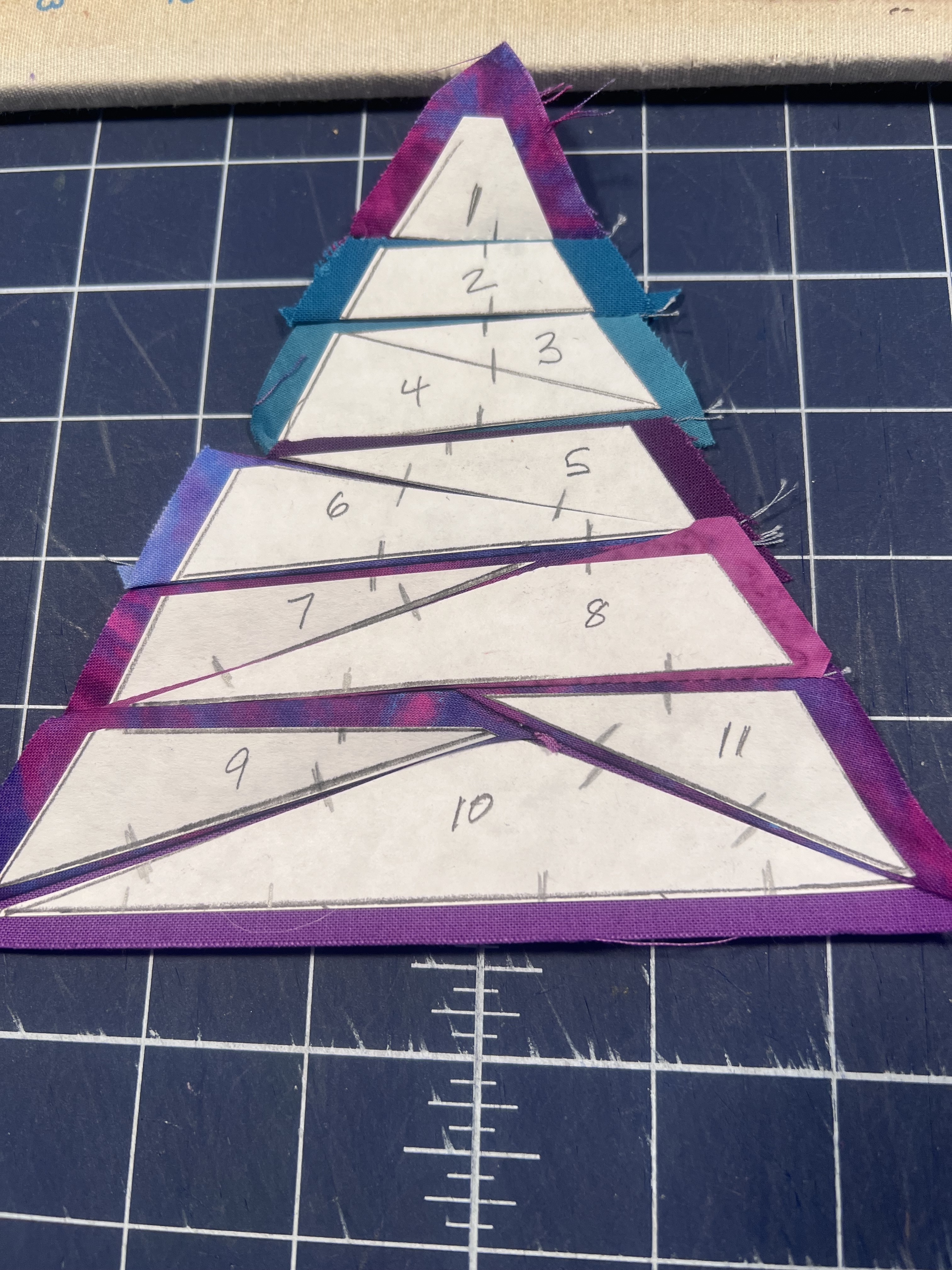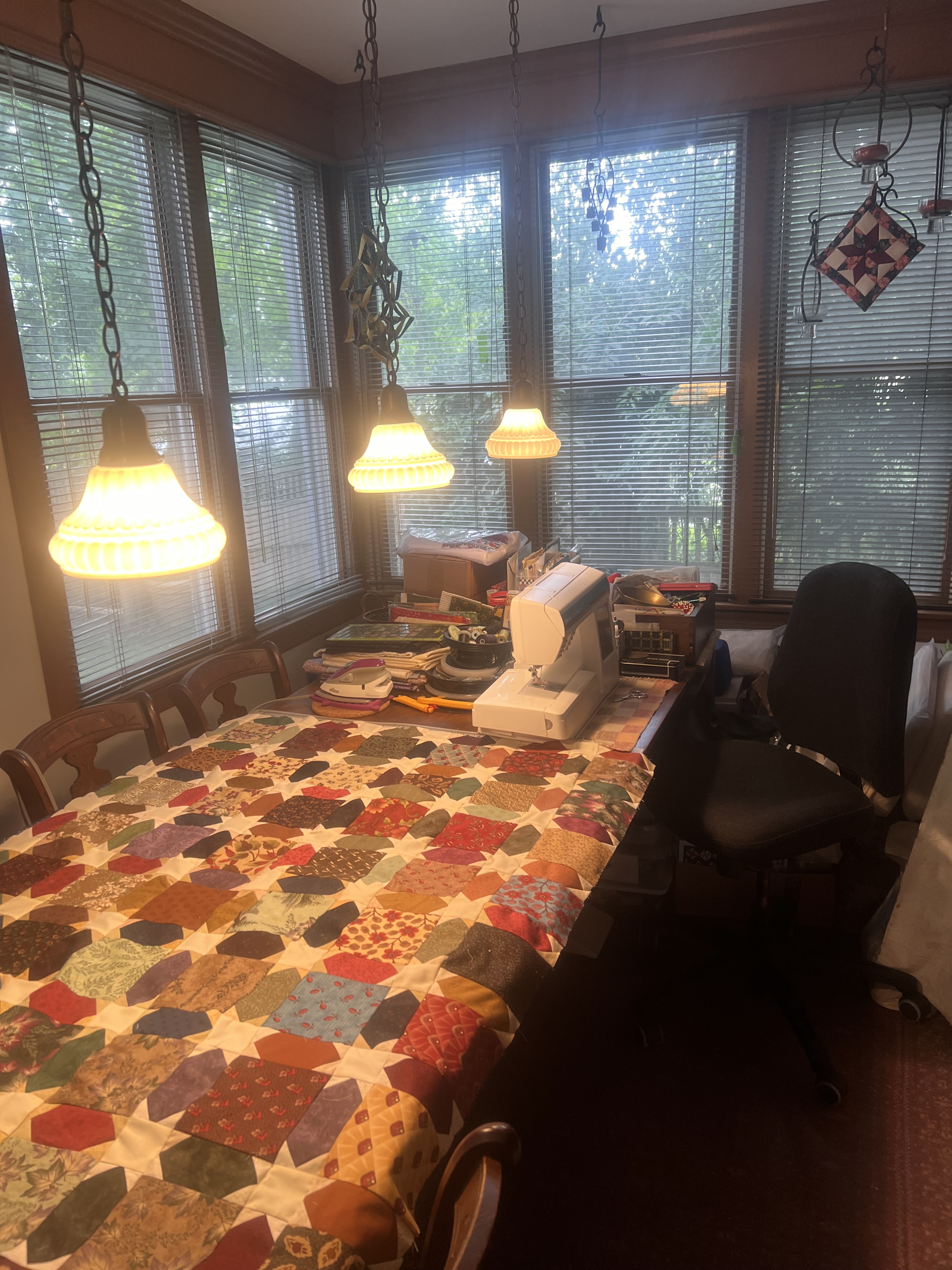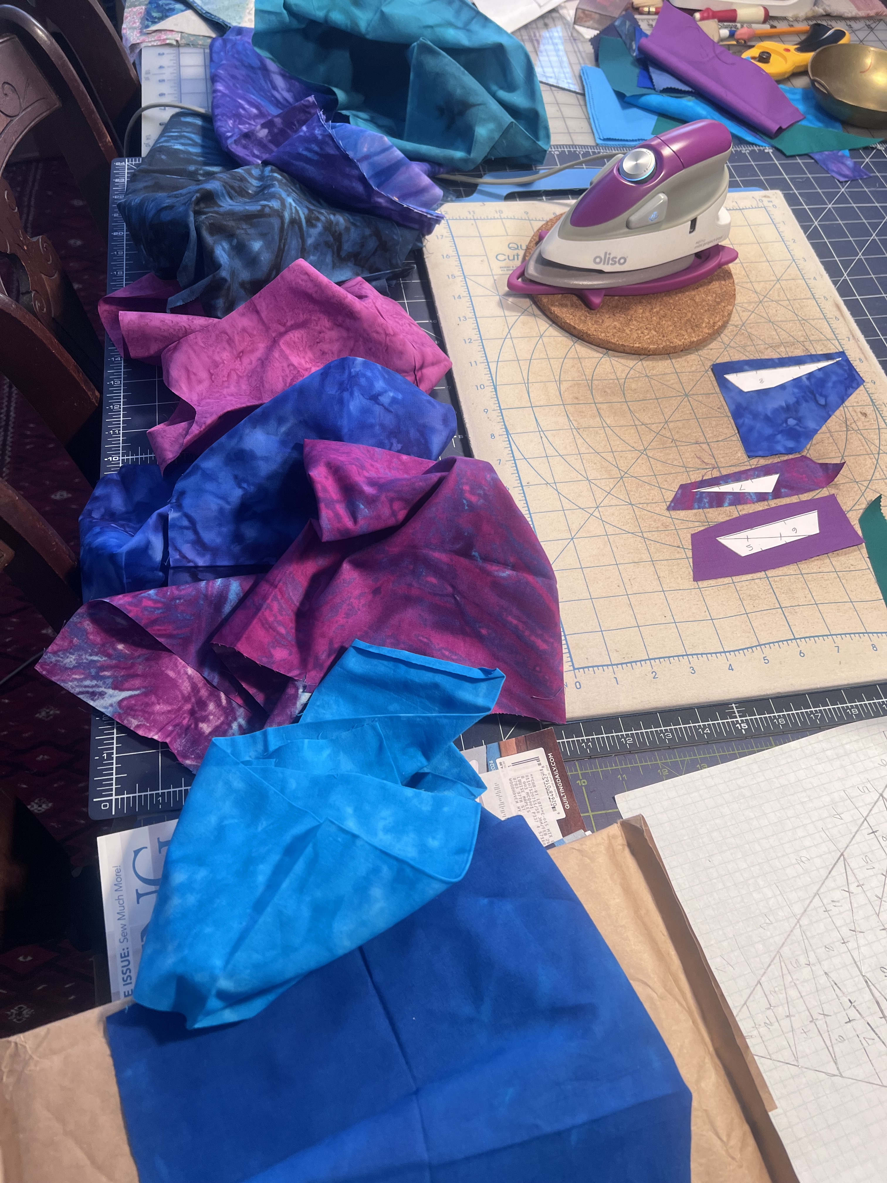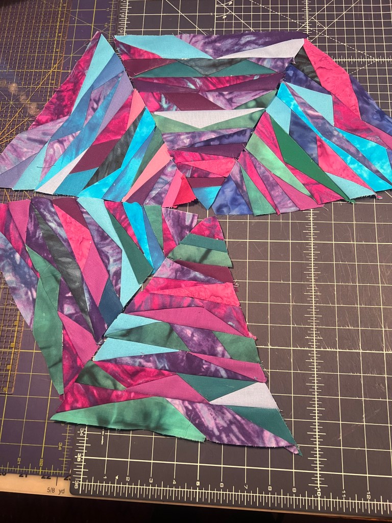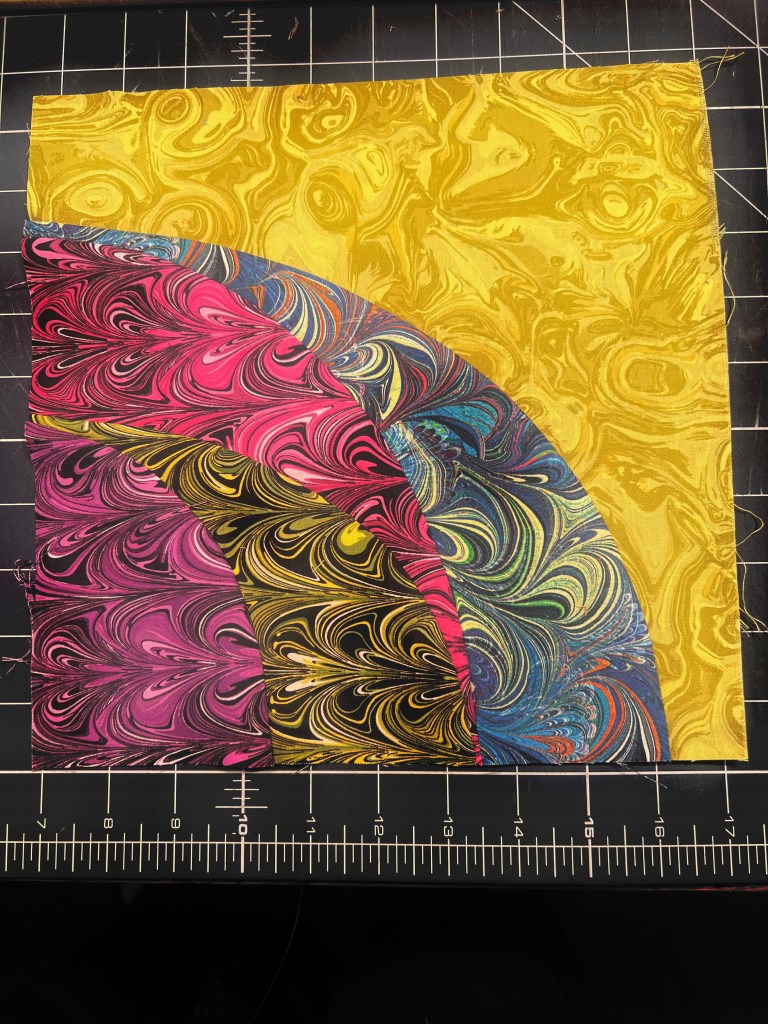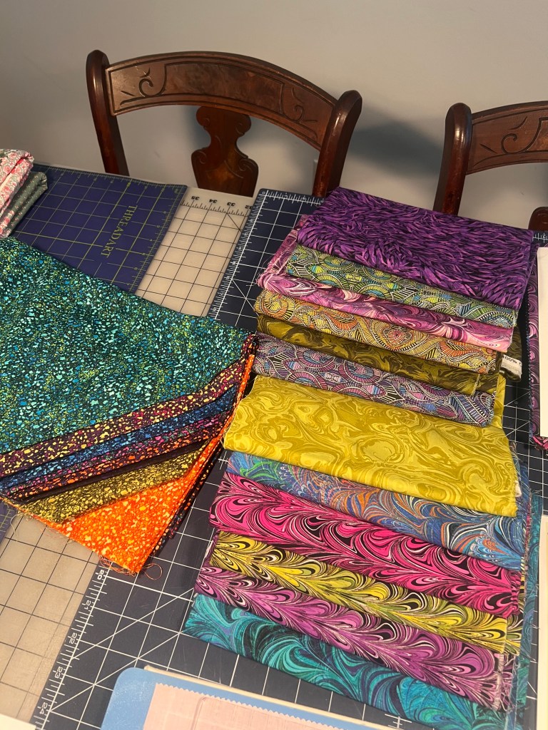 This pattern called “Blue Onion” inspired me, but I wanted it to be multi-colored. I chose background fabrics from several Paula Nadelstern fabric lines. VERY careful cutting using a specialty ruler, and precise directions, garnered all the curved pieces. It was helpful to have experience sewing curves. Lots of colors, lots of movement. I am delighted with how it turned out.