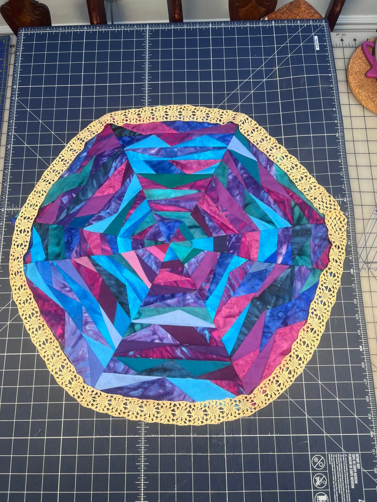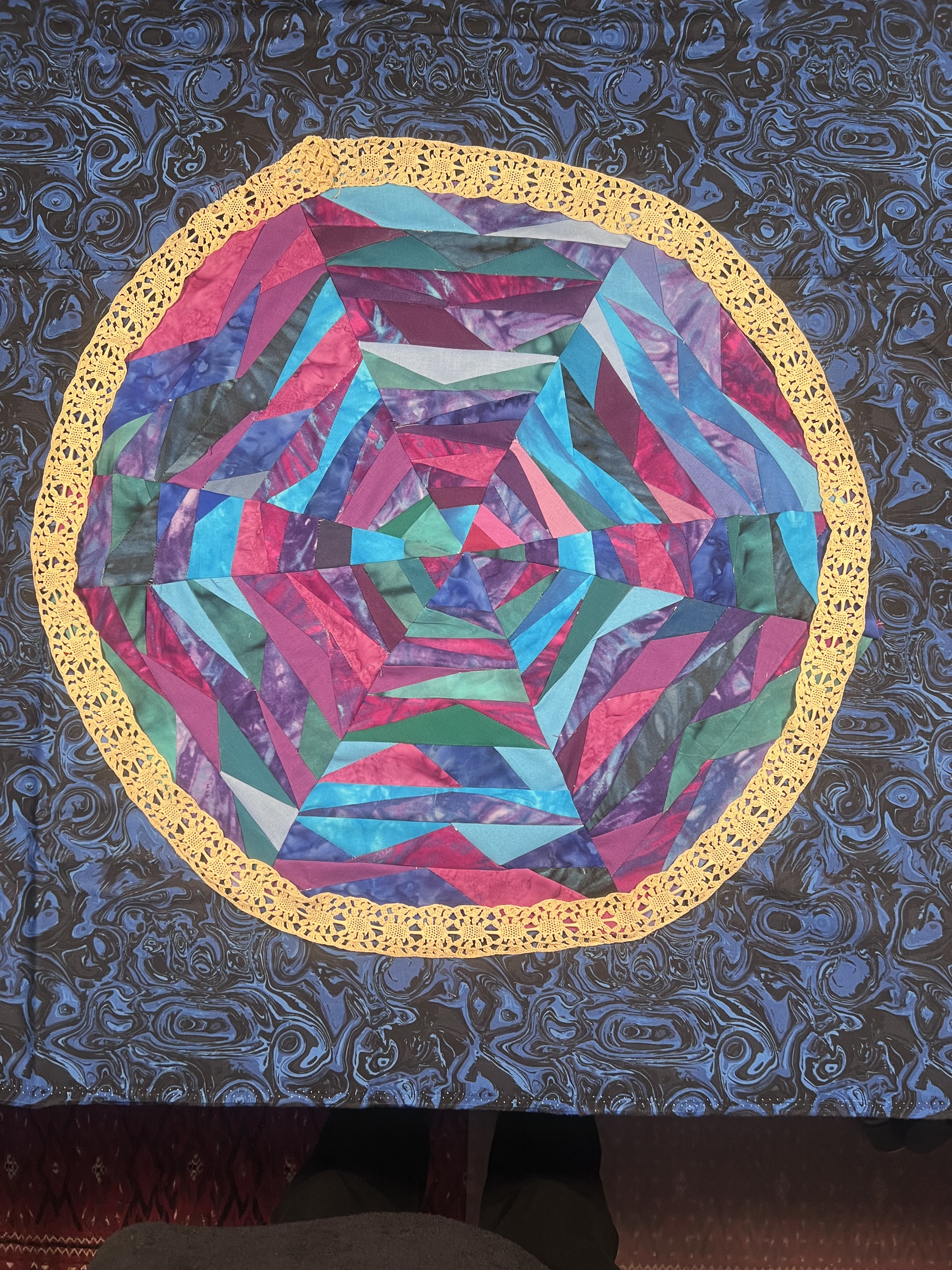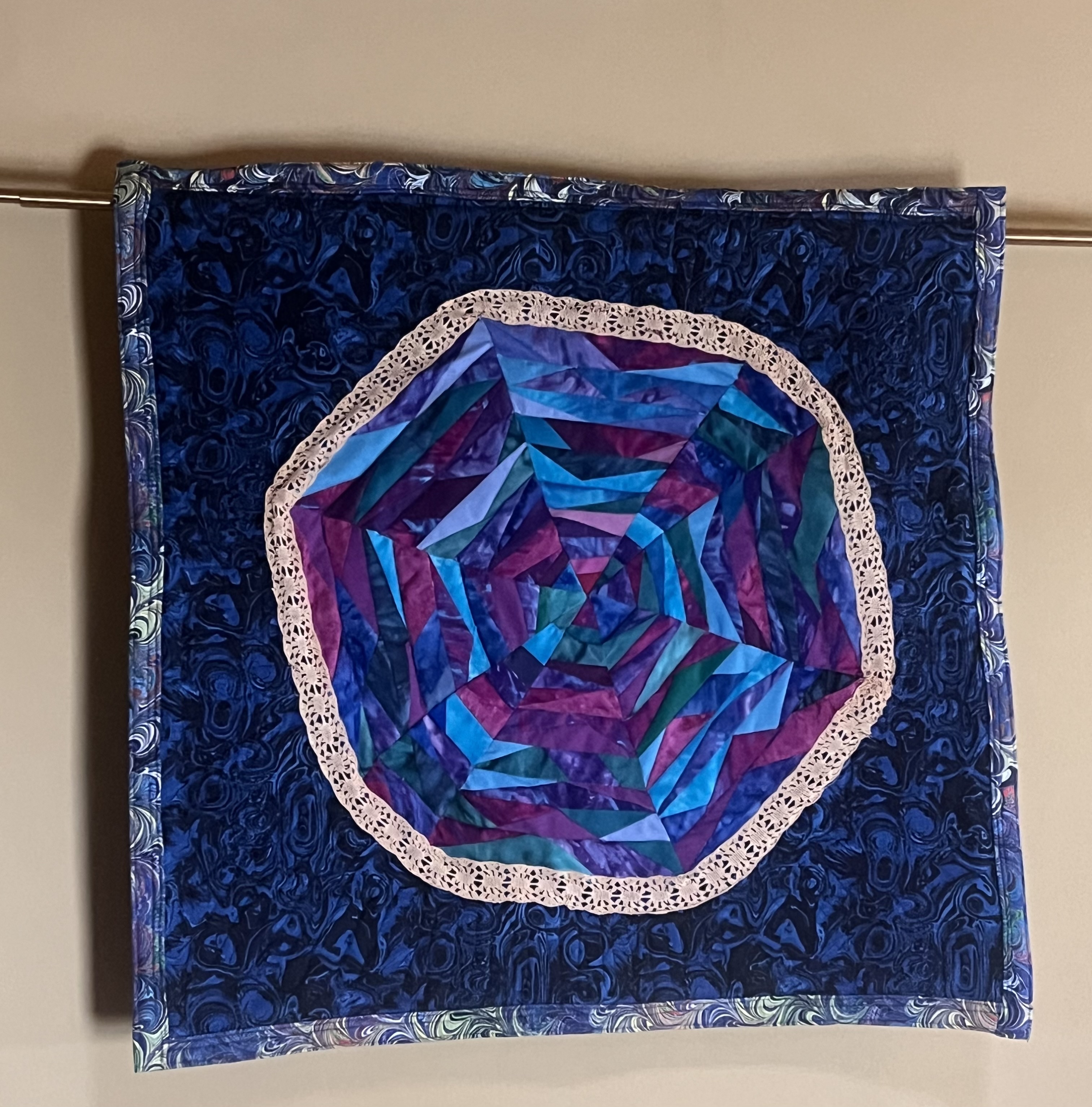This wall hanging was made for my friend Linda for her June birthday. First drawn up on graph paper, the design was then printed out on freezer paper which adheres to fabric when ironed. I sliced and diced the sheets into pieces, ironing them onto patches of Indonesian batik fabrics. Cutting 1/4″ margin around all sides allows for easy joining. The completed wedges did not come together perfectly, so I added two half wedges to make the 360 degrees I needed. Added some antique lace, and placed together on a rich dark blue poured color background for a perfect gem setting. A very Zen project.