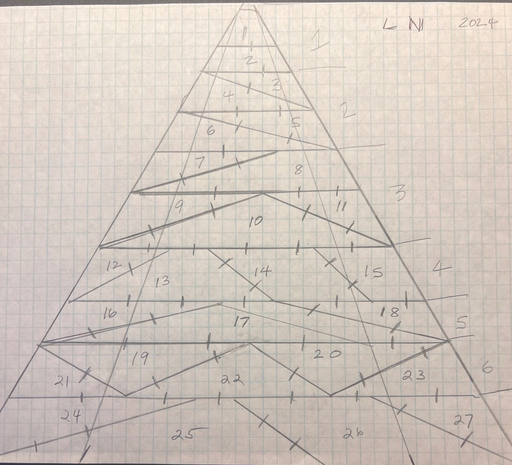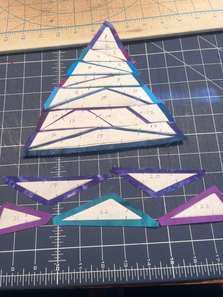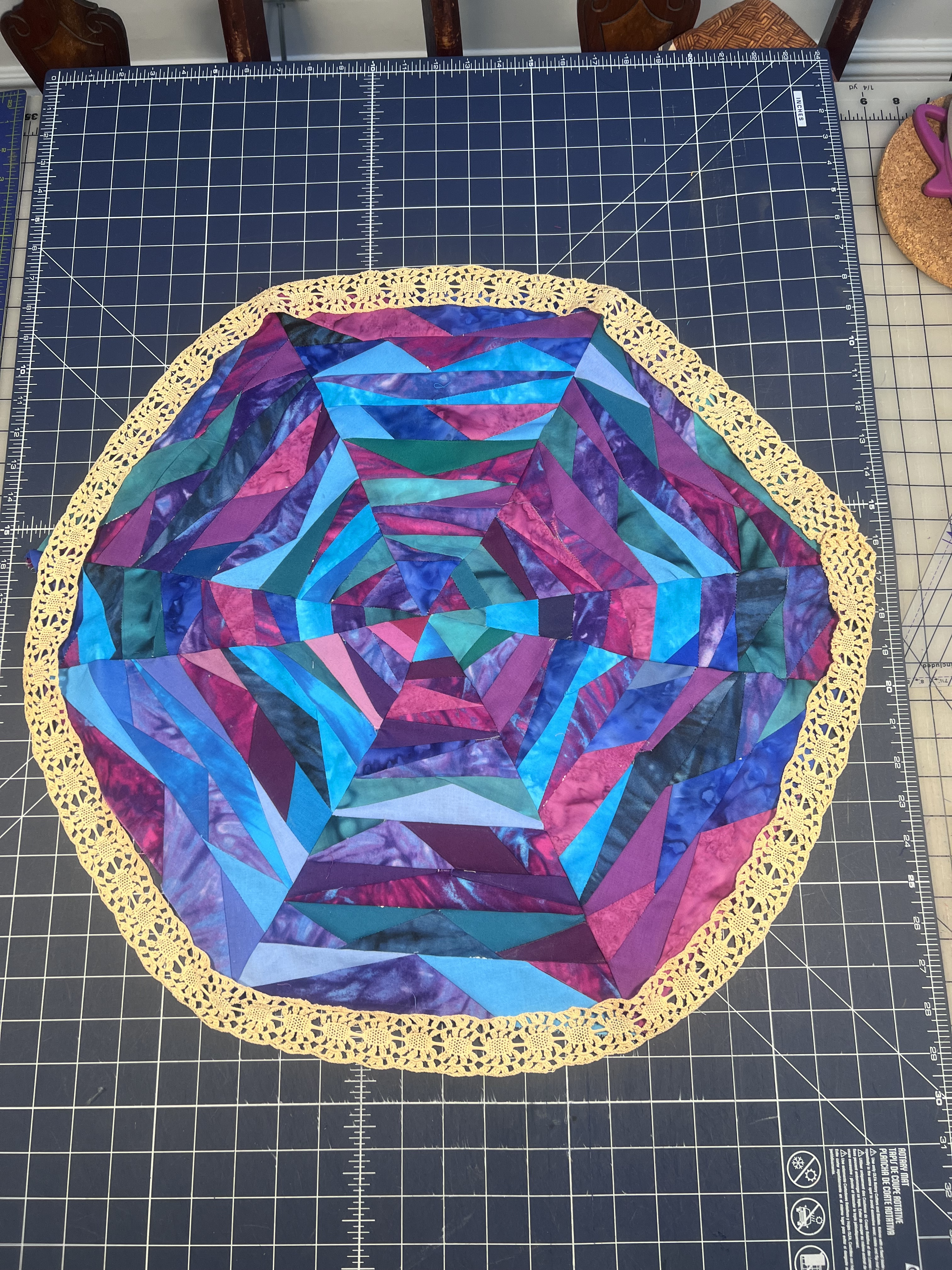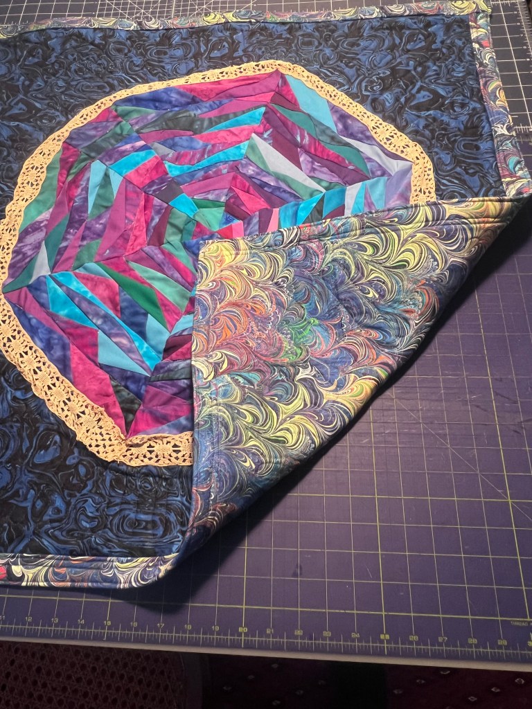 This wall hanging was made for my friend Linda for her June birthday. First drawn up on graph paper, the design was then printed out on freezer paper which adheres to fabric when ironed. I sliced and diced the sheets into pieces, ironing them onto patches of Indonesian batik fabrics. Cutting 1/4″ margin around all sides allows for easy joining. The completed wedges did not come together perfectly, so I added two half wedges to make the 360 degrees I needed. Added some antique lace, and placed together on a rich dark blue poured color background for a perfect gem setting. A very Zen project.