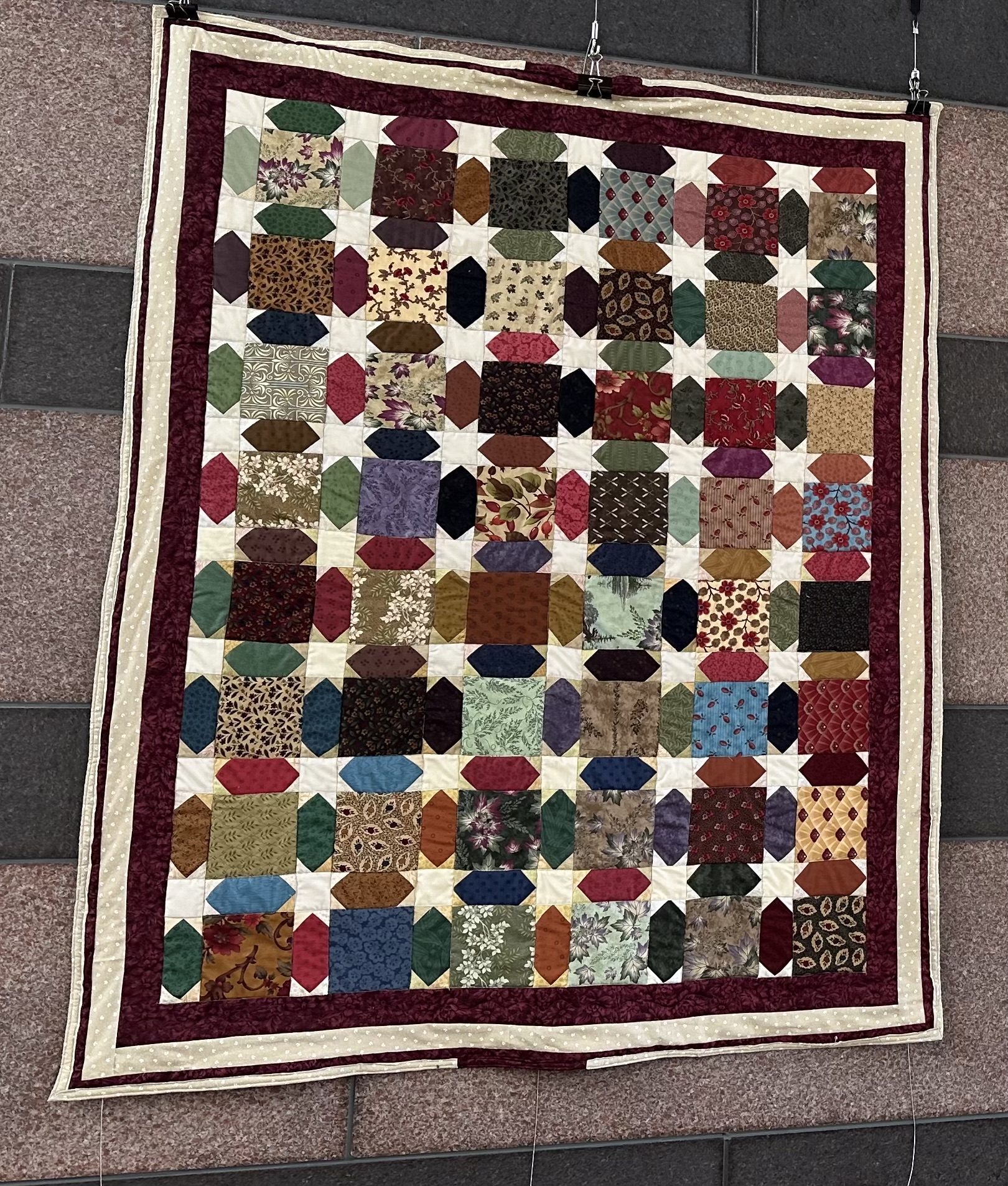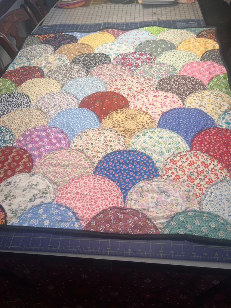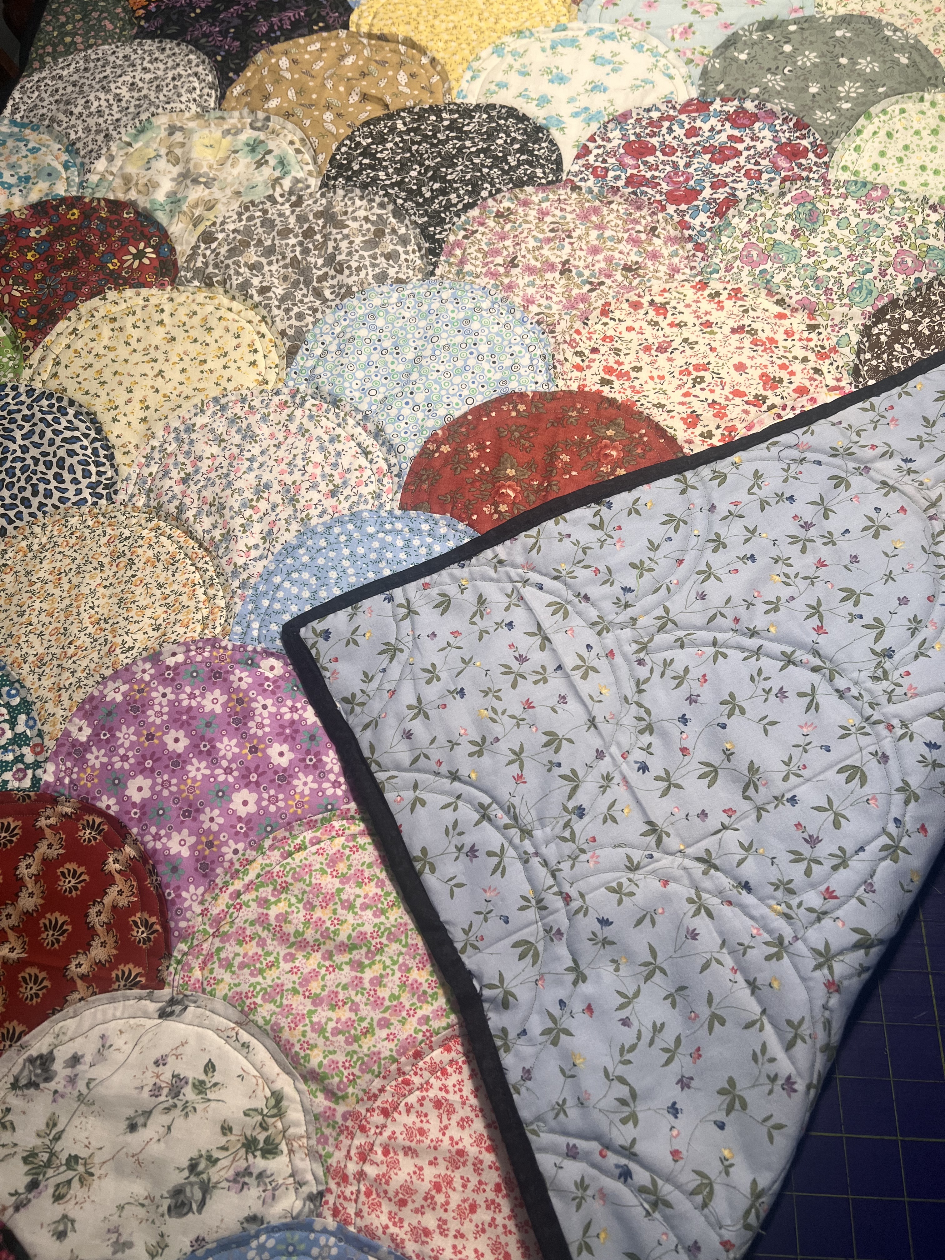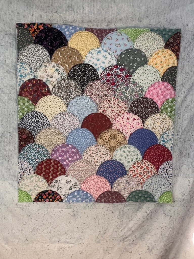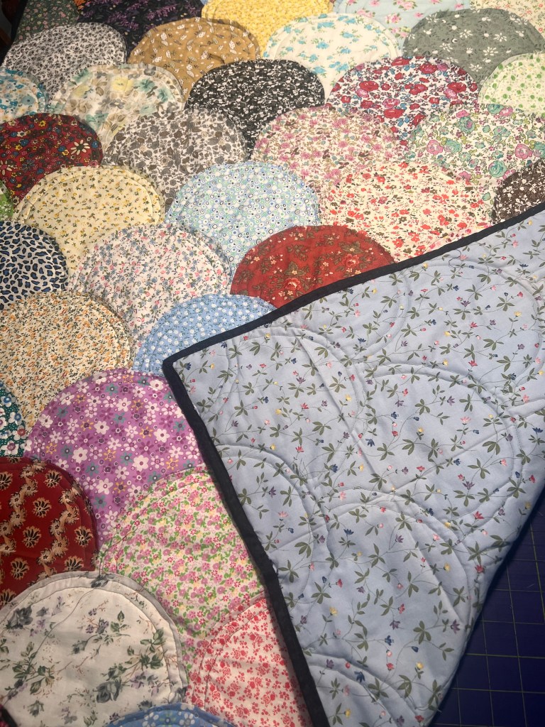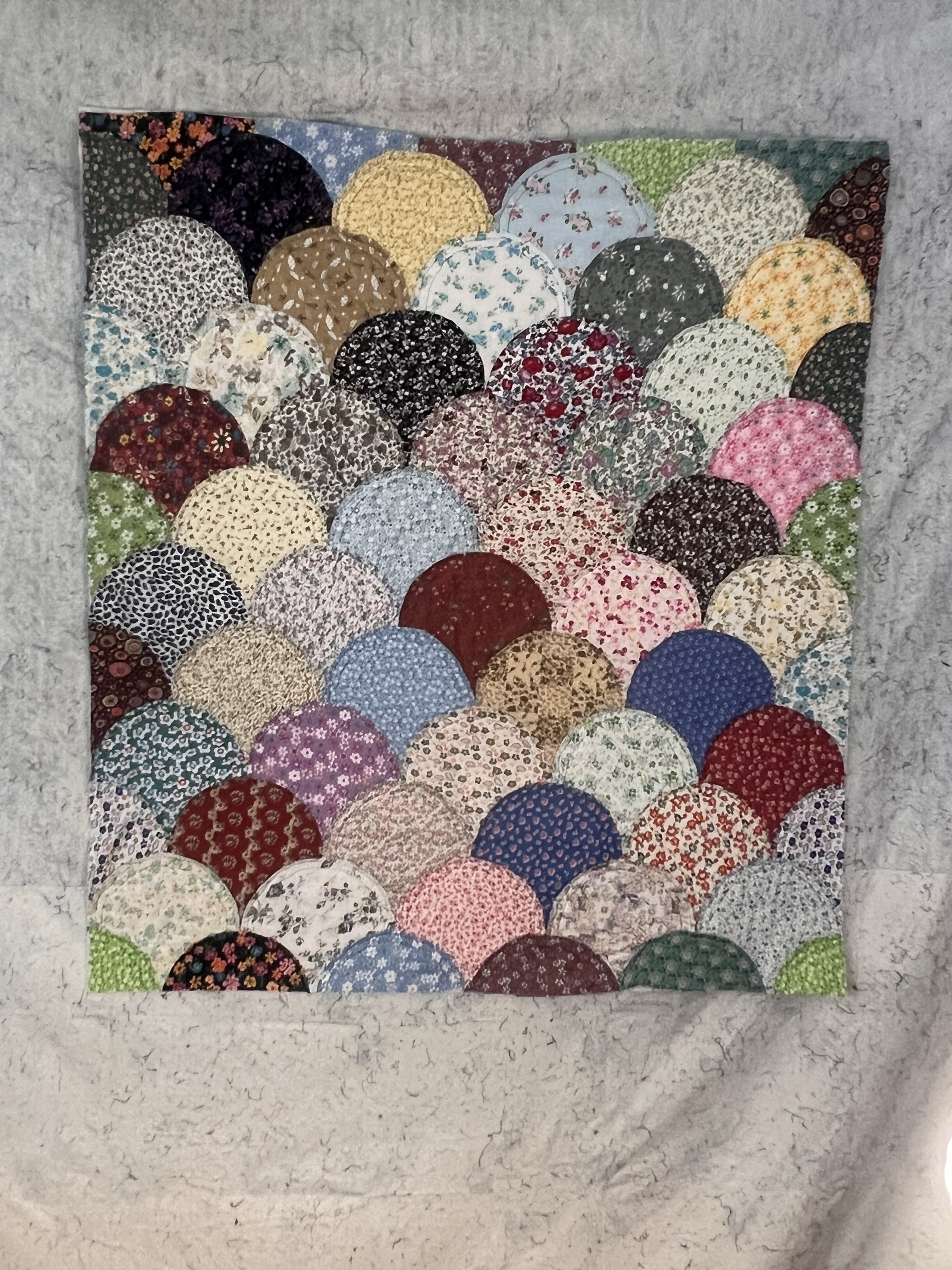 This quilt was created with a bundle of 10″ calico squares, and an Accuquilt Clamshell die, making precise point matching possible. It was a real challenge with curved quilting, and sharp points. A soft blue print is the backing, and narrow black binding finished it off. A charming child’s quilt.