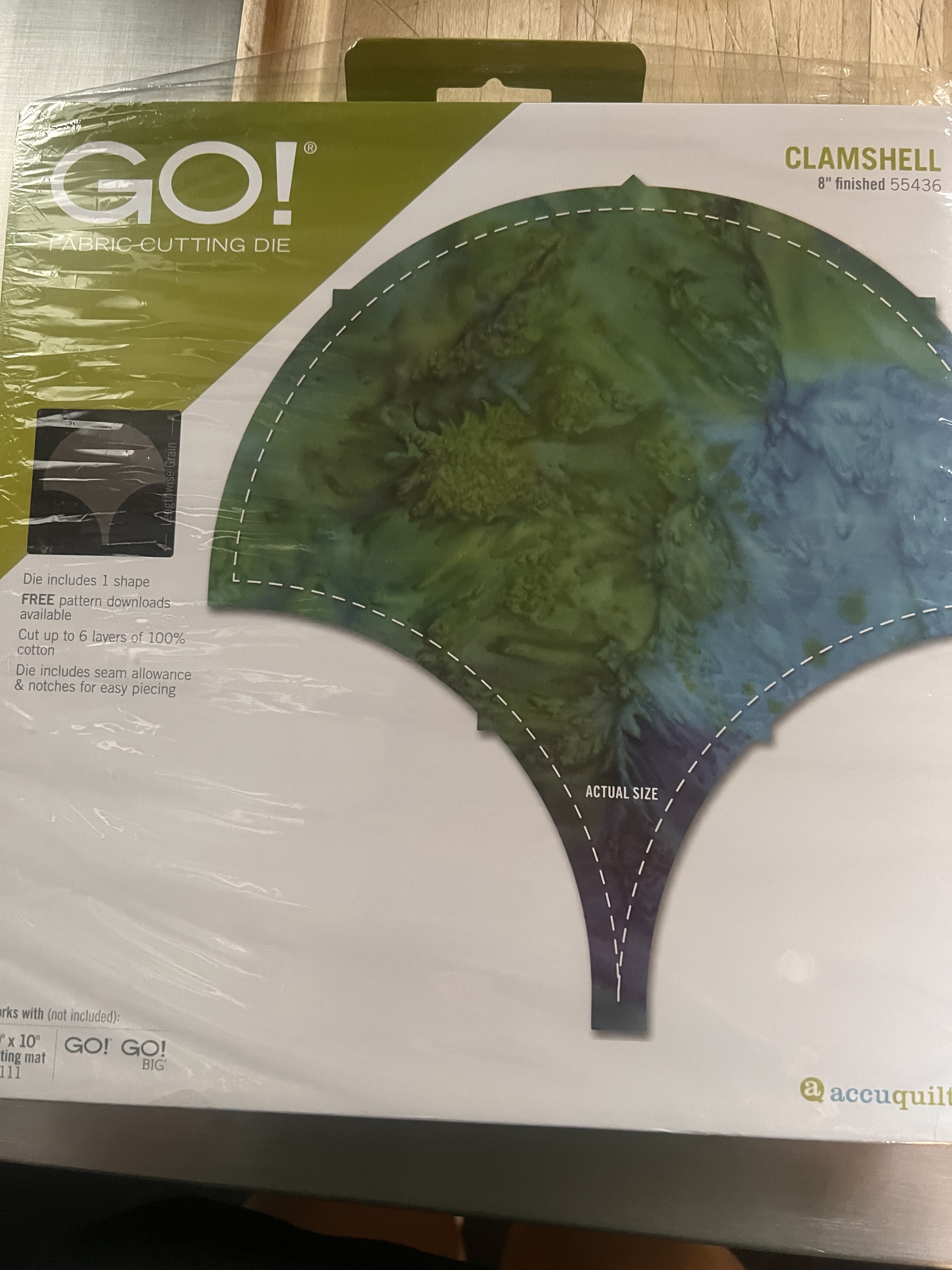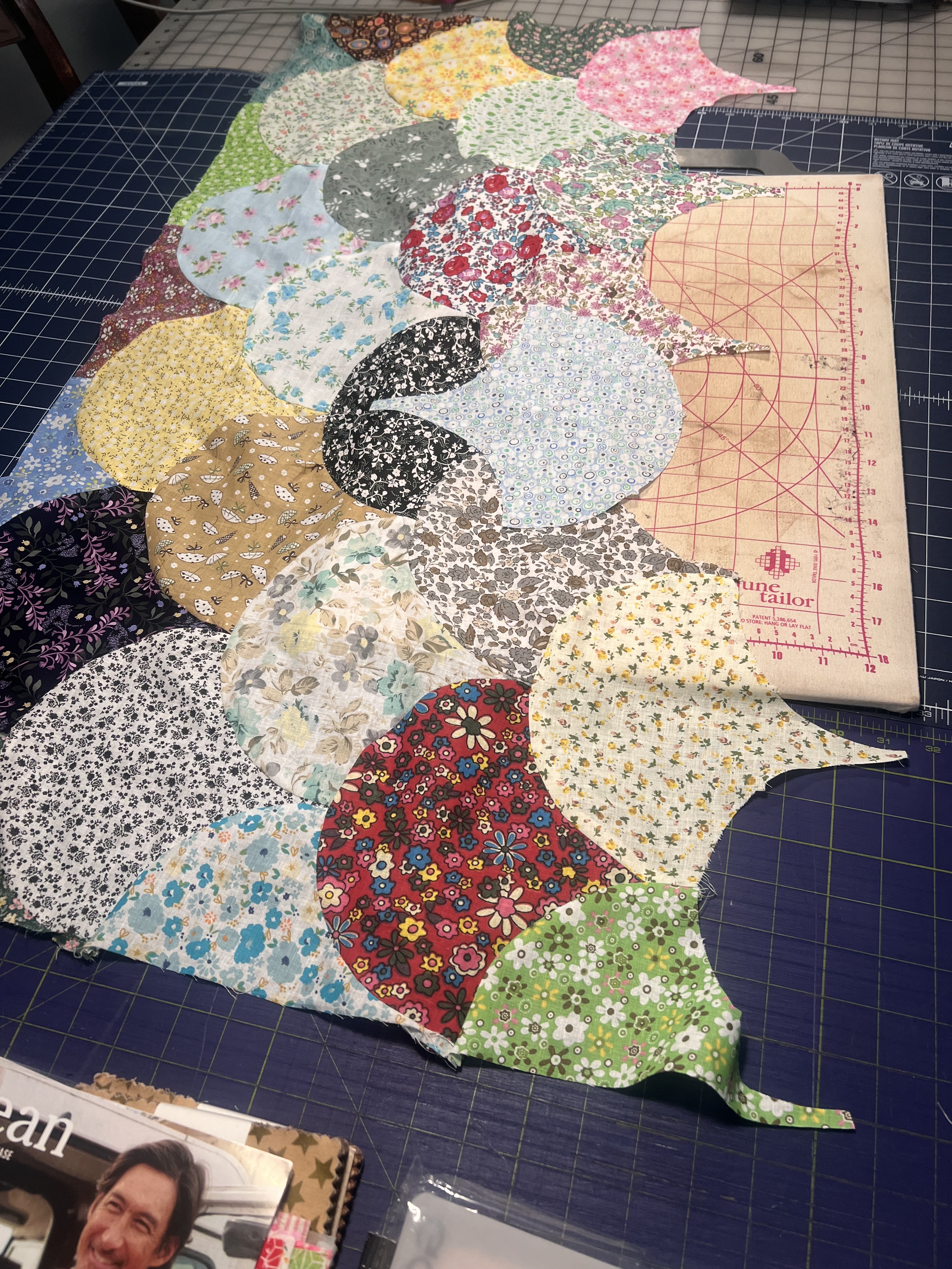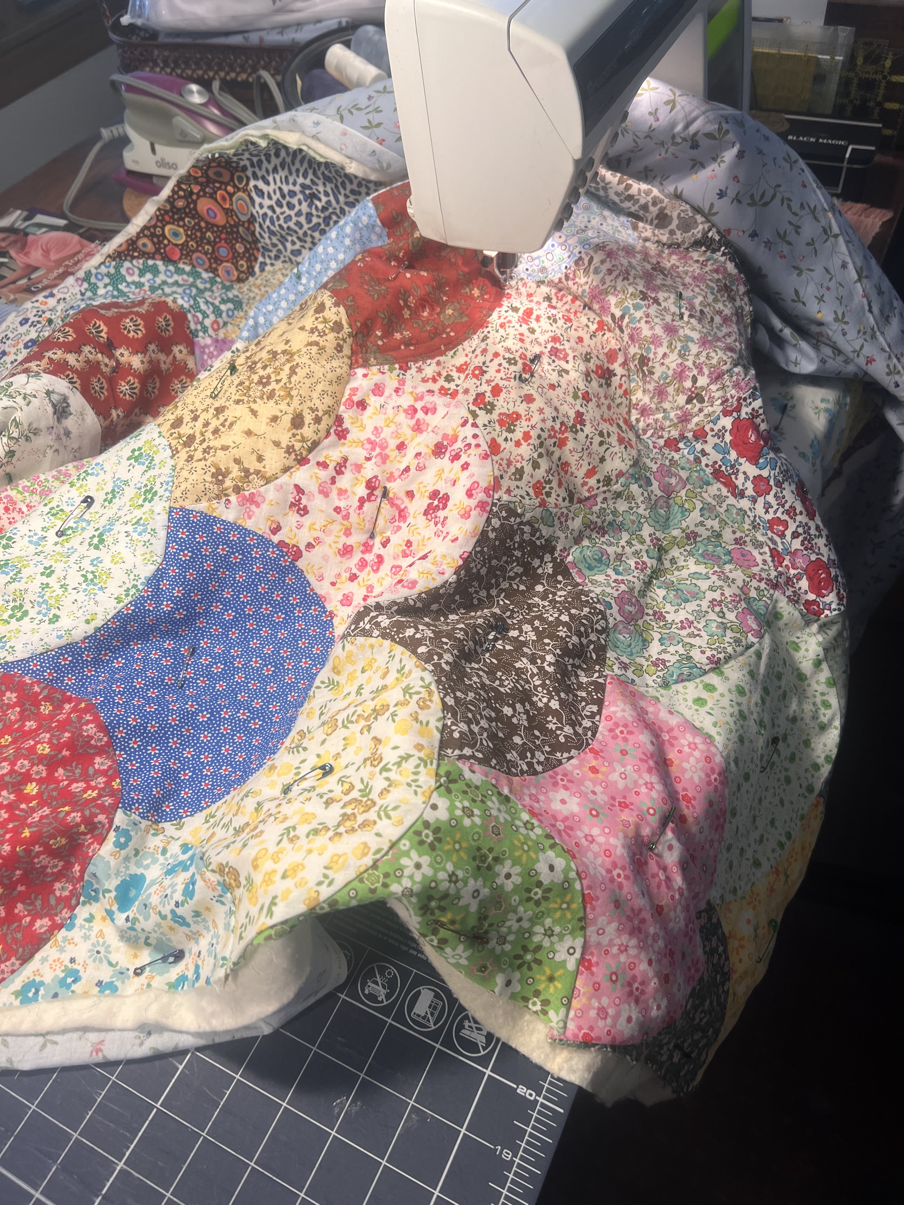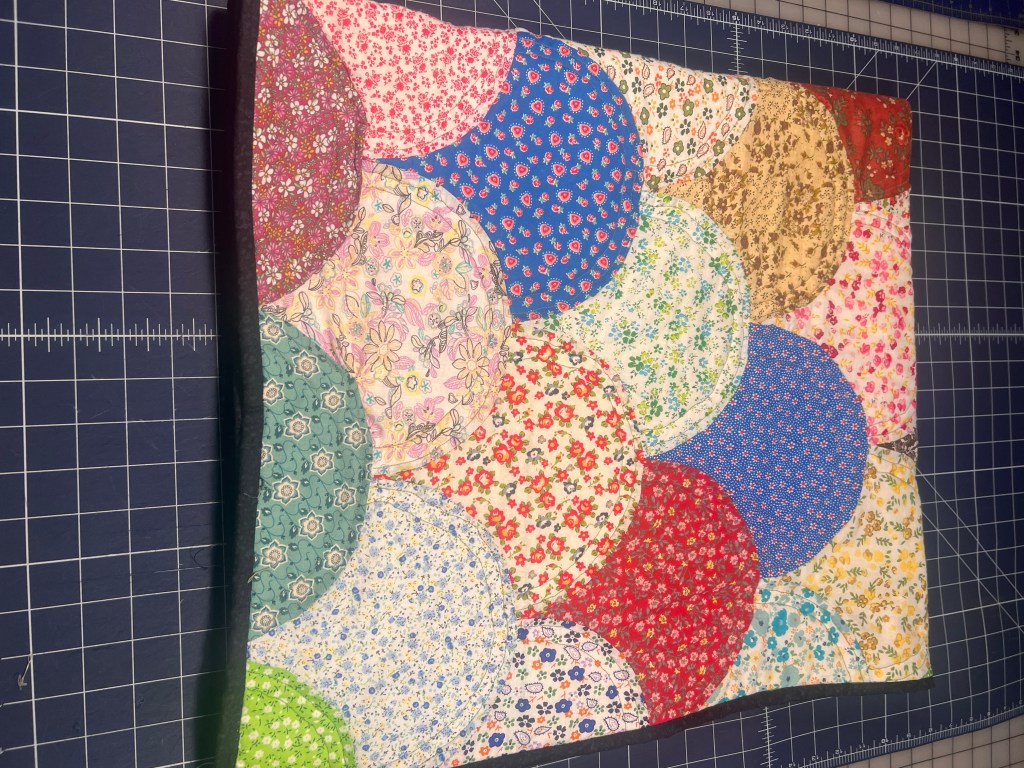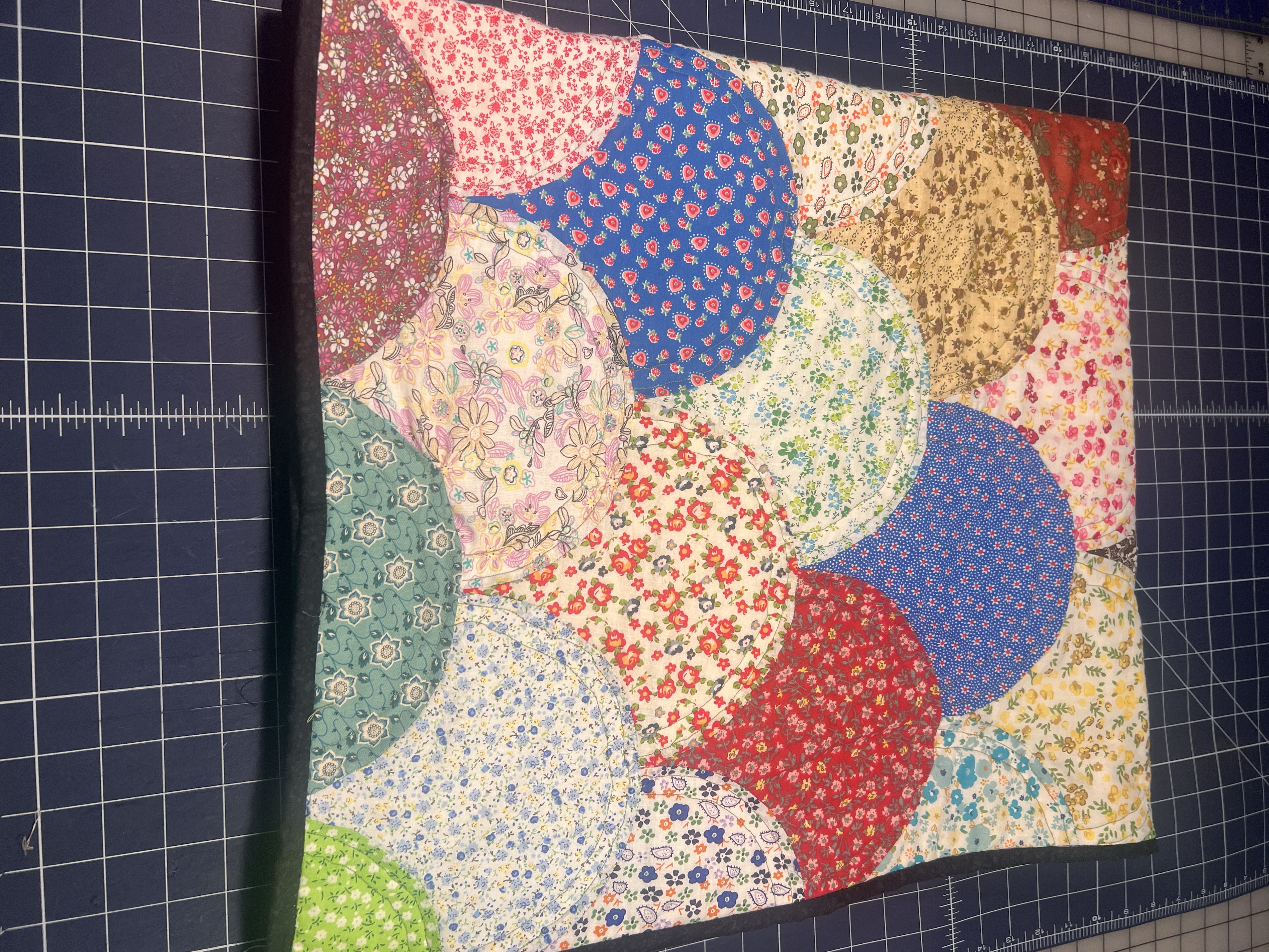 This quilt was created with a bundle of 10″ calico squares, and an Accuquilt Clamshell die, making precise point matching possible. It was a real challenge with curved quilting, and sharp points. A soft blue print is the backing, and narrow black binding finished it off. A charming child’s quilt.