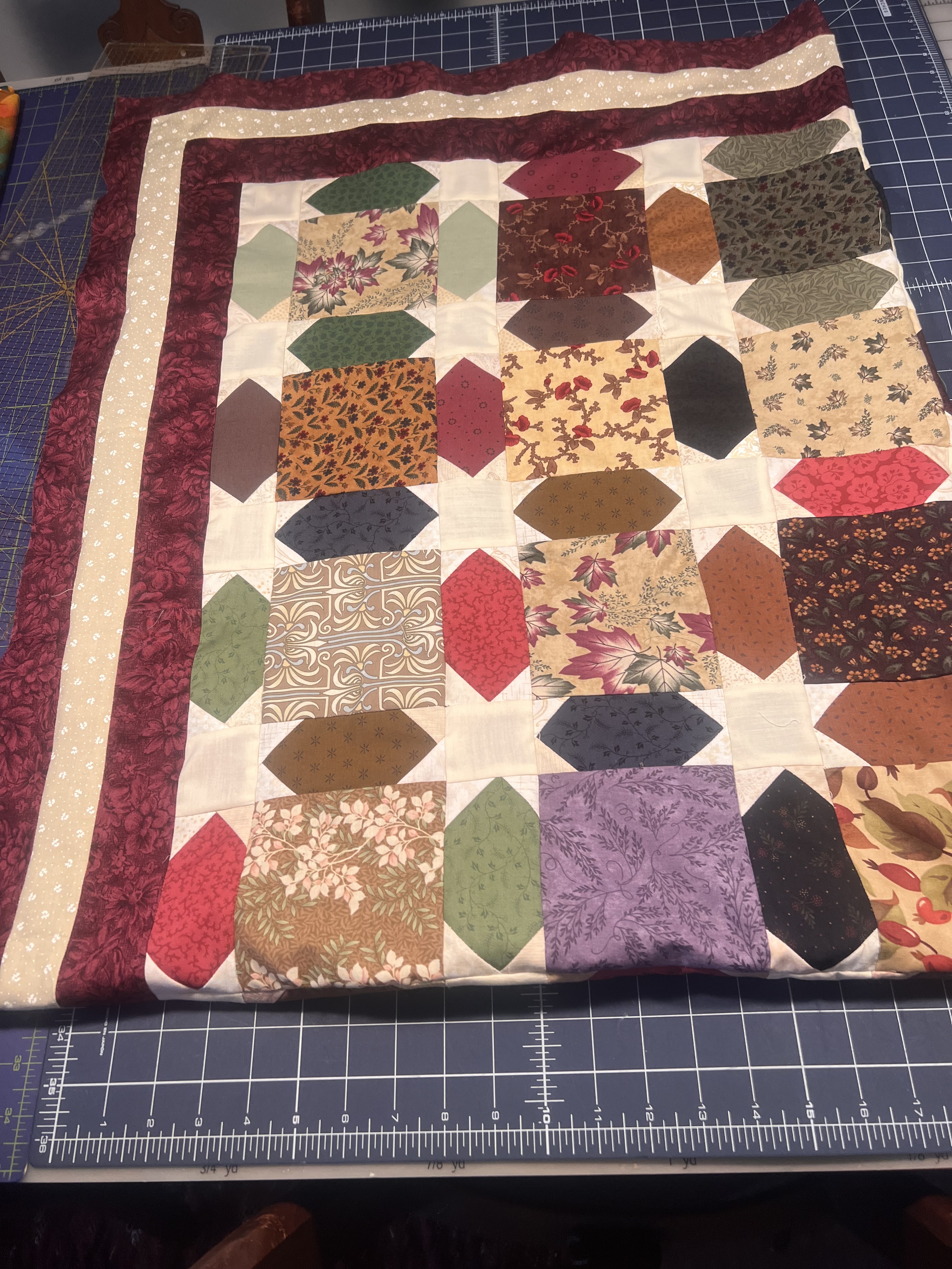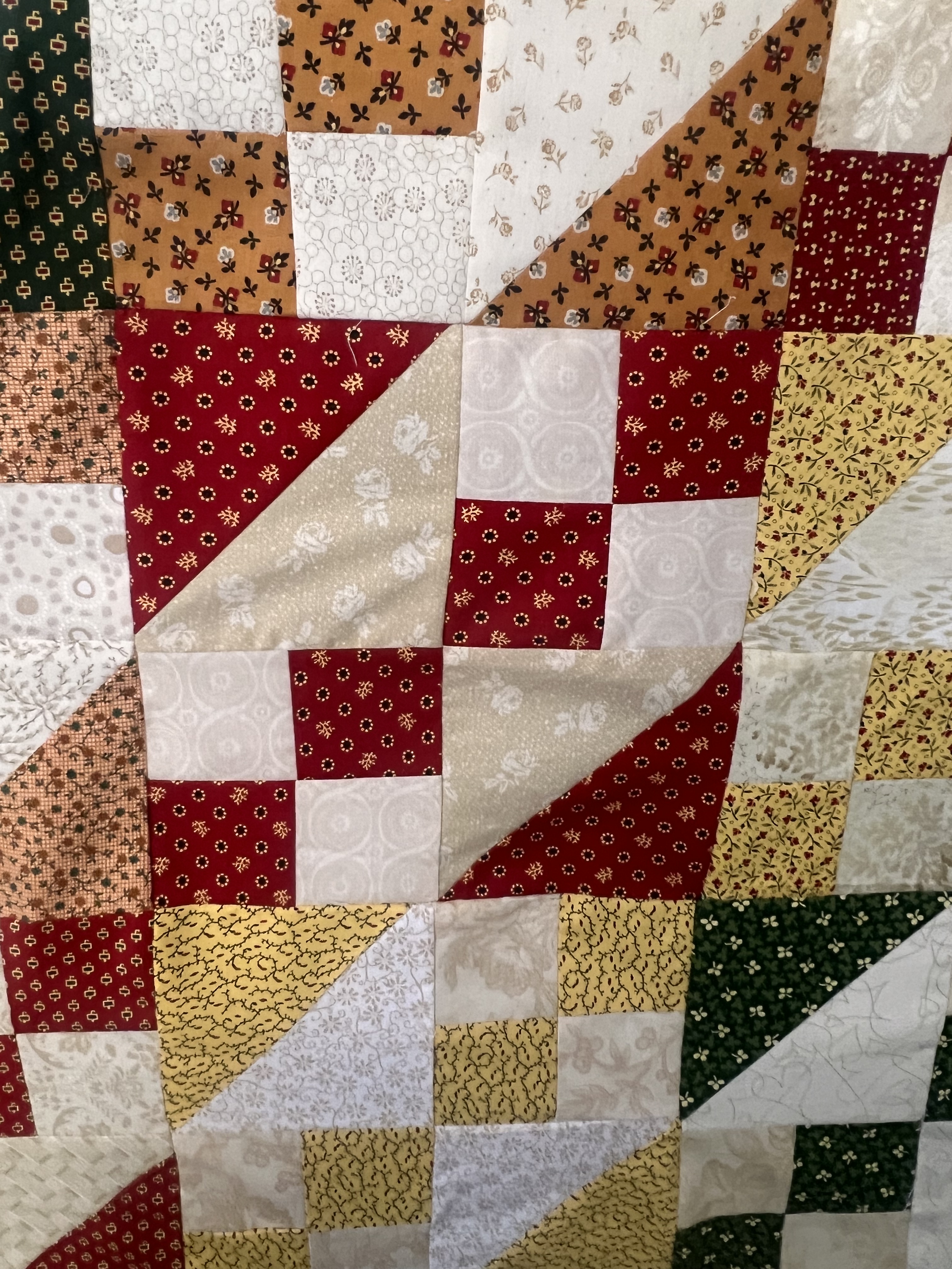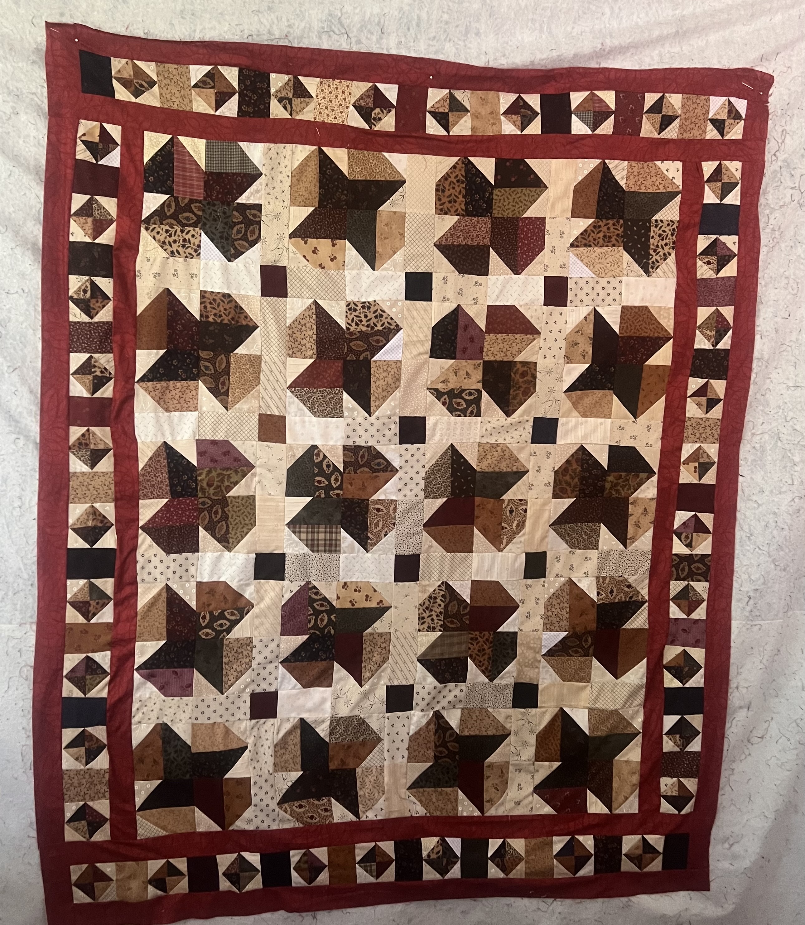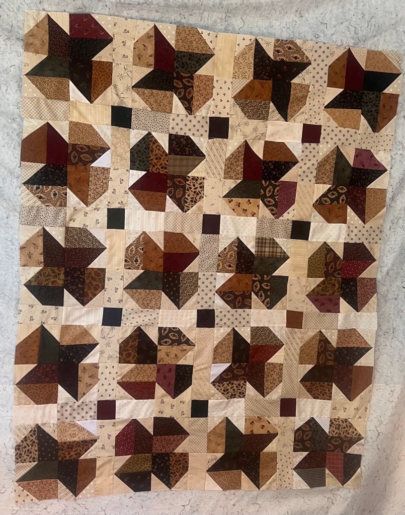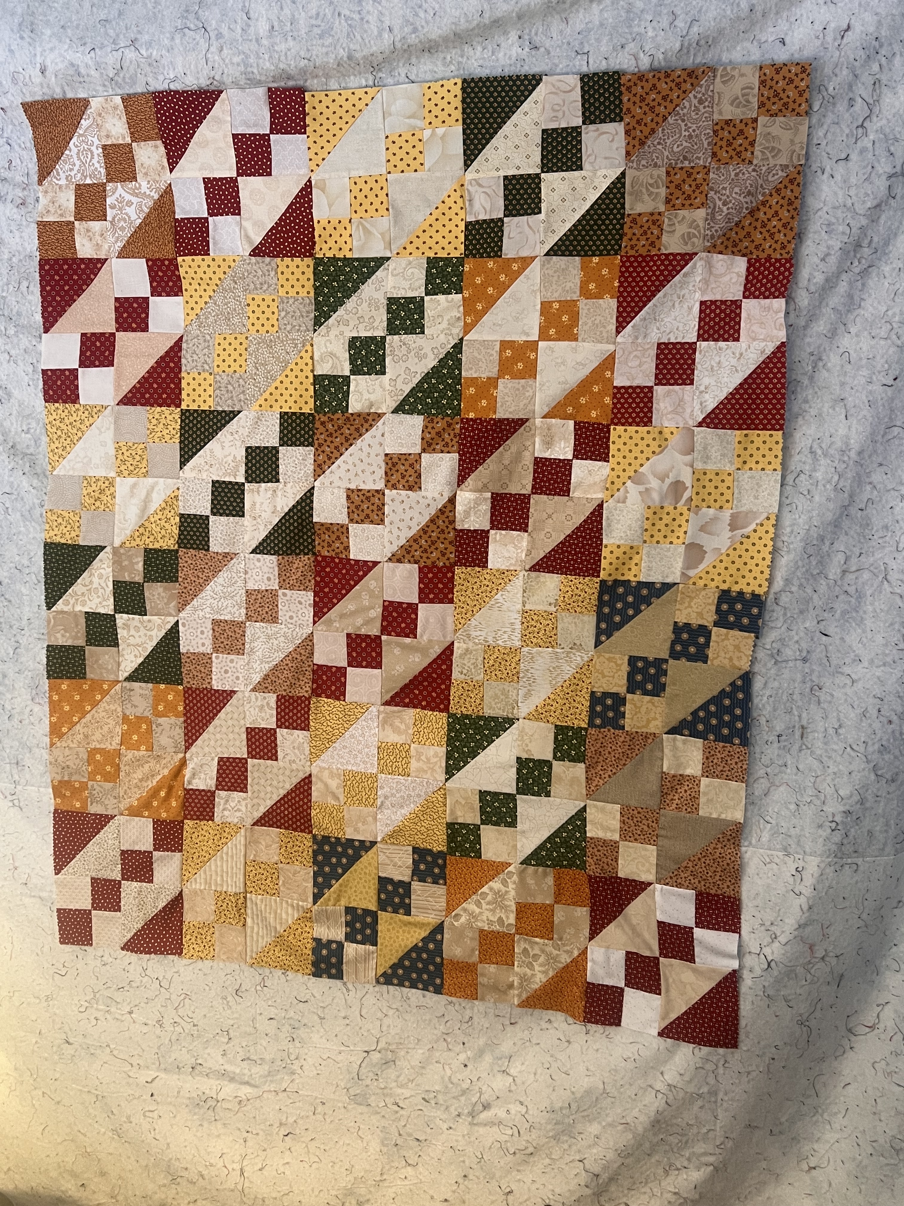 To continue my “stash depletion” quest, I embarked on my third charm-pack quilt. Using earthy colors disbursed with many cream prints, these simple blocks came together quickly. I used all the small bits left over to create quad units to be used in the border. I introduced a muted red to give some pizzaz to an otherwide mild earthy quilt.