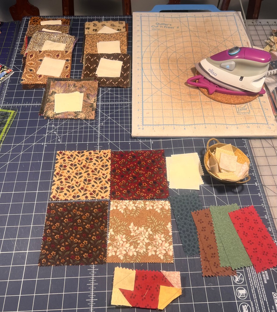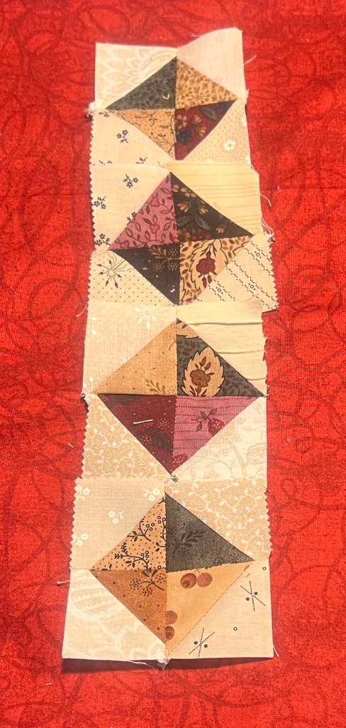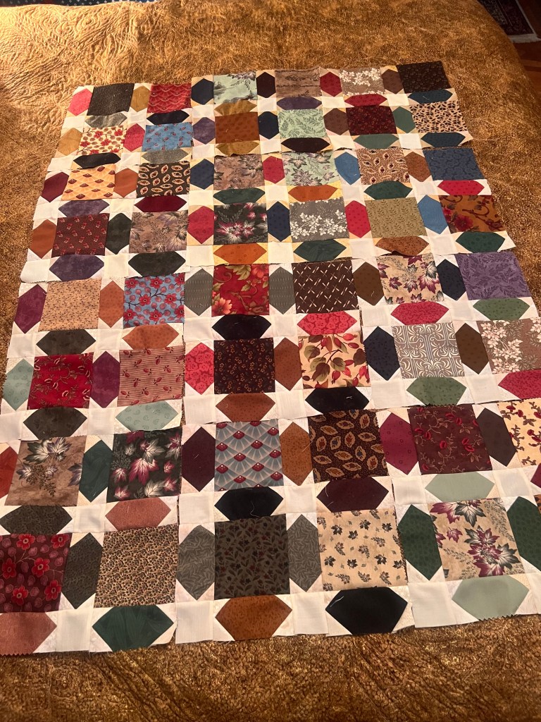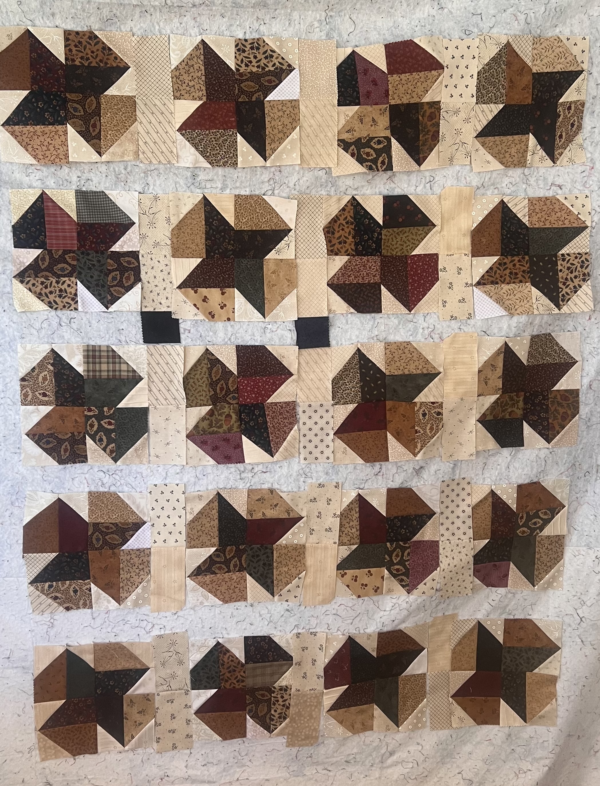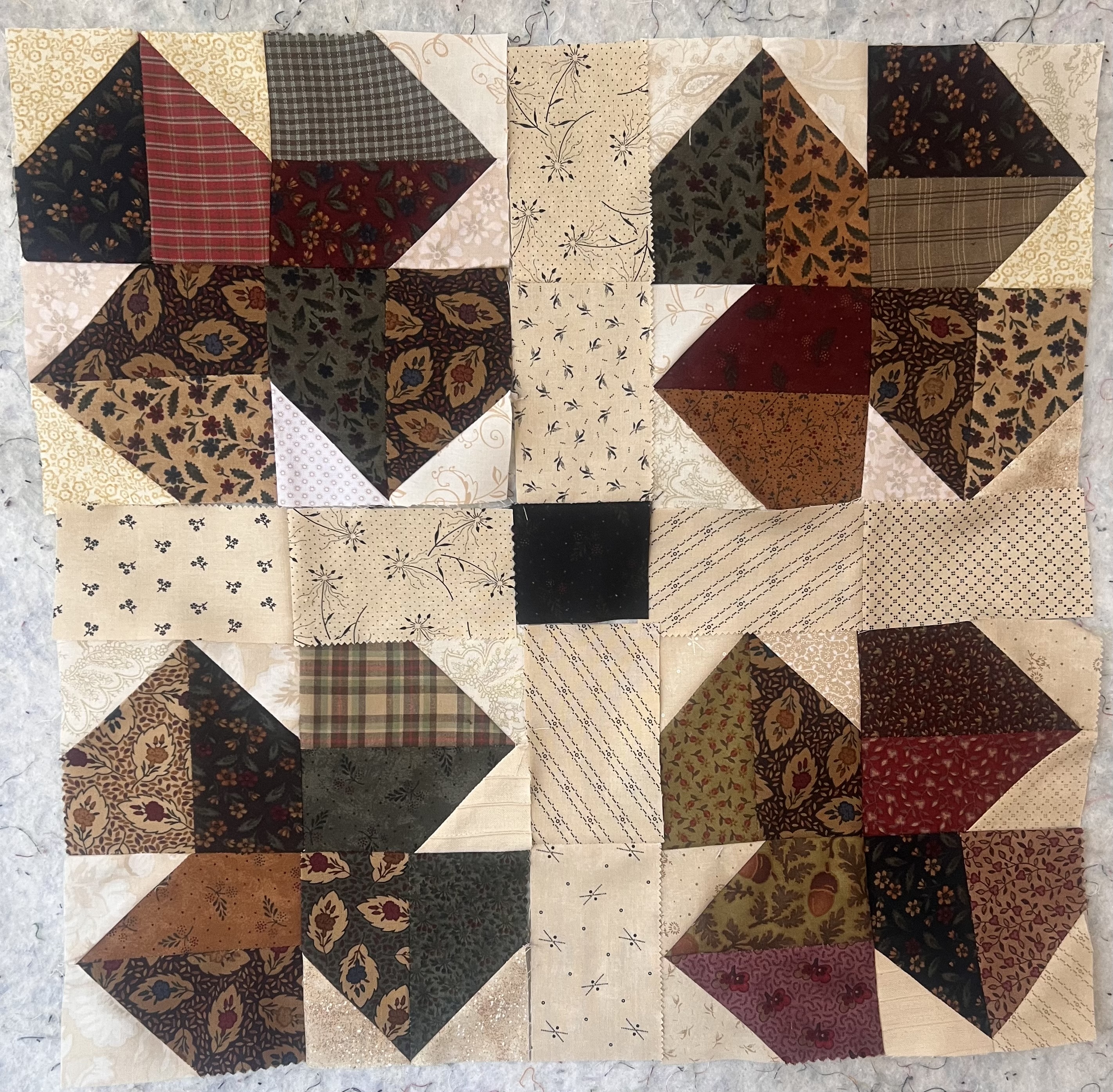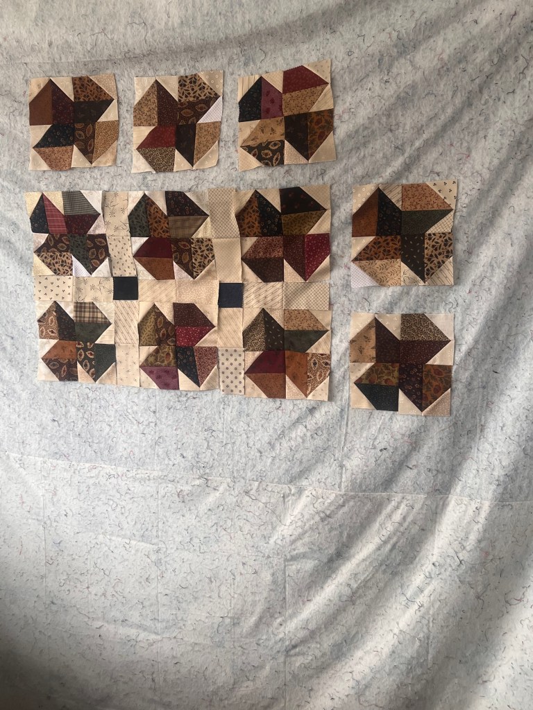 To continue my “stash depletion” quest, I embarked on my third charm-pack quilt. Using earthy colors disbursed with many cream prints, these simple blocks came together quickly. I used all the small bits left over to create quad units to be used in the border. I introduced a muted red to give some pizzaz to an otherwide mild earthy quilt.