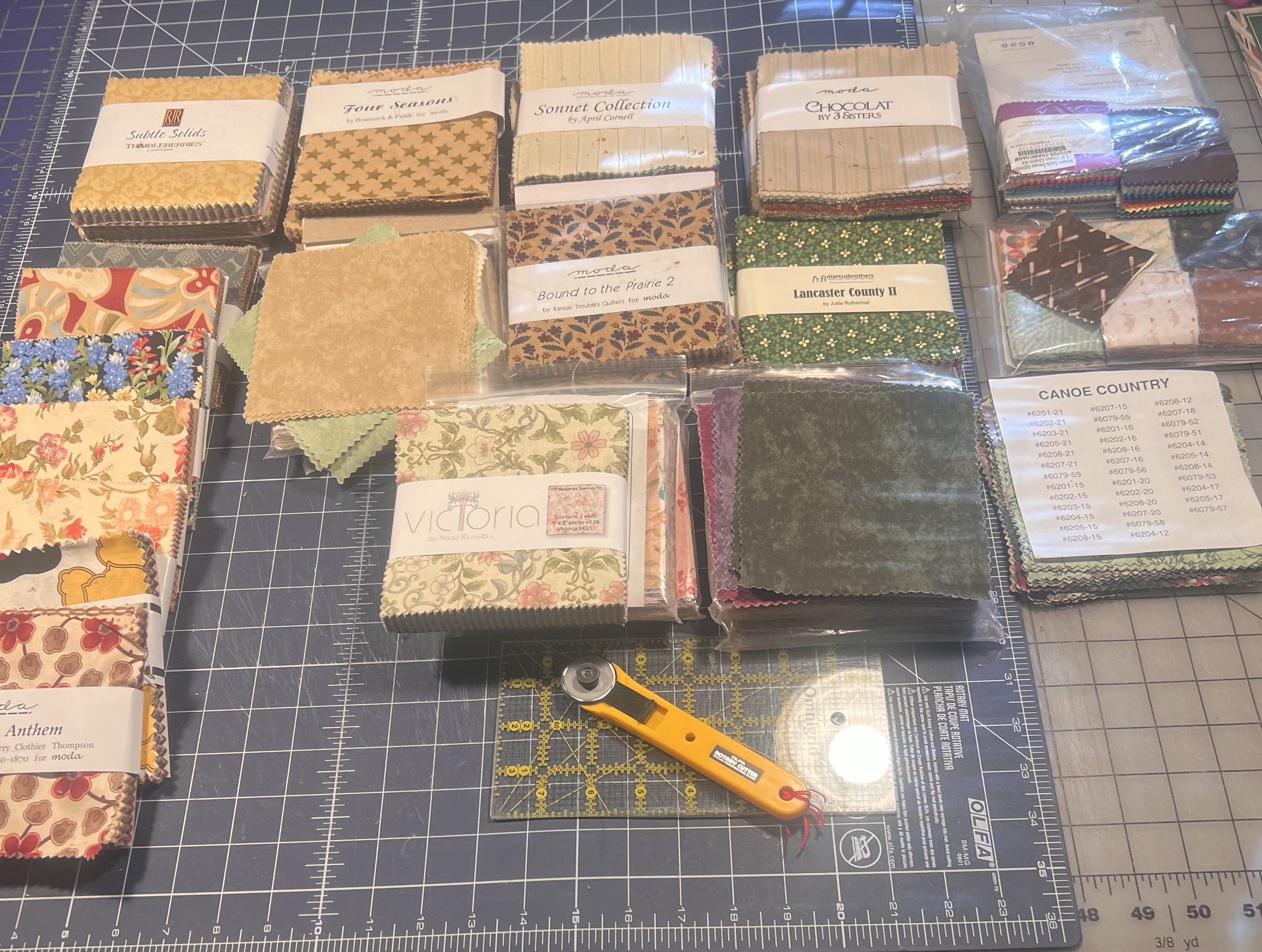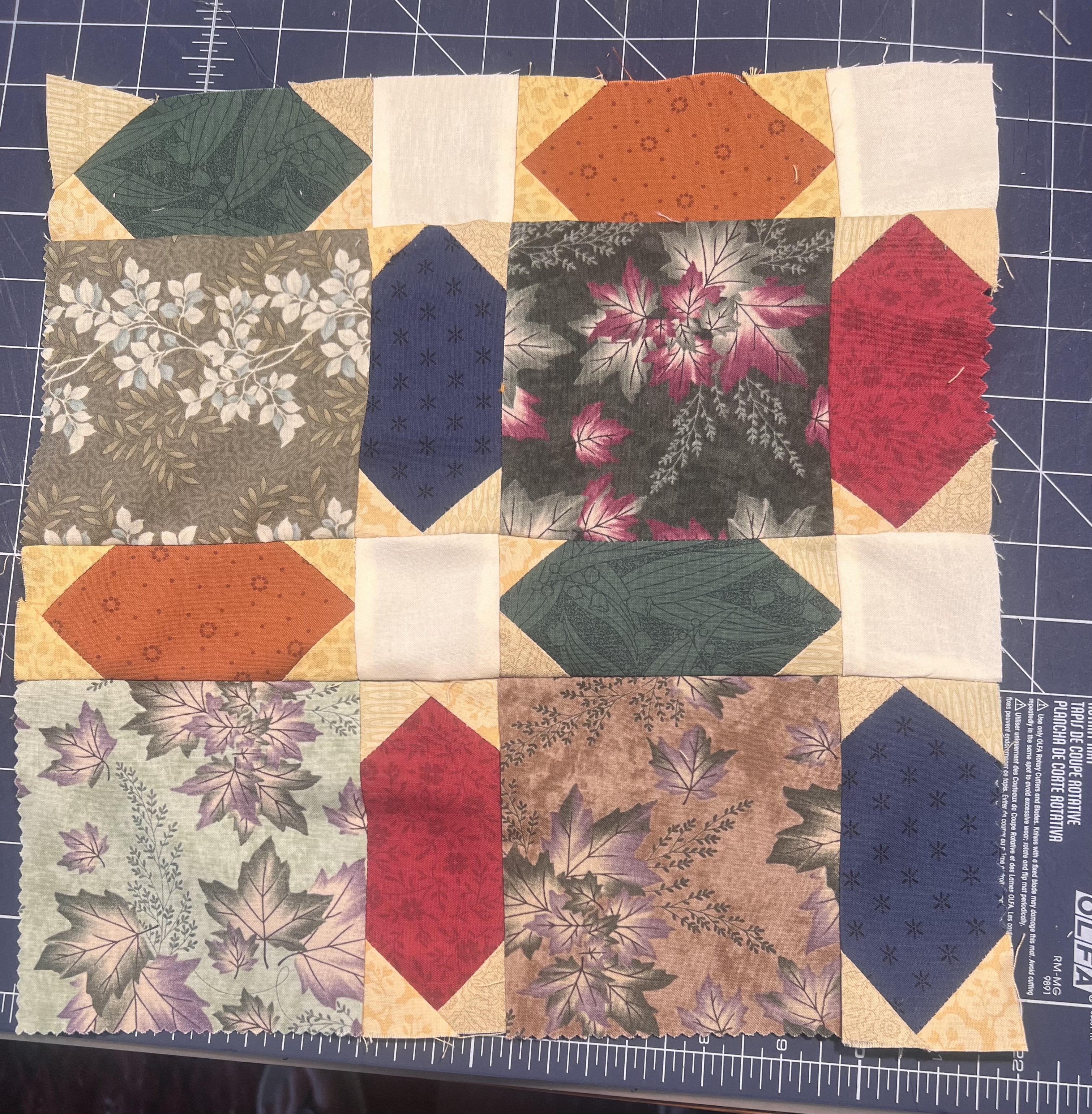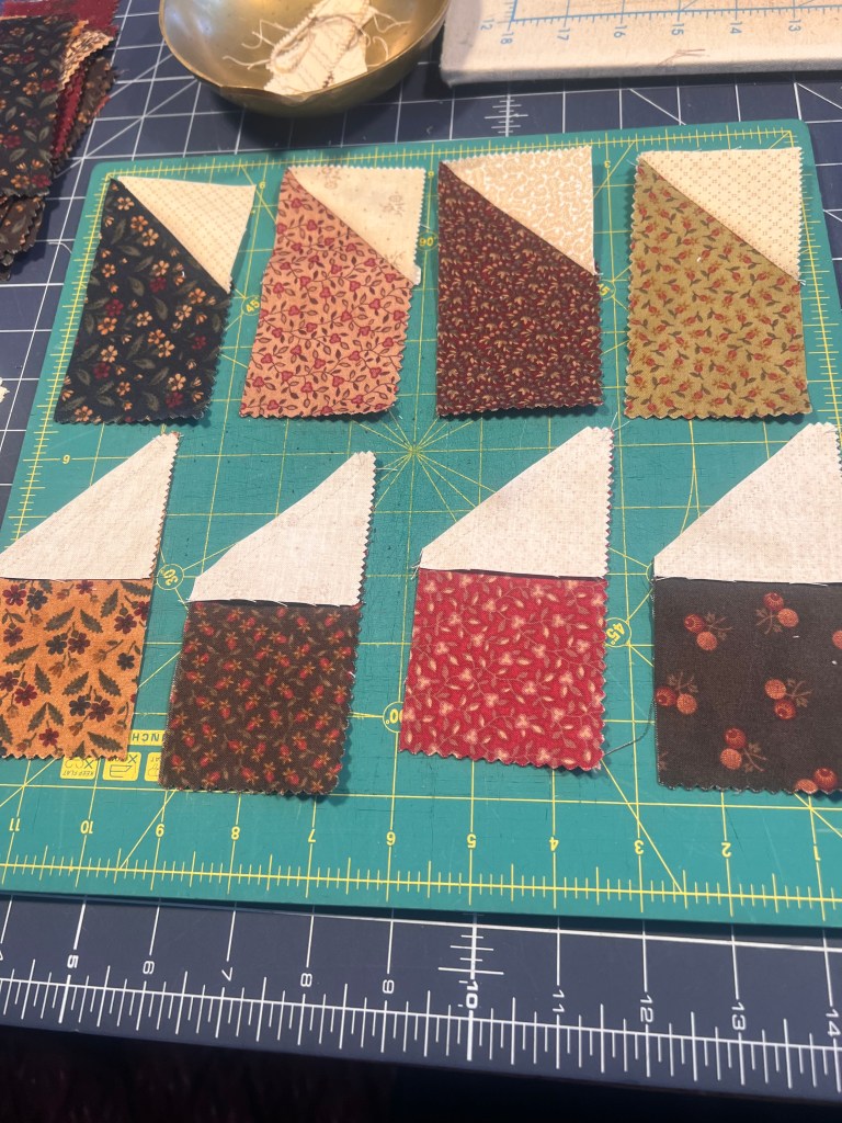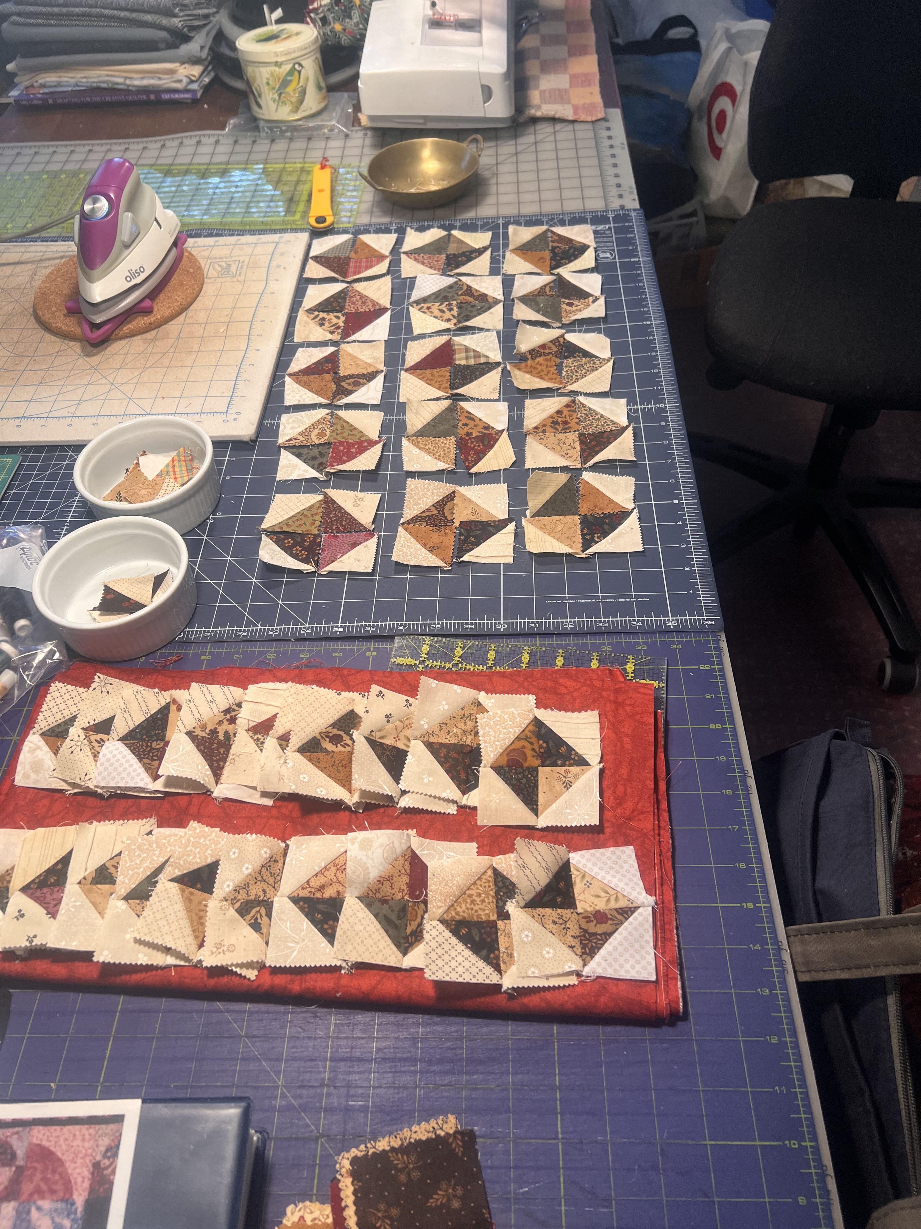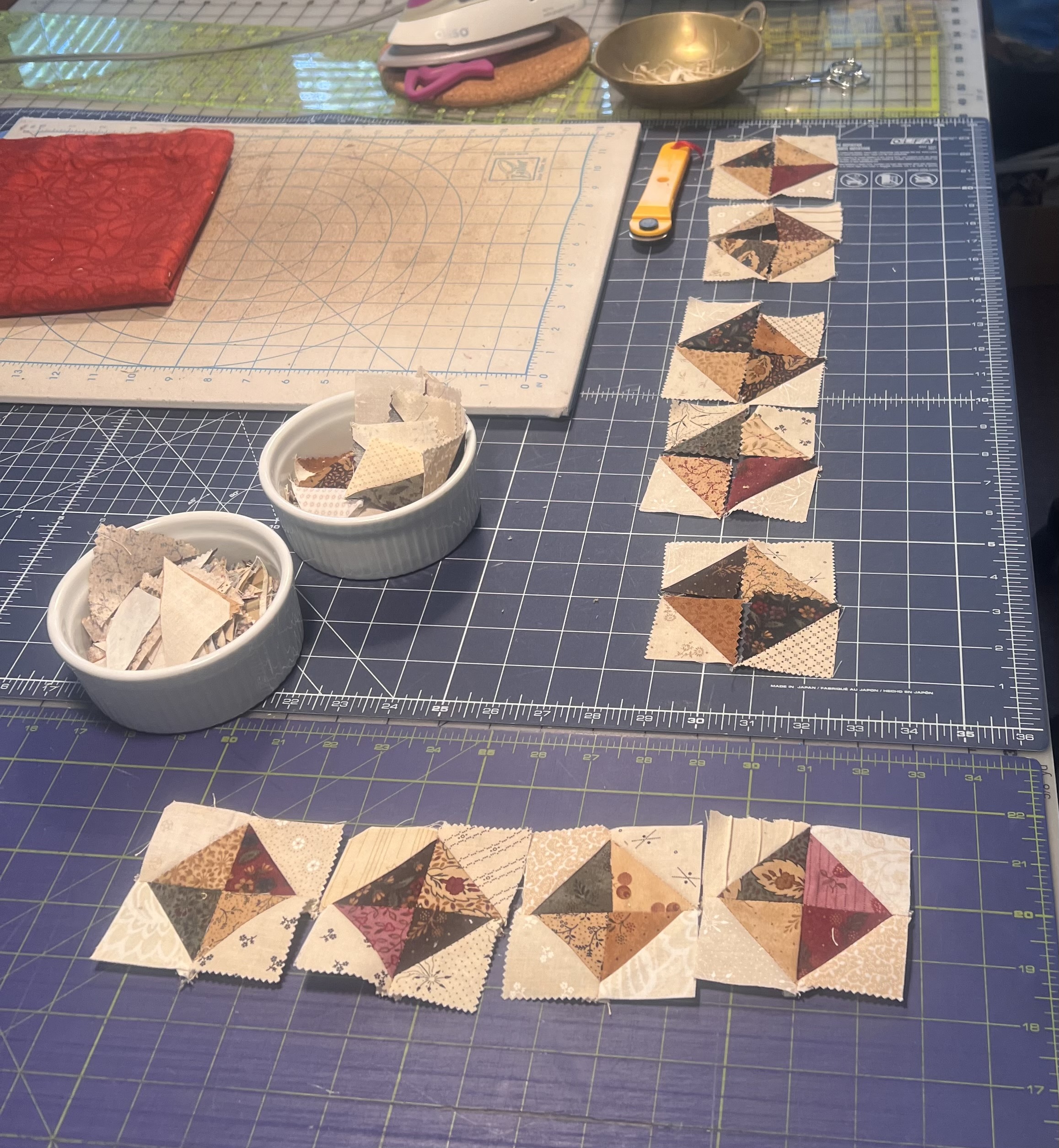 To continue my “stash depletion” quest, I embarked on my third charm-pack quilt. Using earthy colors disbursed with many cream prints, these simple blocks came together quickly. I used all the small bits left over to create quad units to be used in the border. I introduced a muted red to give some pizzaz to an otherwide mild earthy quilt.
