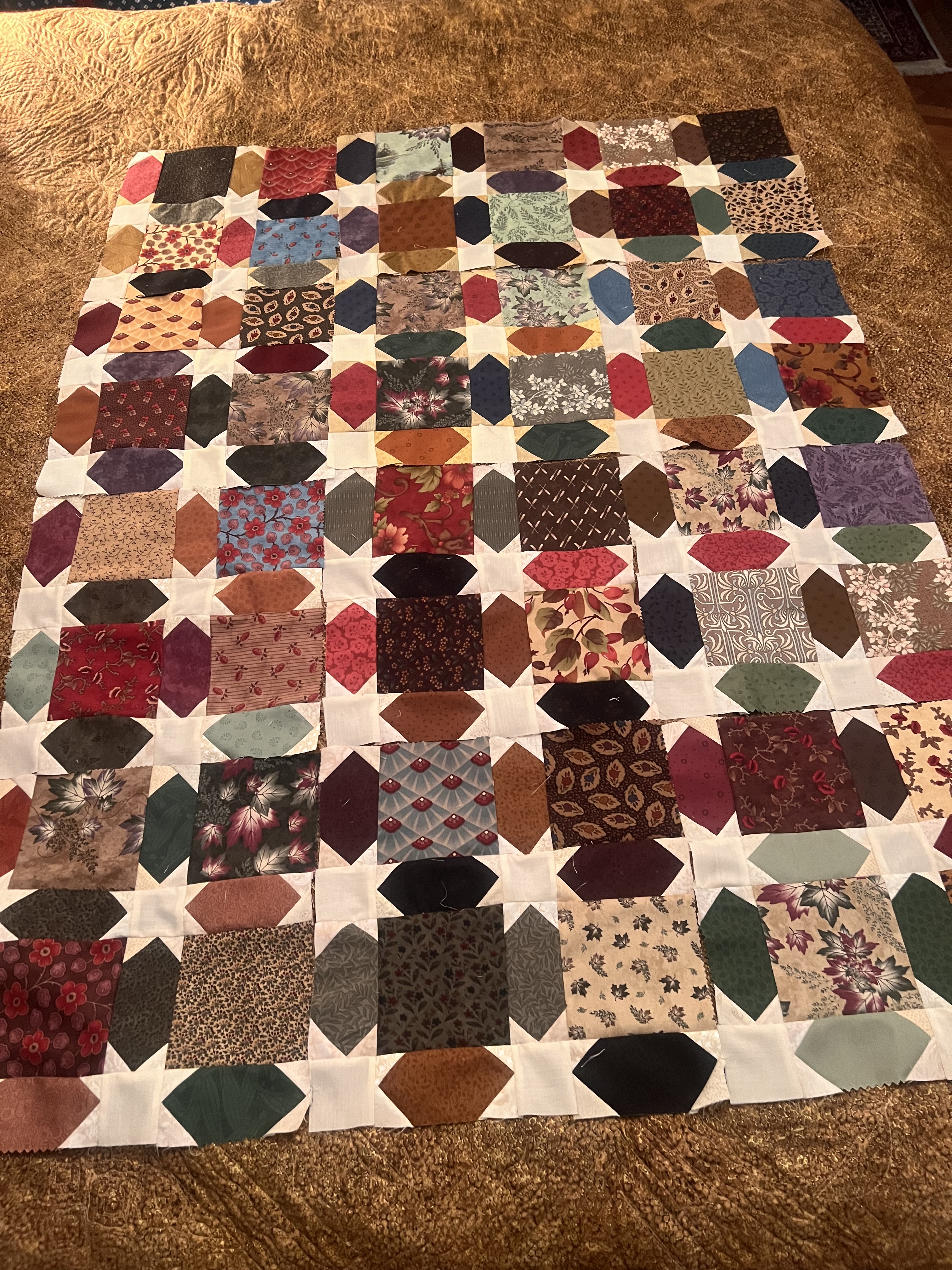 I began this quilt in an effort to depleat my enormous stash of fabrics by starting with all of my charm packs. Using many colors and contrasting creames, I used whole, halves, quarters, and eighths of those five-inch wonders to create this colorful and traditional quilt. Those stars just pop!