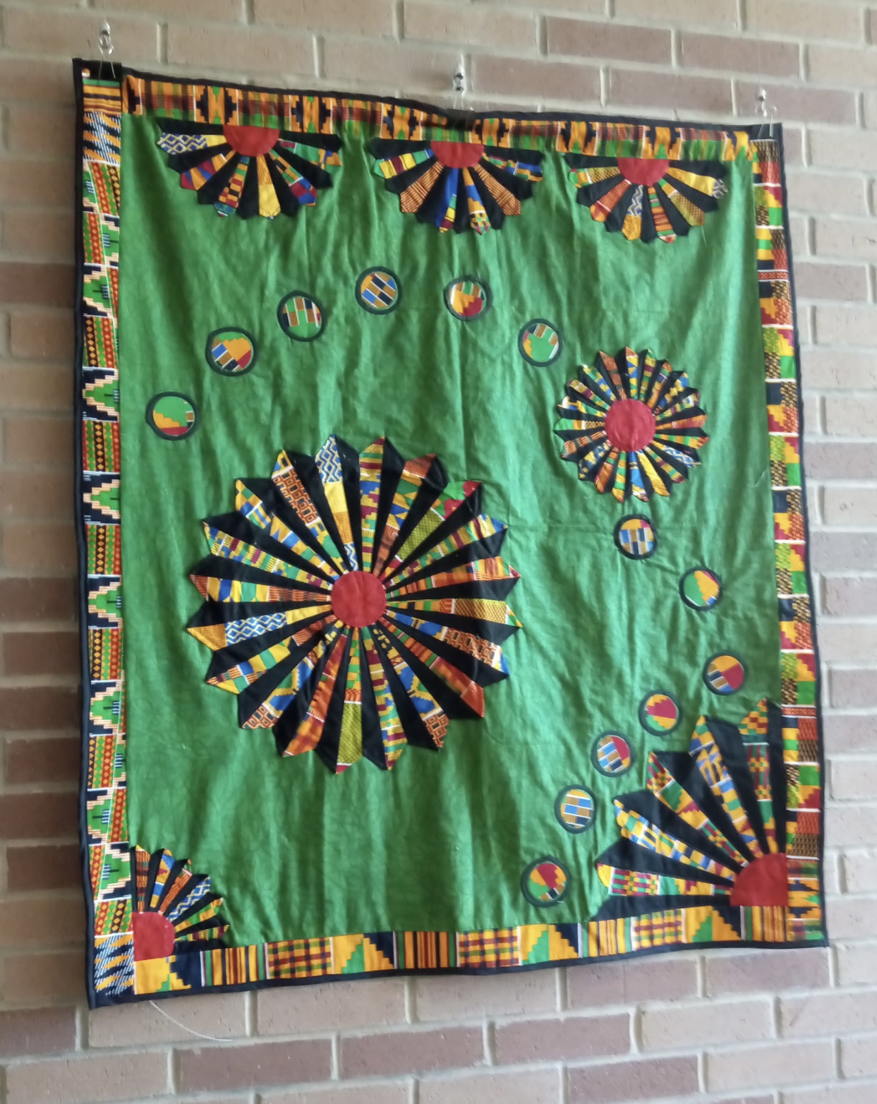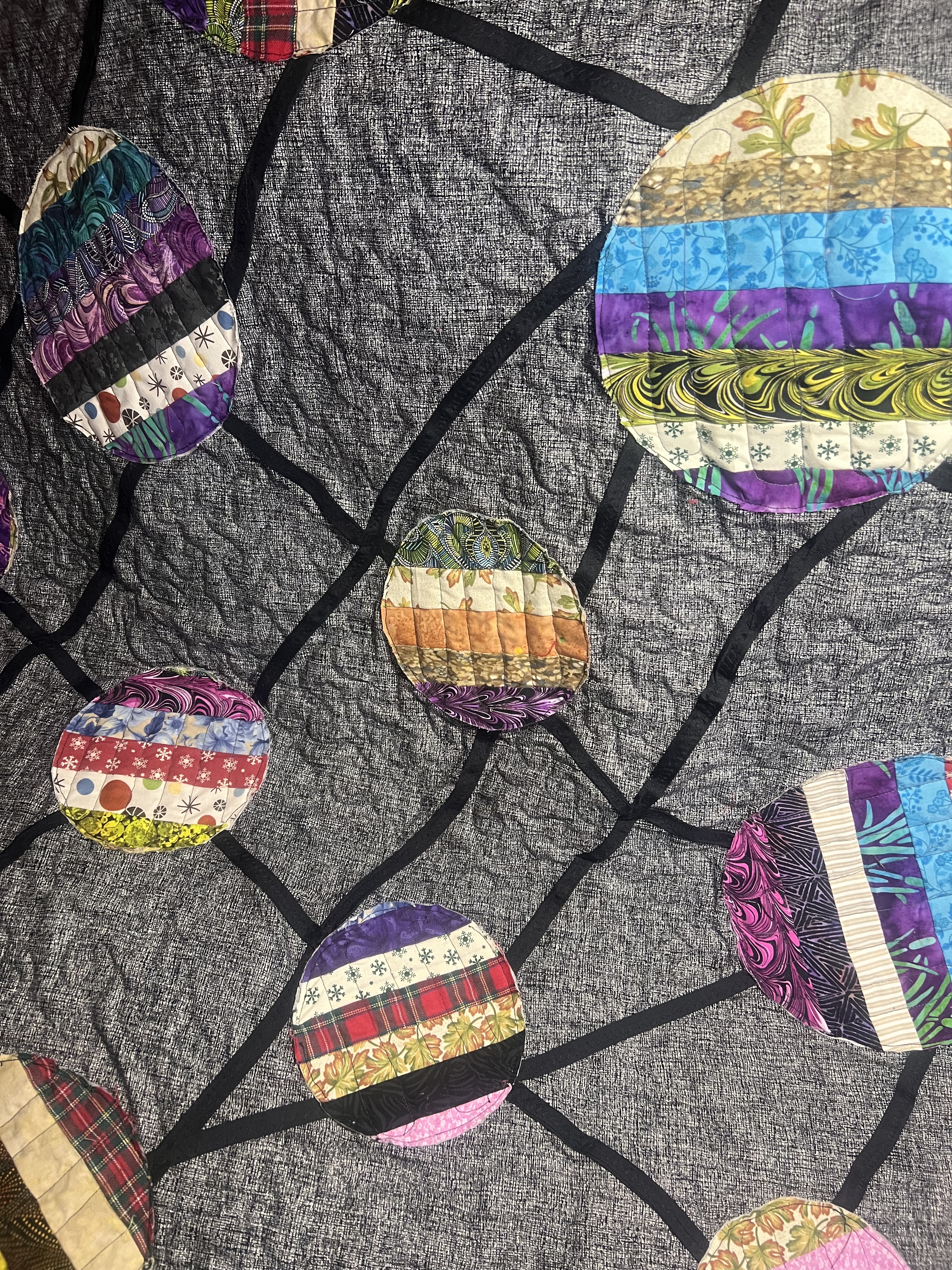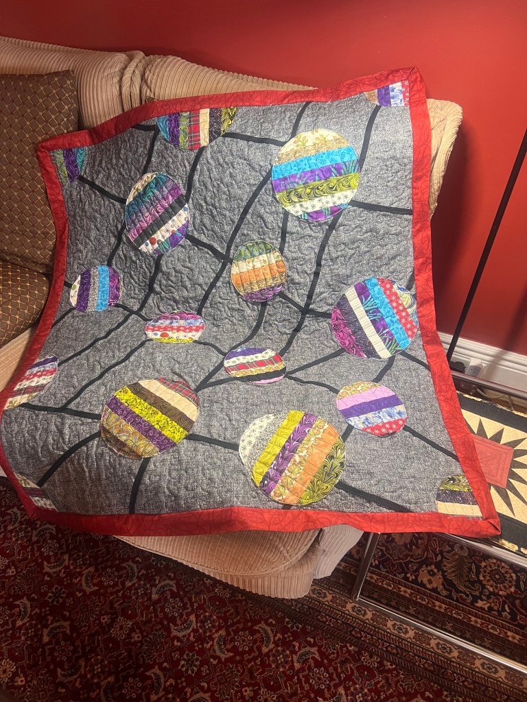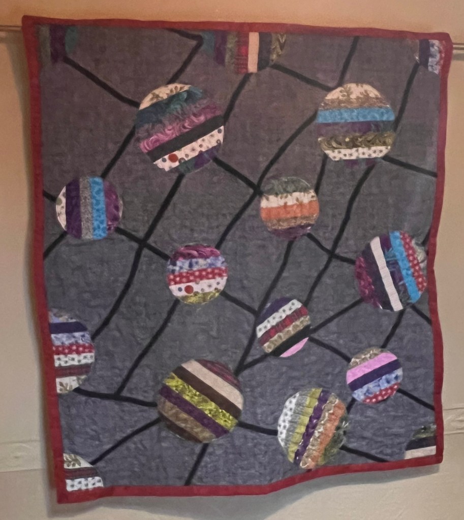 The concept for this quilt came from a package of coffee filters. I ironed them flat, and dumped my scrap bag on the table, and began sewing the strips onto the filters. The filters are practically indestructable, so worked as a strong foundation. After making a dozen or so, I had to decide what to do with them. I tried many backgrounds and settled on a medium grey all-over, but it needed something to pull it all together. So I used my large roll of black bias binding and laid out lines in all directions, and sewed them down. I arranged the circles for balance and color distribution, cut a few down to a smaller size, cut some halves and quarters, and after a few tries, said ‘There!” I stitched them down in raw-edge appliqué, quilted them across the strips, and free motion quilted in all the open spaces. It is a rustic and fun quilt.