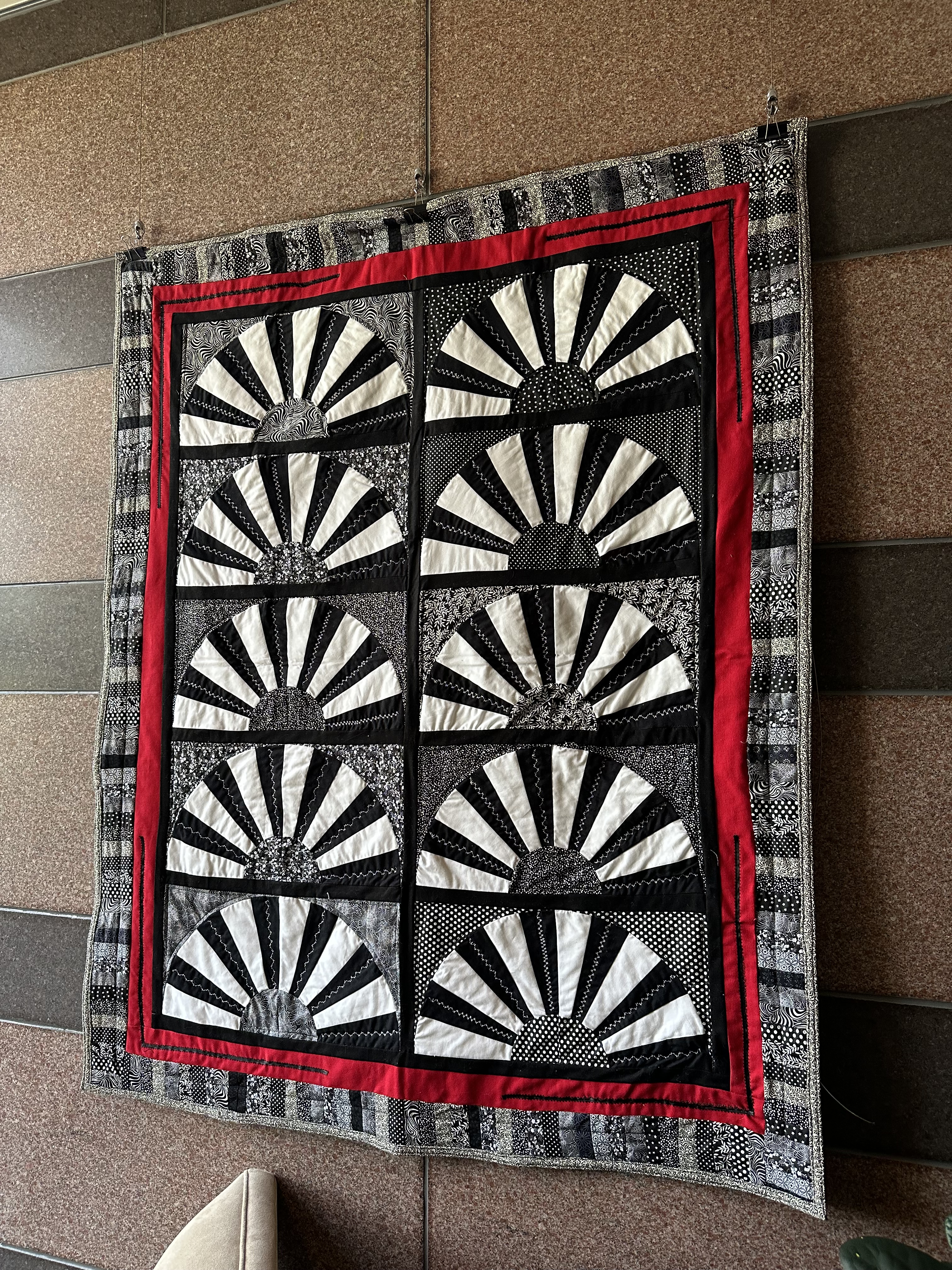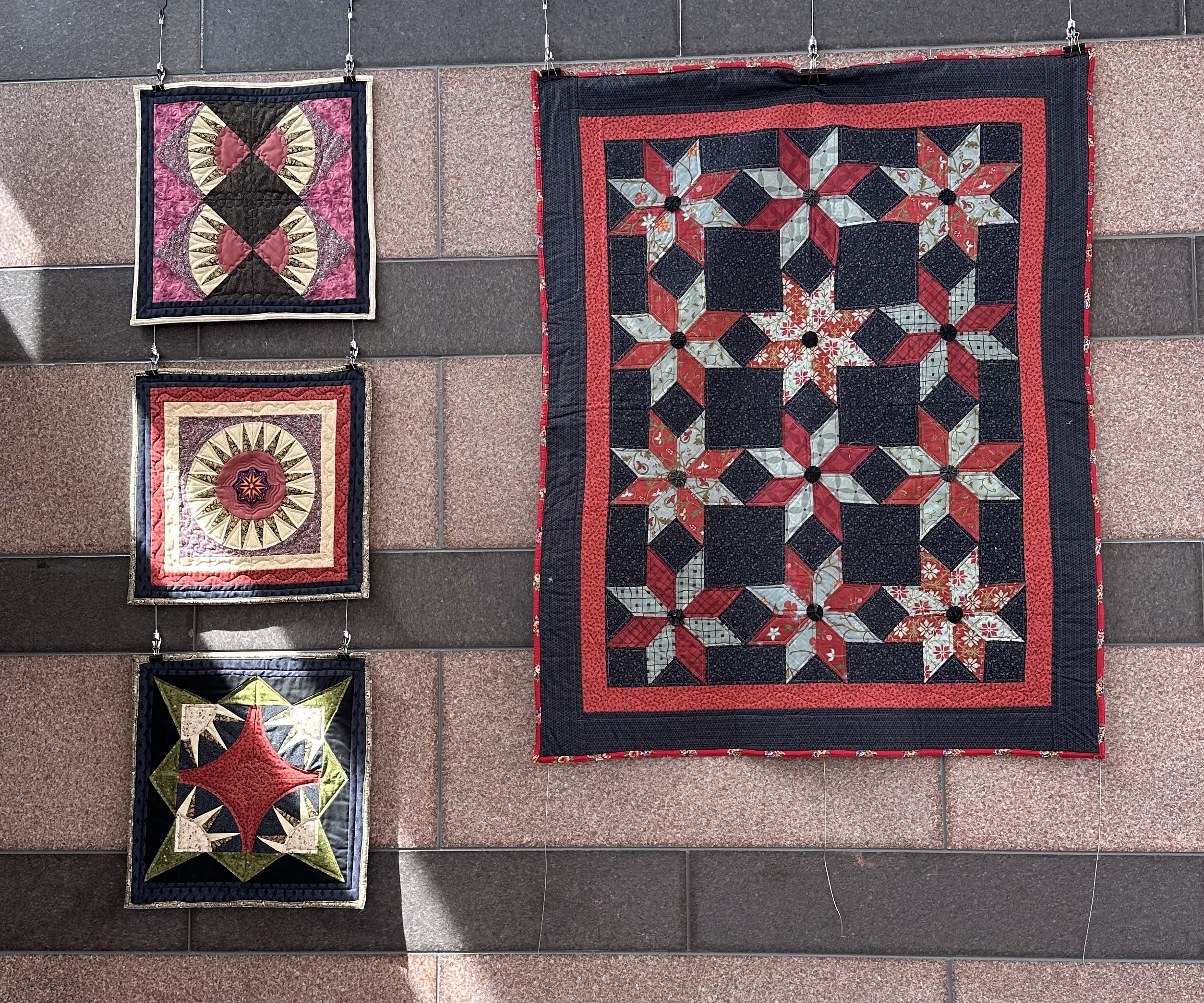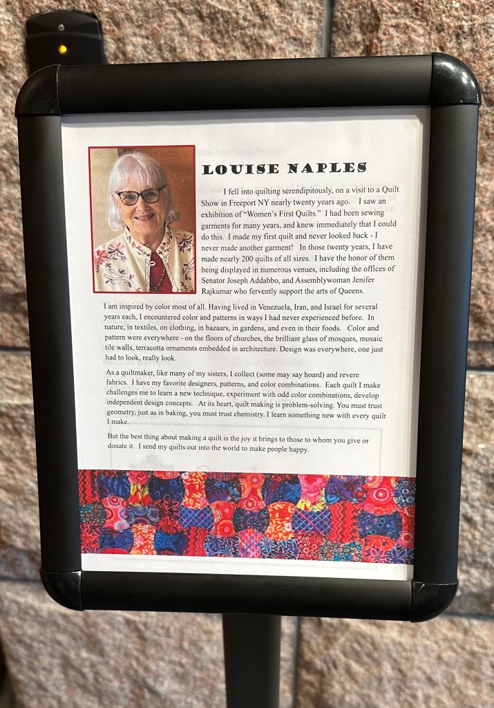 I was honored to be invited to have a month-long exhibition of my art quilts at the Center at Maple Grove, in Kew Gardens, NY during April 2025. The venue is modern, spacious, and well lit with natural and incandescent light. I had lots of help mounting the twenty-five quilts: my daughter Larisa and her family from California, local artist friend Jennifer Lambert, Jennifer Hayes, and Helen Day and Carl Bellinas of the Center. Here are some photos of the exhibit!