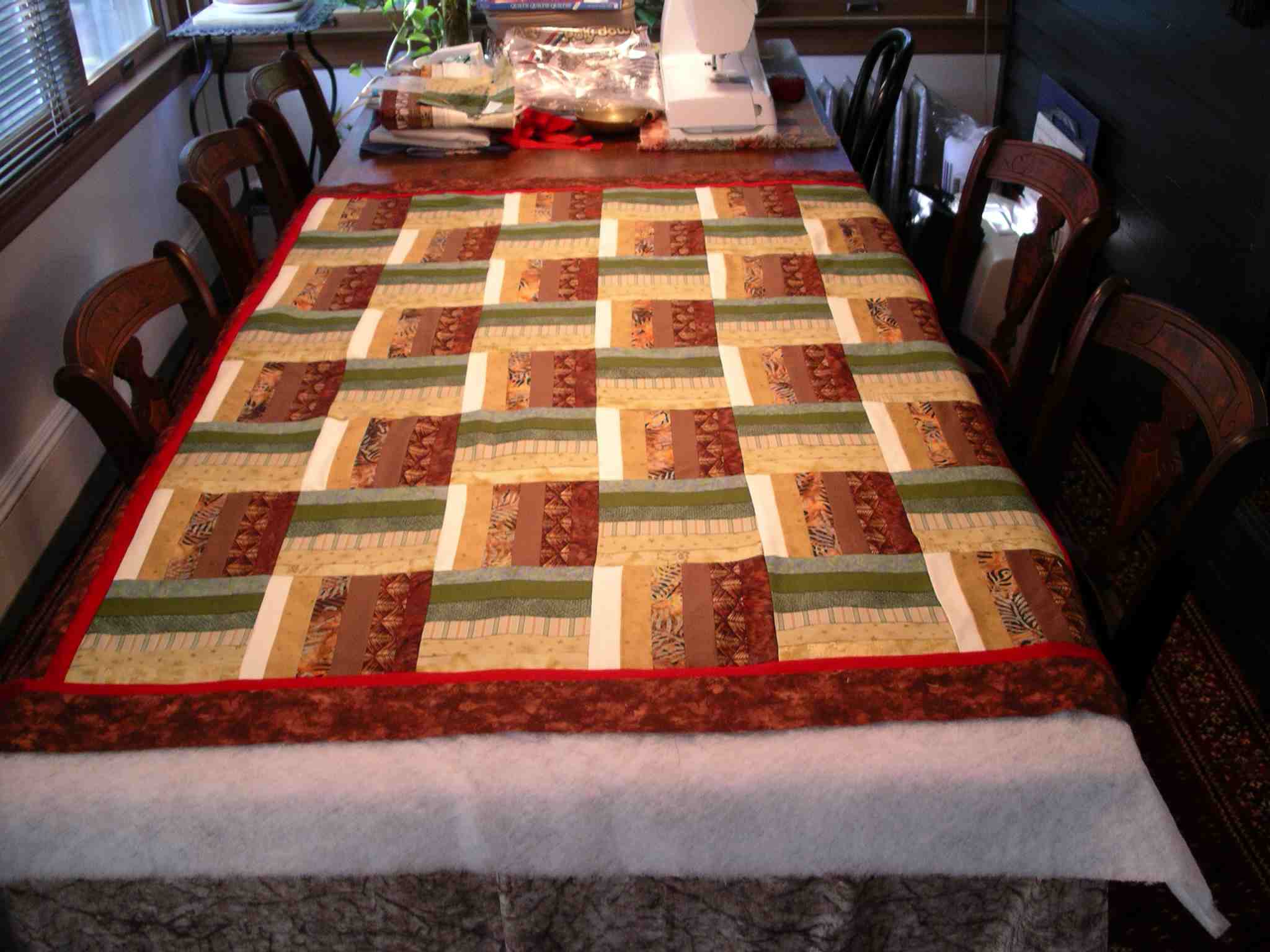 Leave about five inches of backing fabric and batting overage on all sides of quilt. I machine quilted this with decorative stitches inside all the solid colors used in the top.