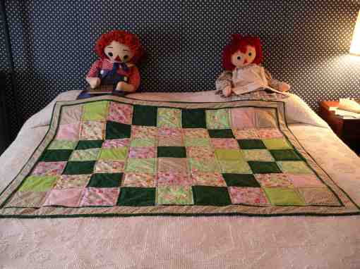 This is a portrait of the completed quilt. It has a luscious, soft look and feel, perfect for a little girl.