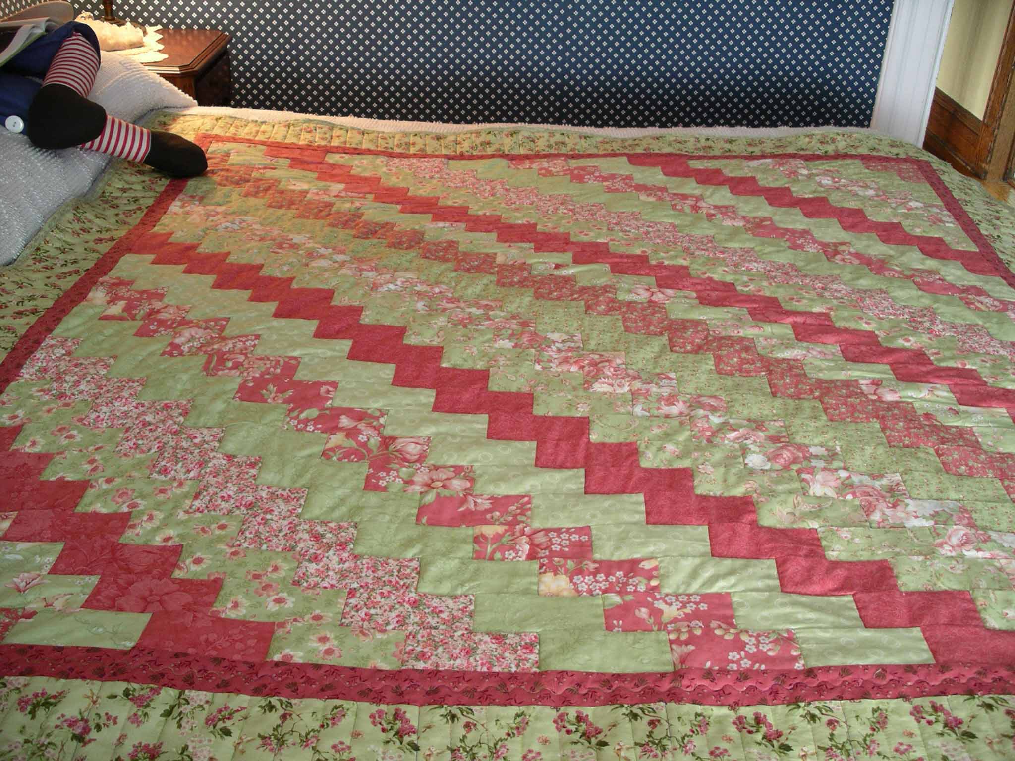 This was stitch-in-the-ditch quilted along the zig-zag lines. A coordinating color in mint greet with tiny tea roses completes the top.