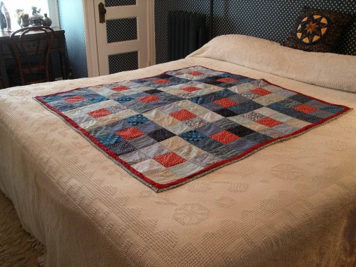 Laying the quilt on a king size bed shows the scale – crib size or up to a junior bed size.