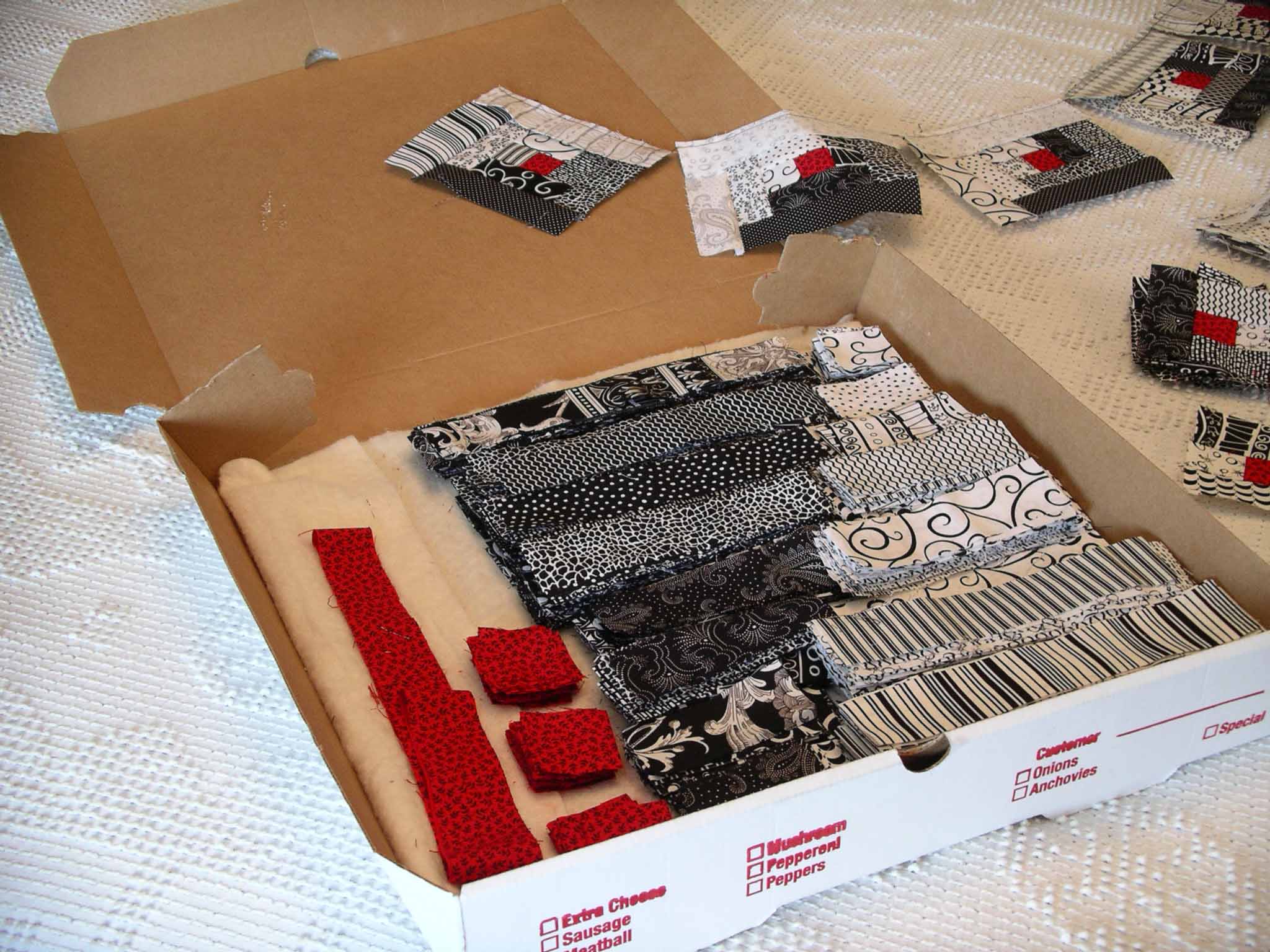 Lining the strips up according to size in a pizza box helps keep them organized, and helps me to know what comes next.