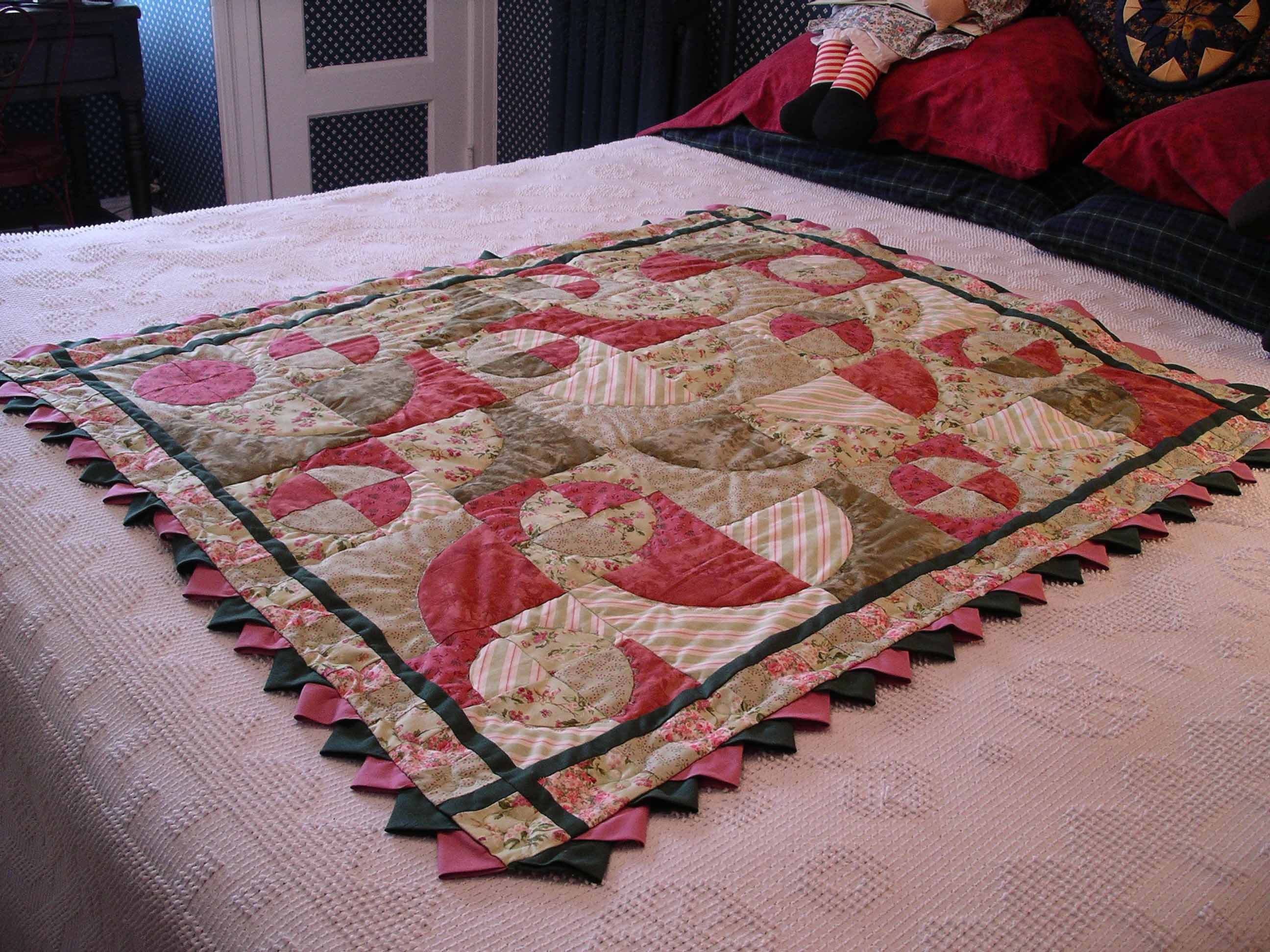 This was a baby gift in sweet girl colors of pink and green. The curved blocks are from the classic drunkard’s path.