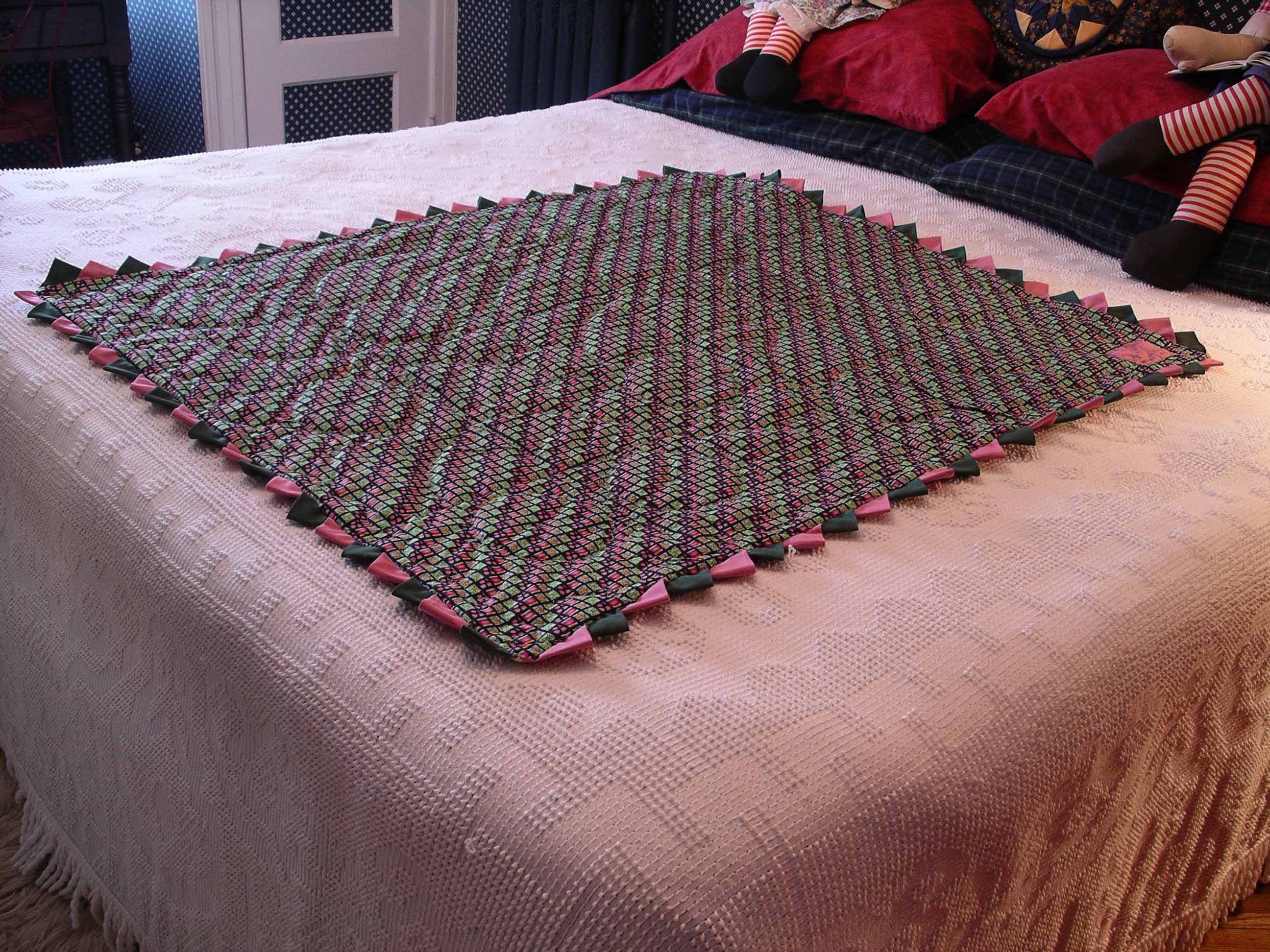 A daring choice of a black print with pink and green. This quilt can be placed on the floor or lawn with no anxiety!