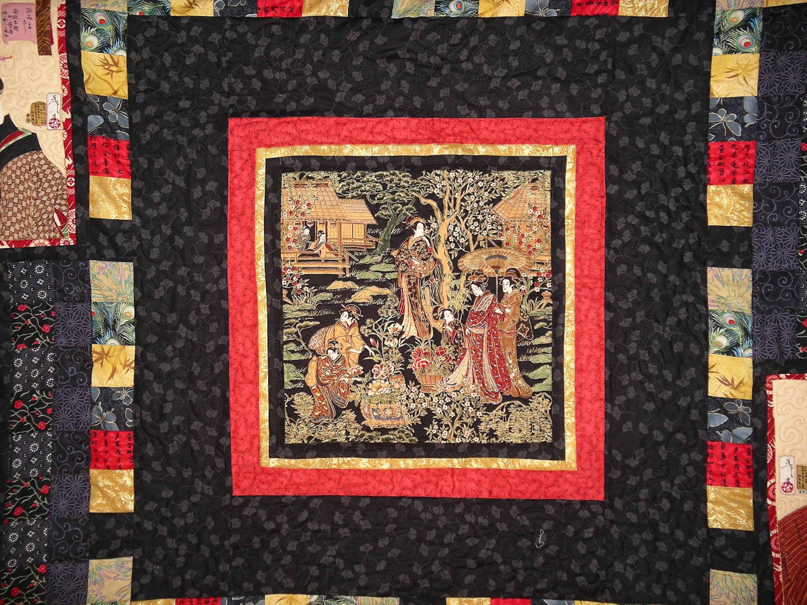 The center panel depicts a garden with elegantly attired nobles. I framed it with black, metallic gold, and red set against a field of black.