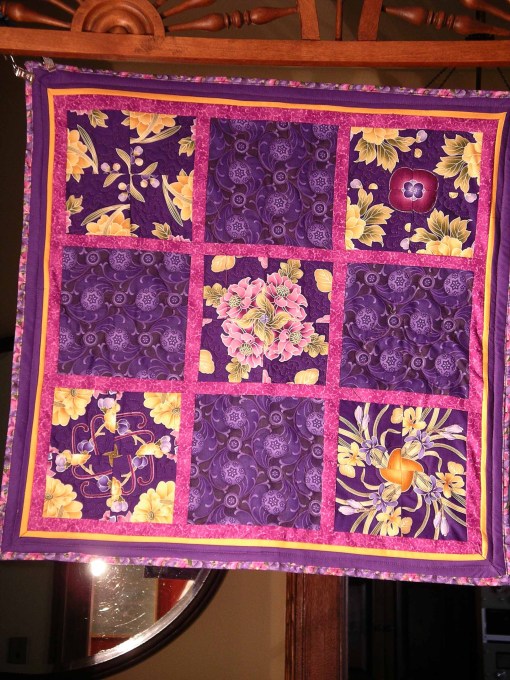 A sweet feminine wall hanging, or table top piece in pinks and purples with touches of yellow and green.