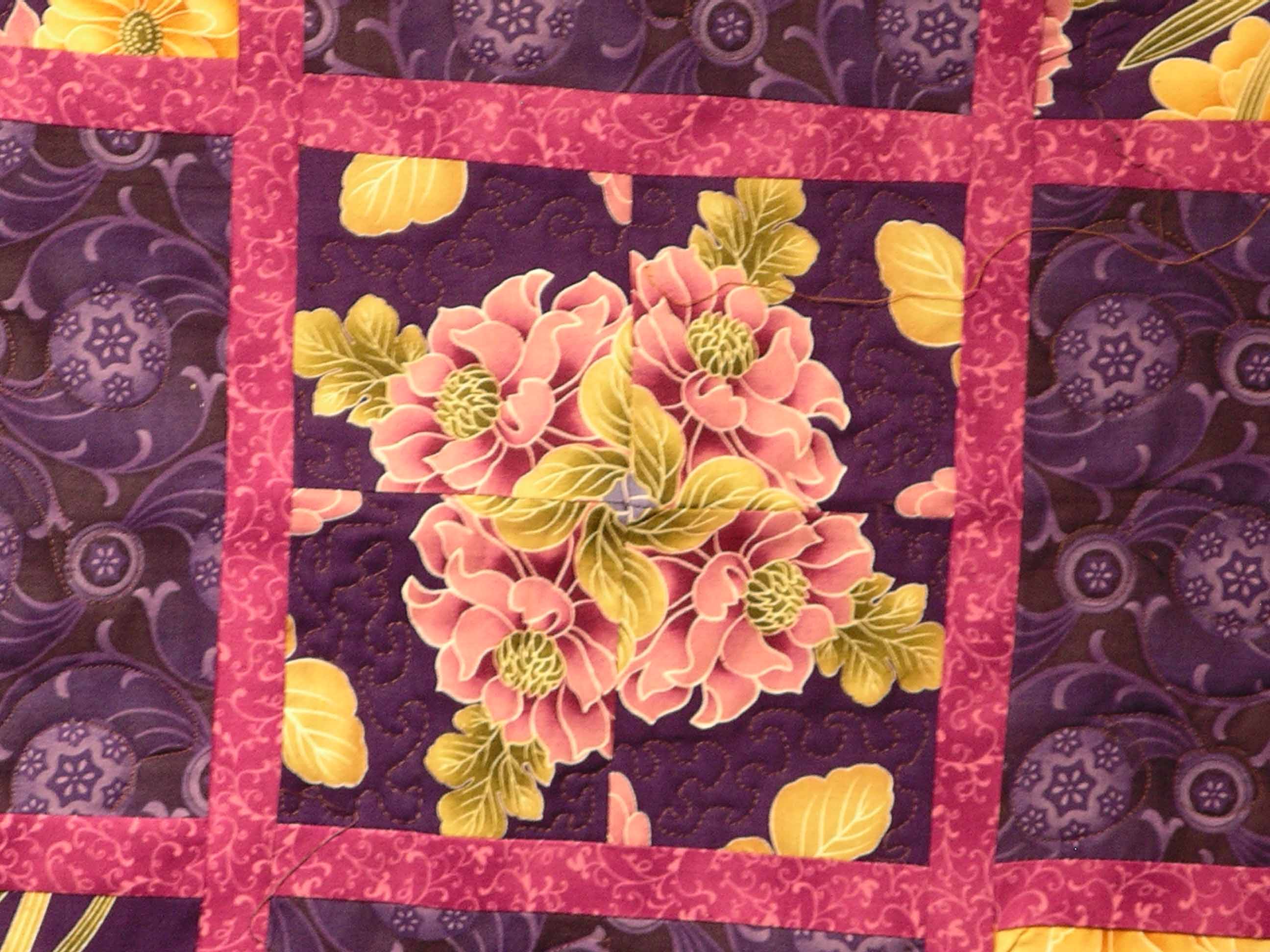 Closeup of the central block. This small quilt is backed in a medium scale floral print in pinks, purples and green.