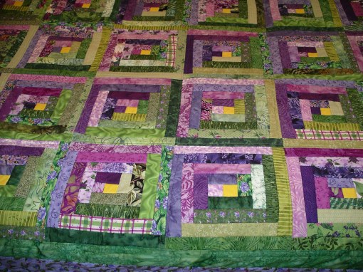 This picture shows the yellow center (heart) of the cabin blocks which asserts itself bravely among the cool greens and purples. It also shows some of the more than forty fabrics used.