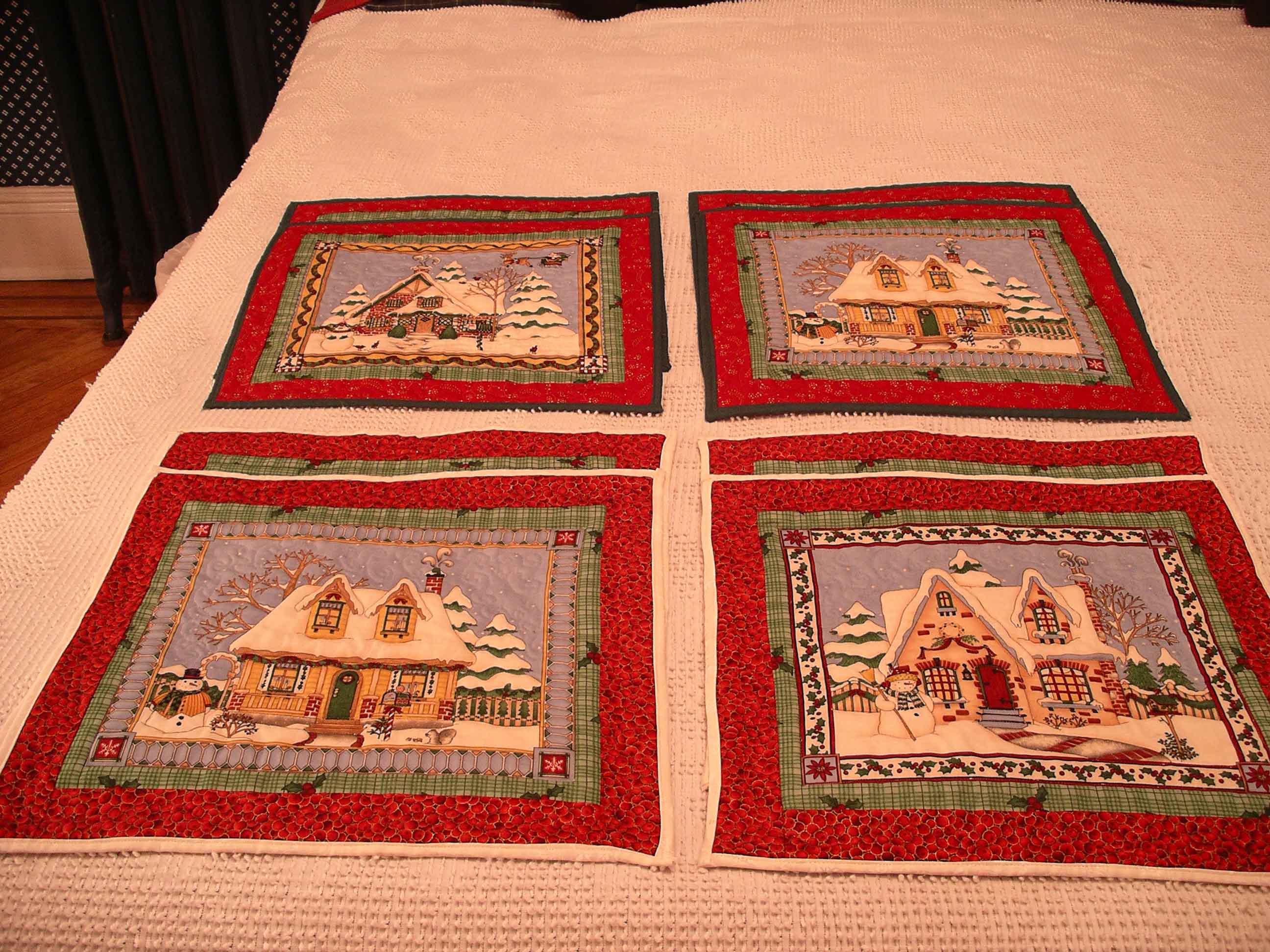 Two sets-of-four holiday placemats. Each set has two each of two images.