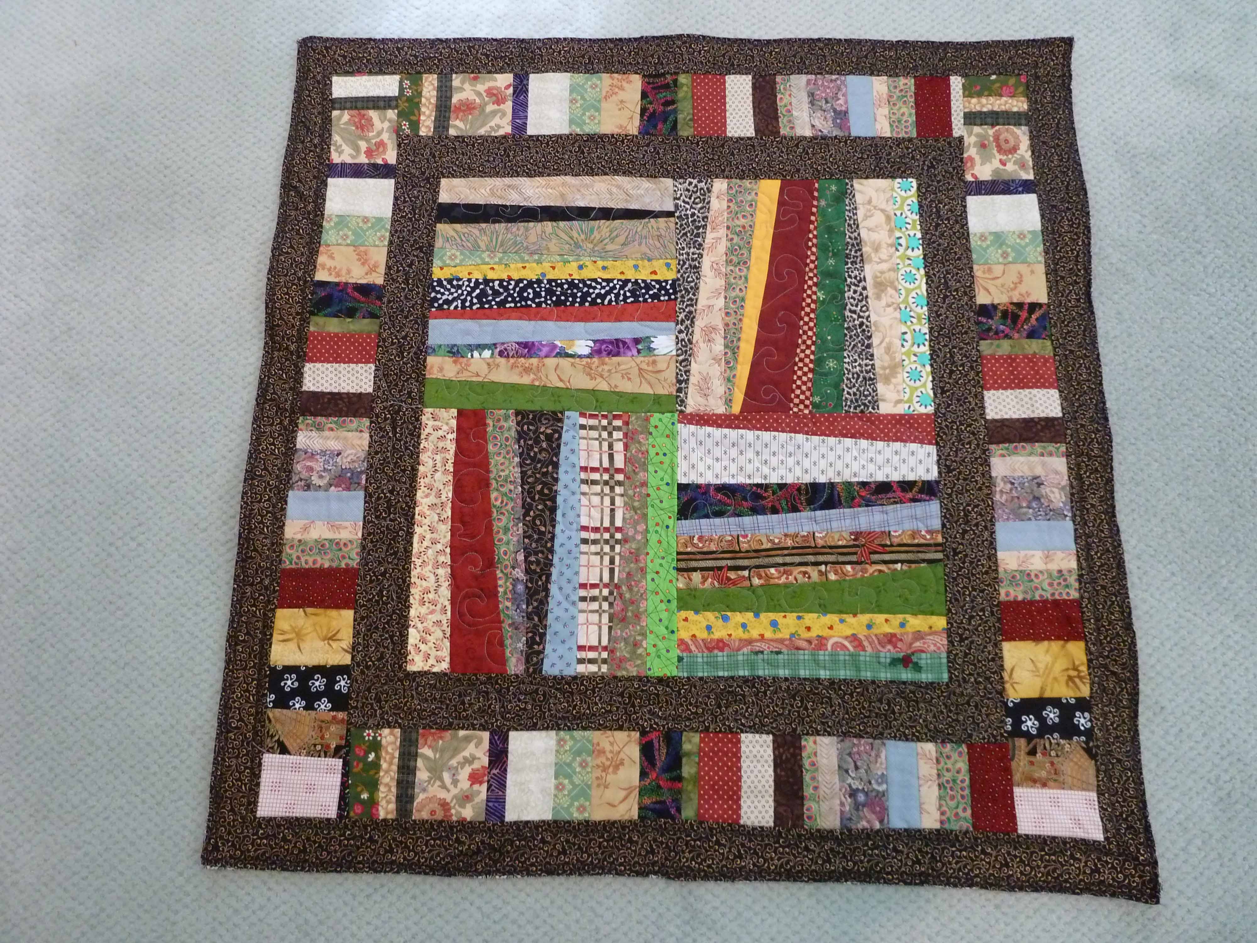 Four abstractly aligned ‘sew and flip’ blocks are joined without sashing, and surrounded by a pieced border of similar scraps.