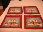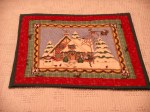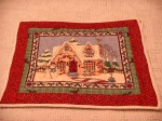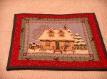28 10 2010These sweet holiday placemats come in sets of four. The winter scenes are outline-quilted to define all the critical lines of the images. The sky portions are free motion quilted to give a sense of moving air, and smoke emanating from the little chimneys. They are backed with a dainty white-on-white floral print.