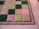 6 04 2010This sweet quilt was a gift for a baby girl. Its stair-step pattern staggers the soft pinks and greens on a diagonal in alternating colors. Stitching around the border creats the illusion of a pieced border.