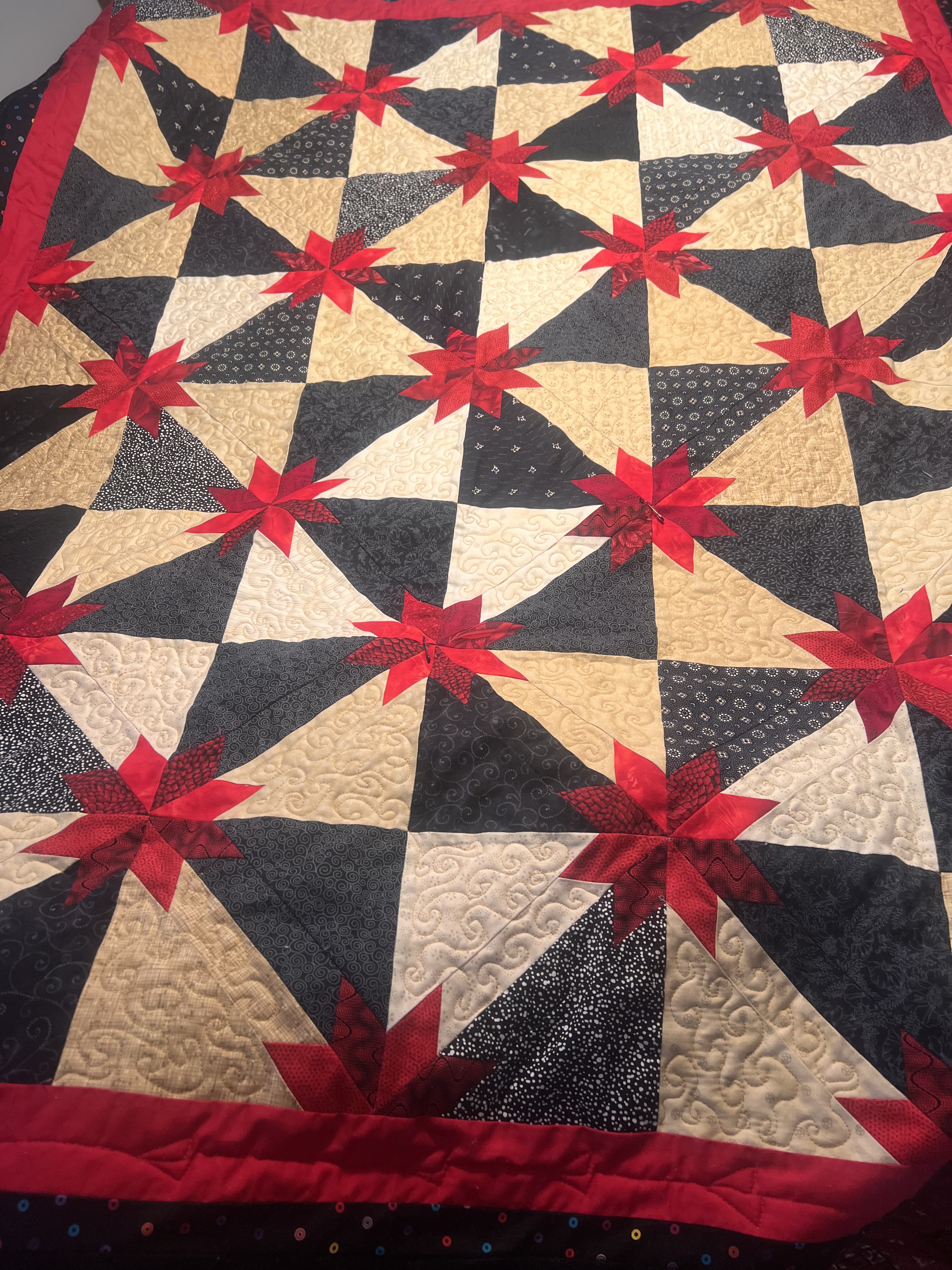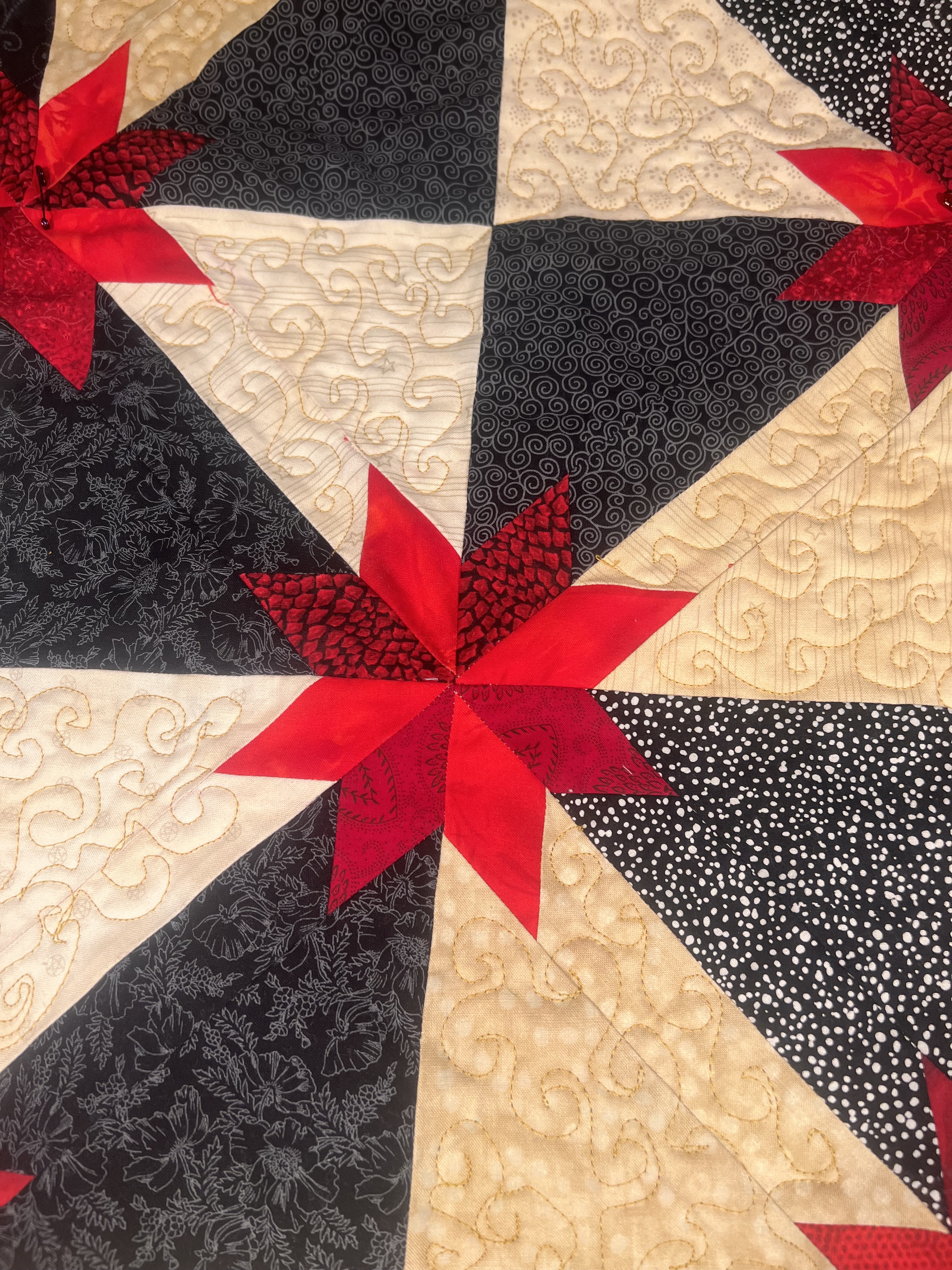 Using the Deb Tucker process and template I created this quilt using a variety of black and cream prints, while incorporating a mixed array of red prints for the stars giving them a sense of sparkle.  Using the Tucker template insured precision in the execution of the stars. It was an enjoyable project.  Still on the design wall, needing borders and quilting.