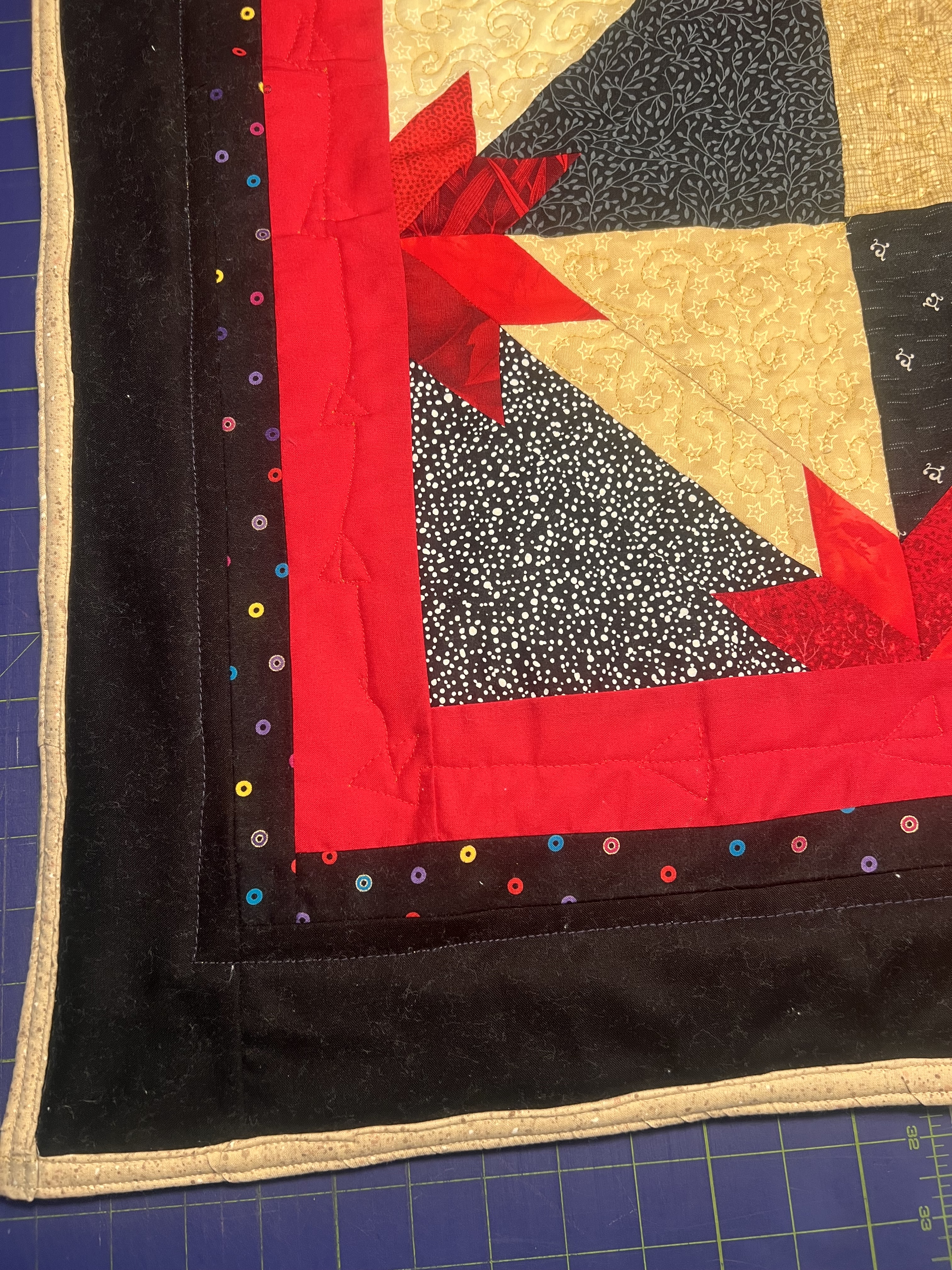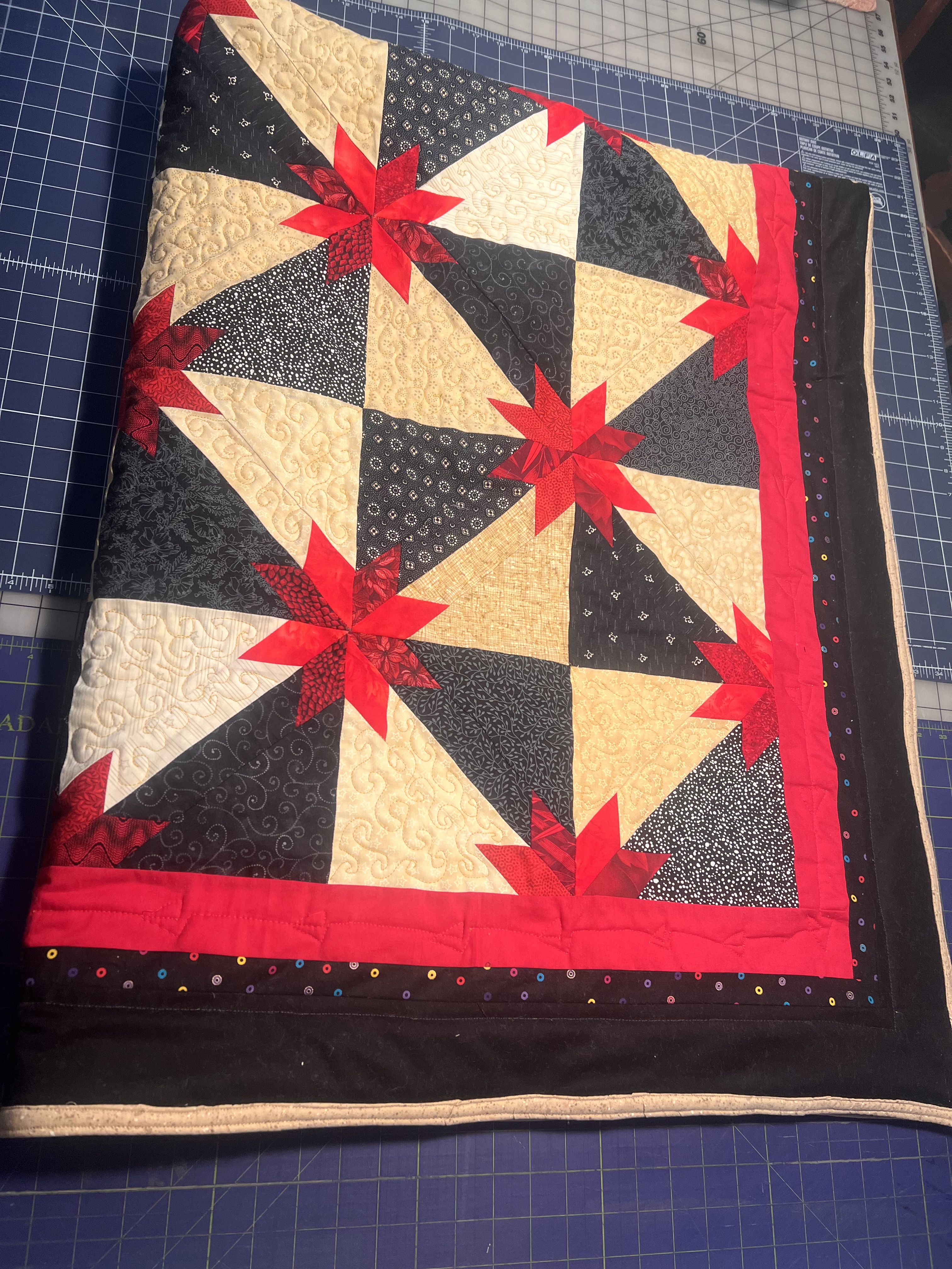 Finally finished this classic quilt design; meandering in all the cream-colored triangles. I chose a soft cream print for the backing.