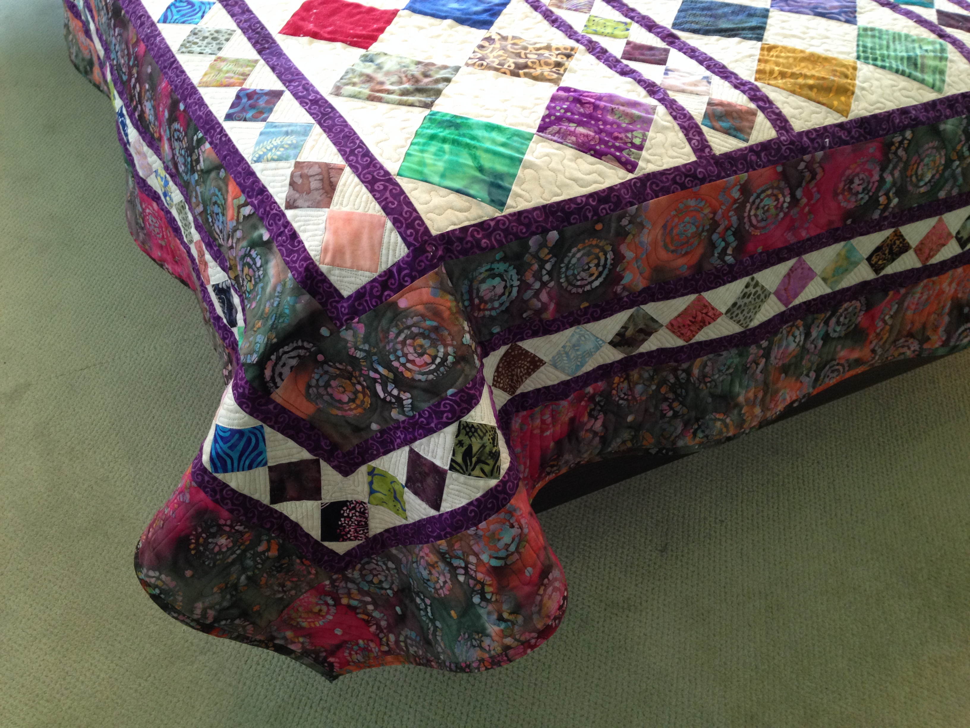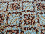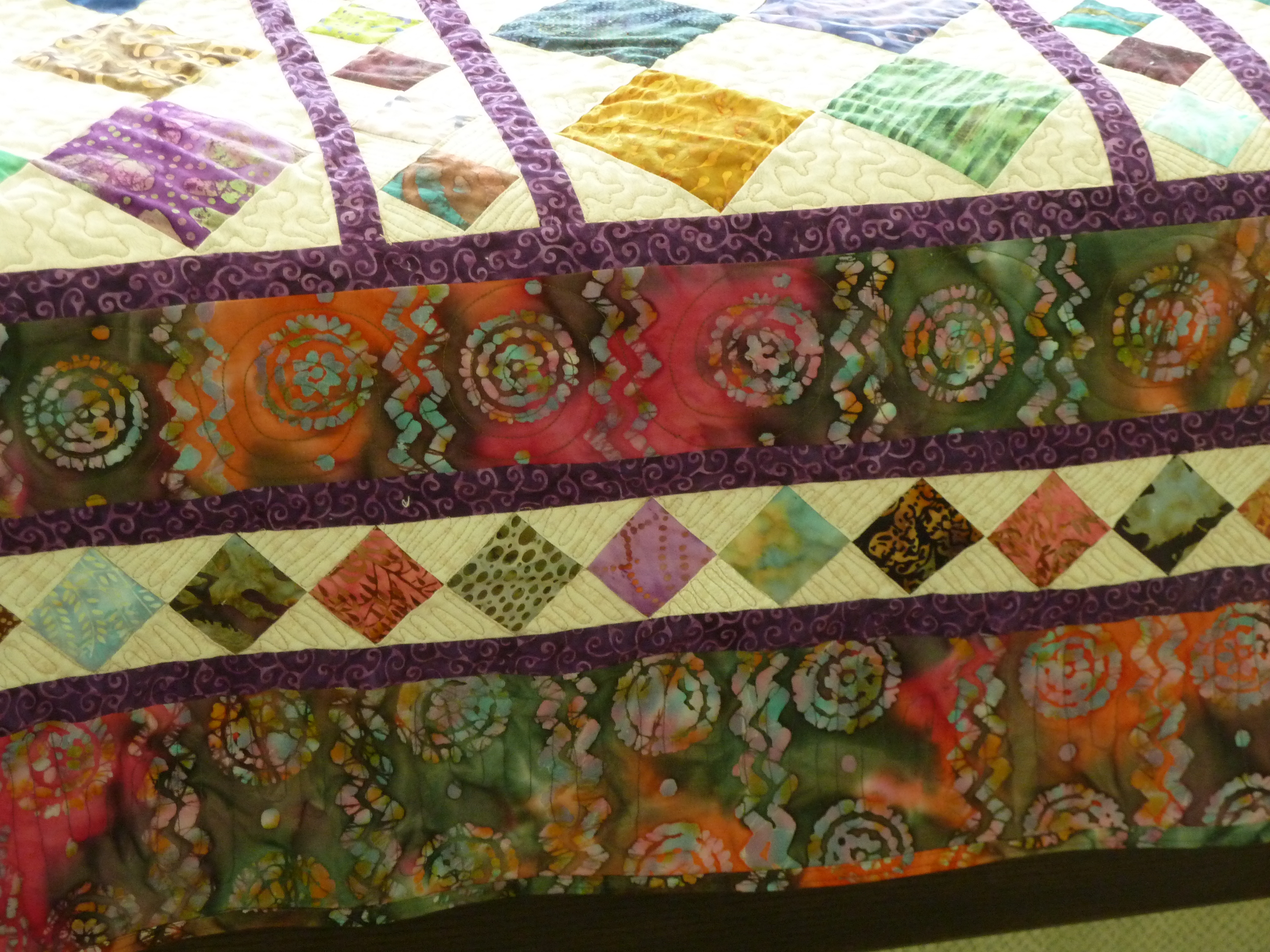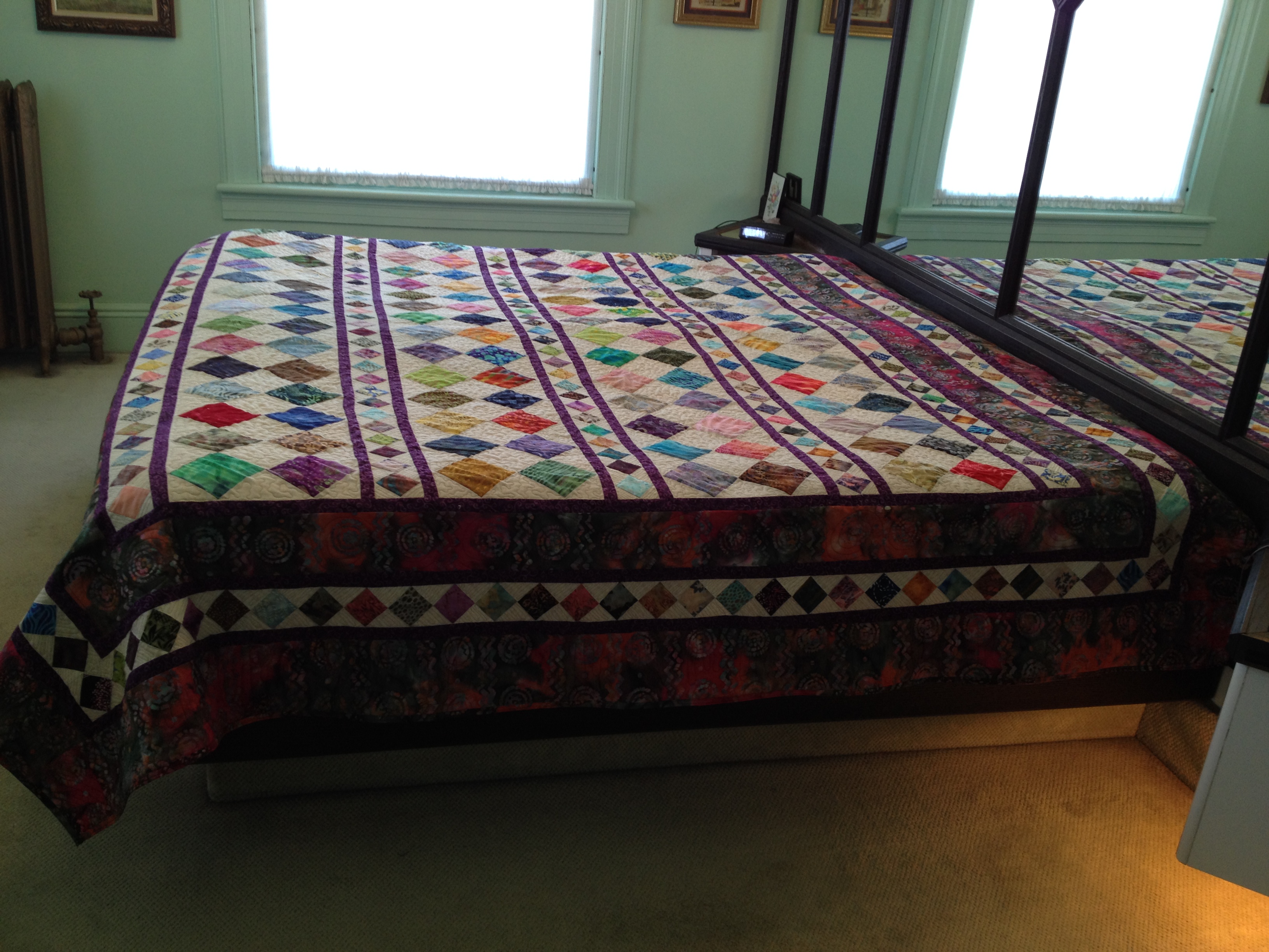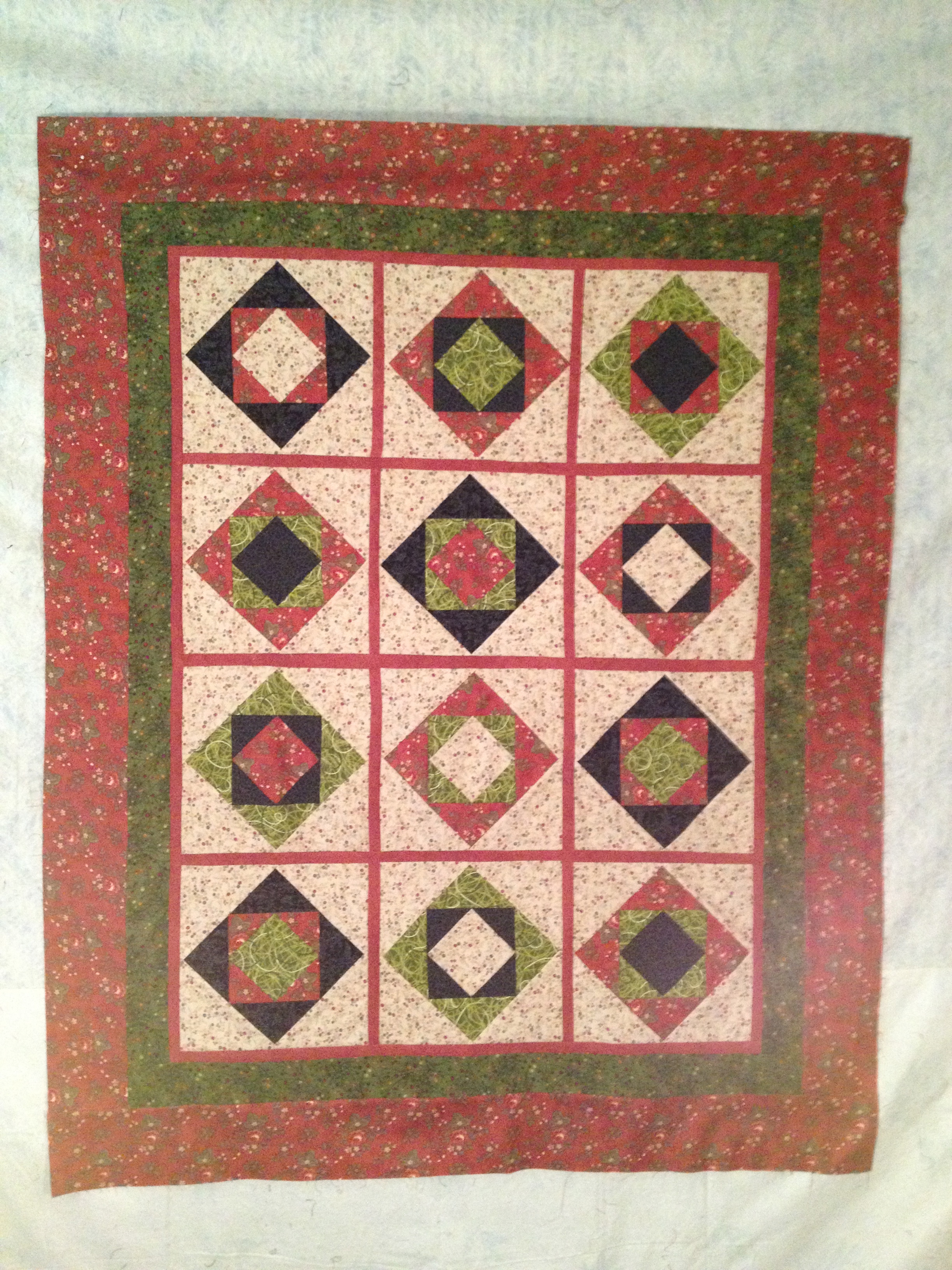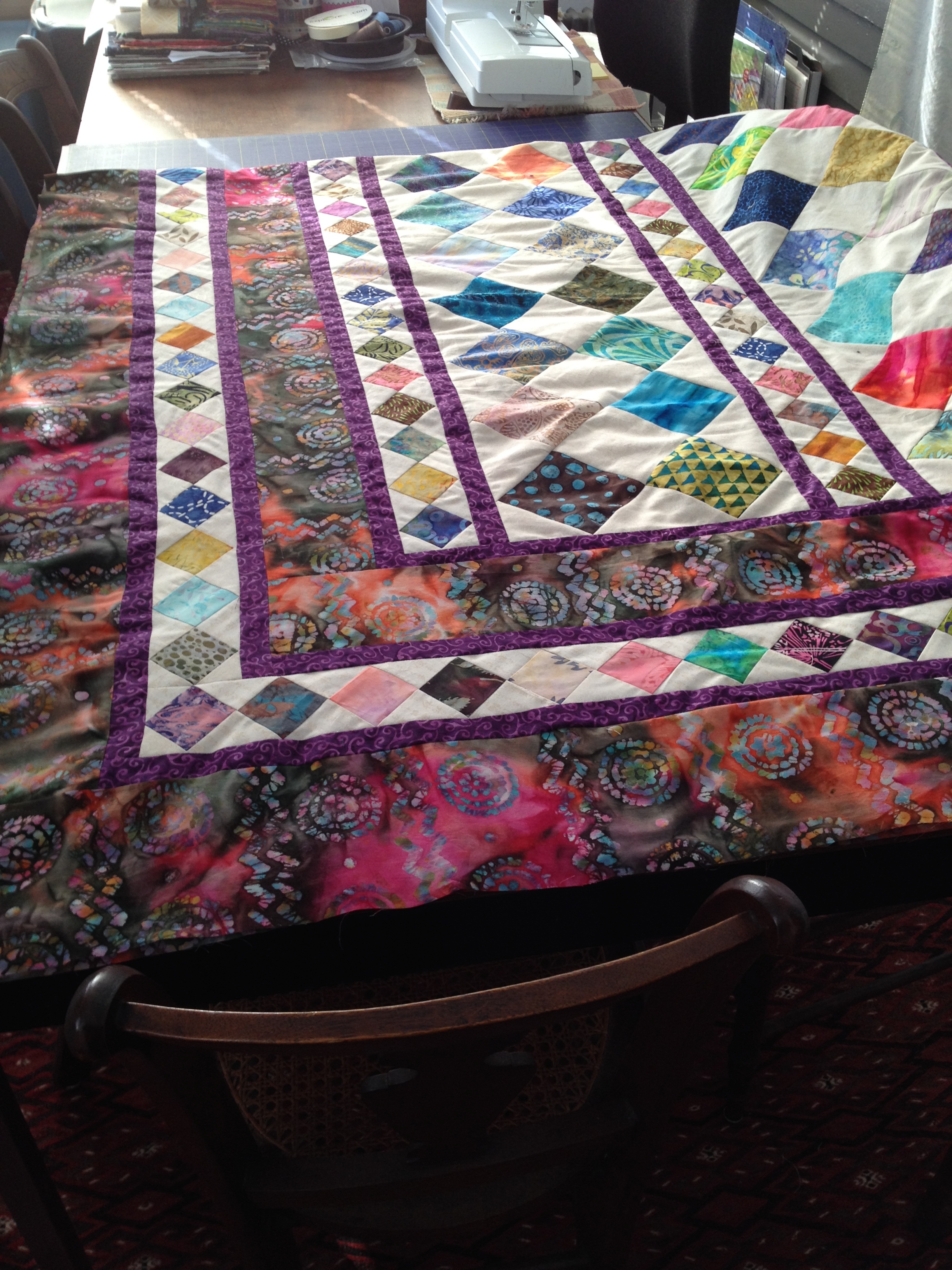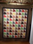 For a friend’s grandchild, I designed a really bright and playful quilt. I am not personally a fan of pastel quilts, because I know babies react to bright colors; so this square in a square in a square quilt was fun to do. An array of related prints framed in contrasting colors, some of which had appliquéd squares inserted onto the centers worked well for my concept. It was backed with a stash fabric of smaller bright squares in primary colors. The parents-to-be were very happy. I hope the baby will be too.