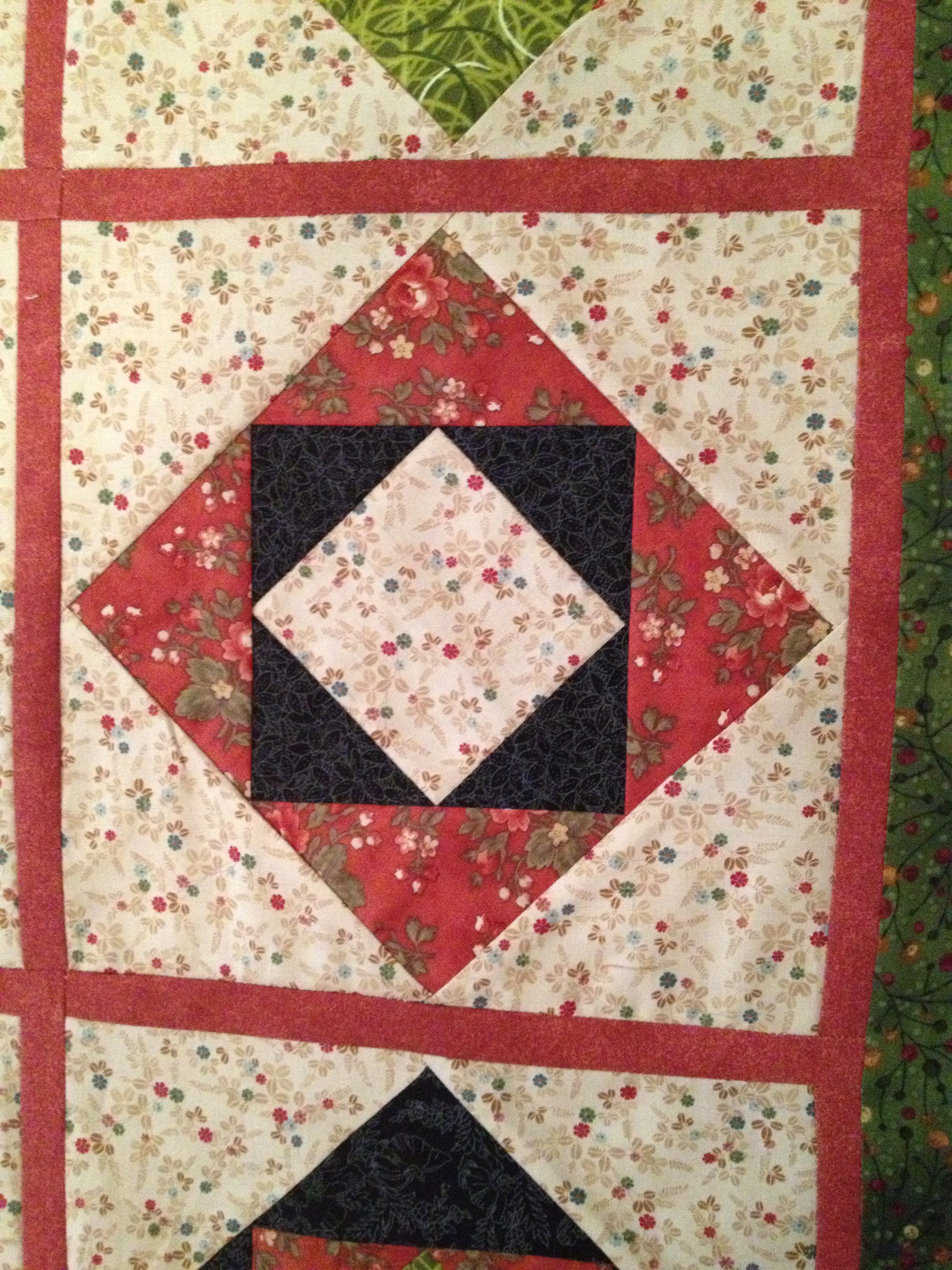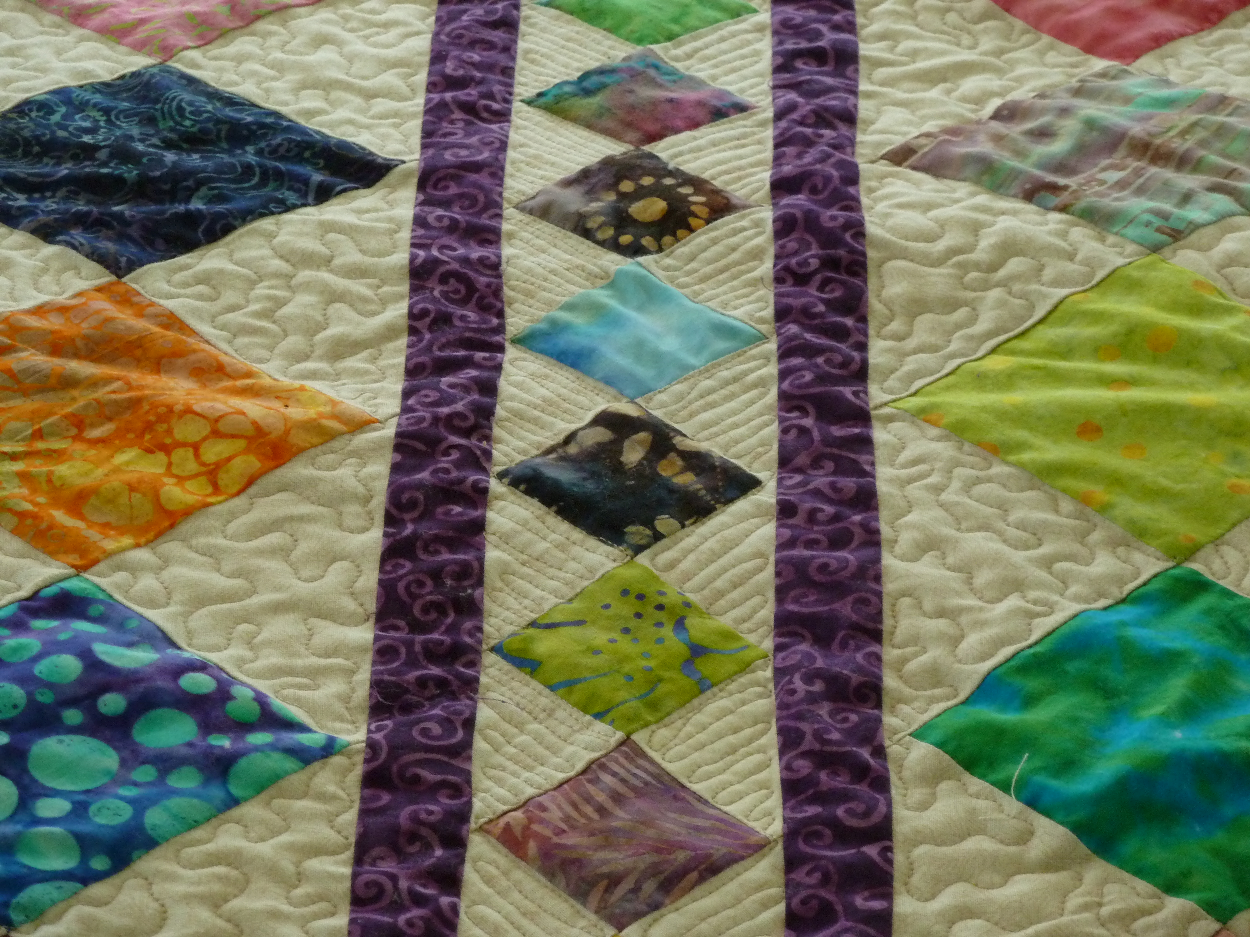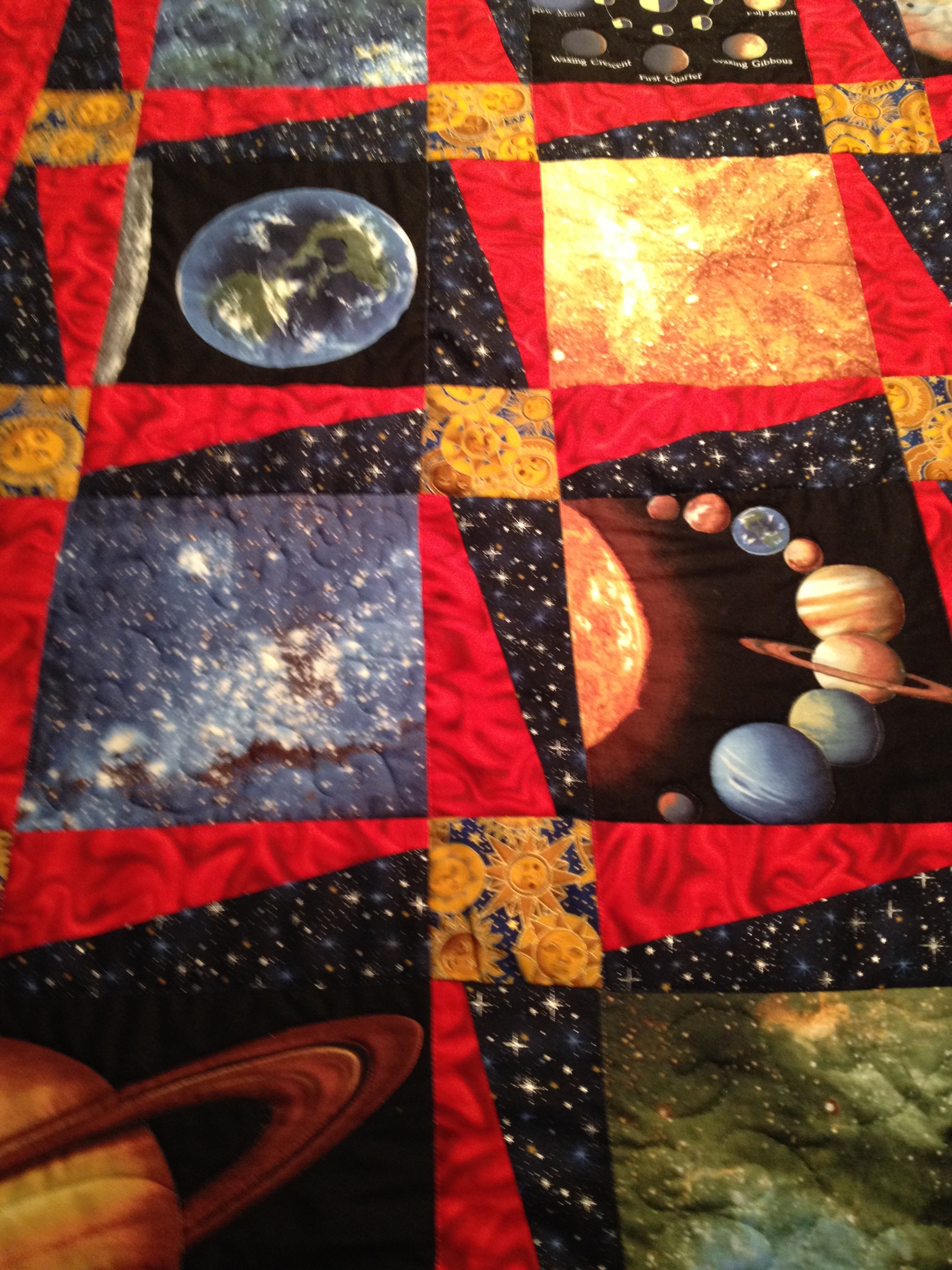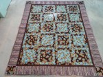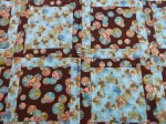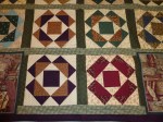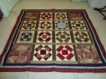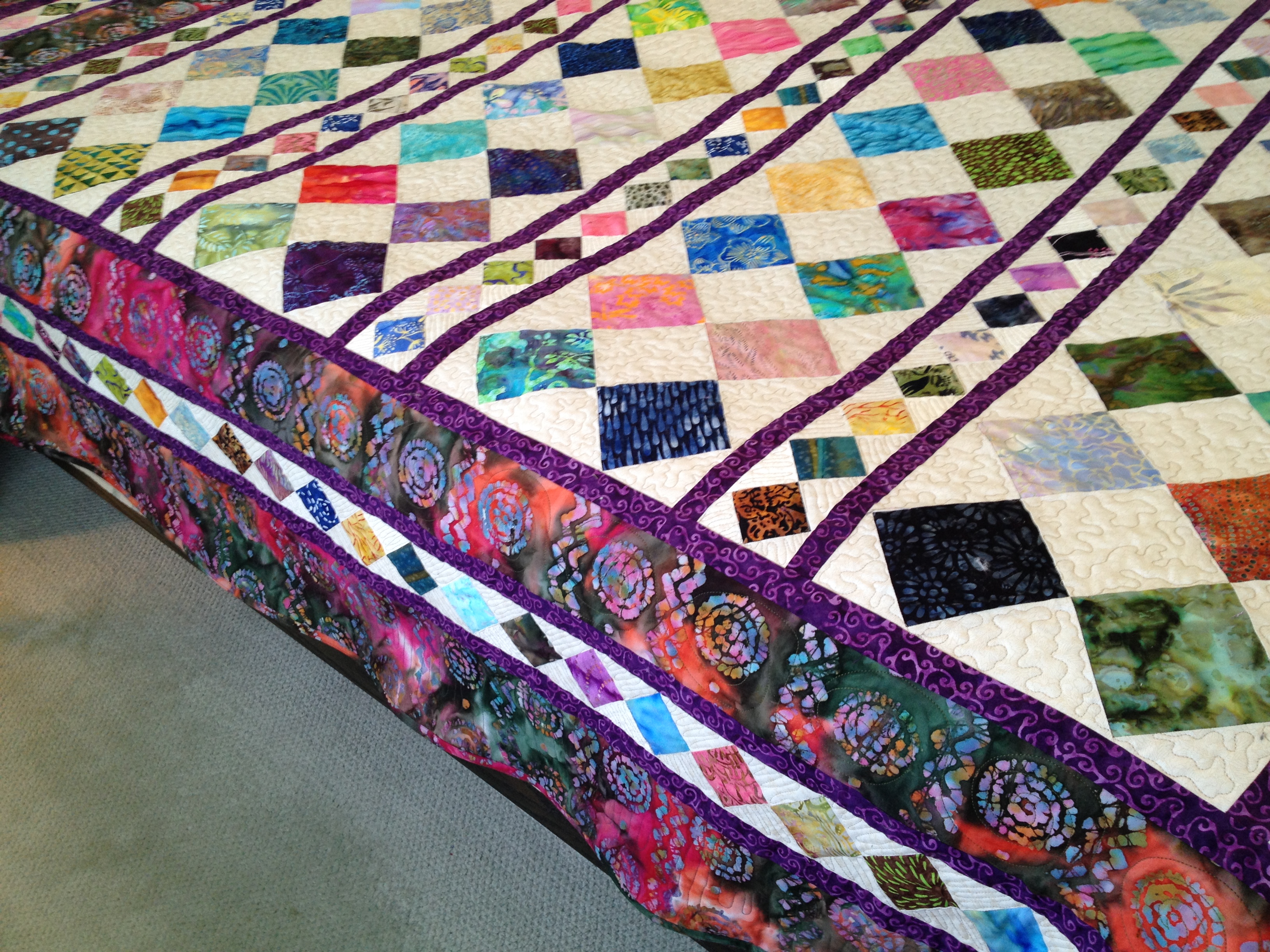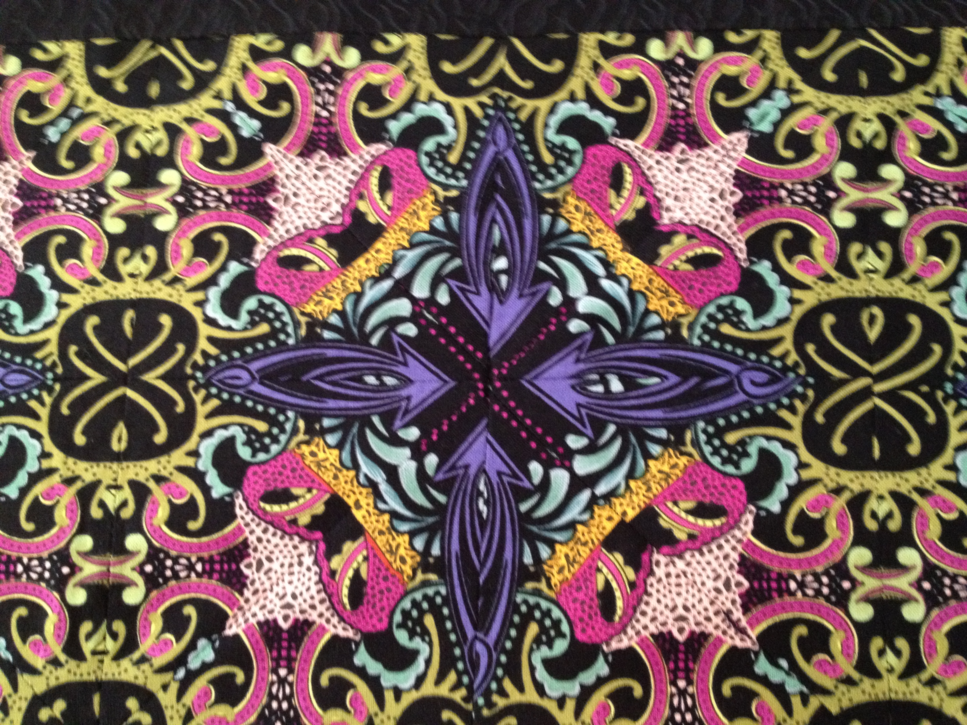 For a friend’s grandchild, I designed a really bright and playful quilt. I am not personally a fan of pastel quilts, because I know babies react to bright colors; so this square in a square in a square quilt was fun to do. An array of related prints framed in contrasting colors, some of which had appliquéd squares inserted onto the centers worked well for my concept. It was backed with a stash fabric of smaller bright squares in primary colors. The parents-to-be were very happy. I hope the baby will be too.