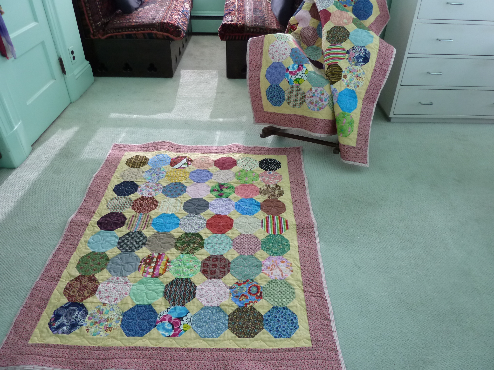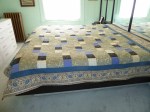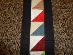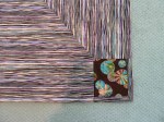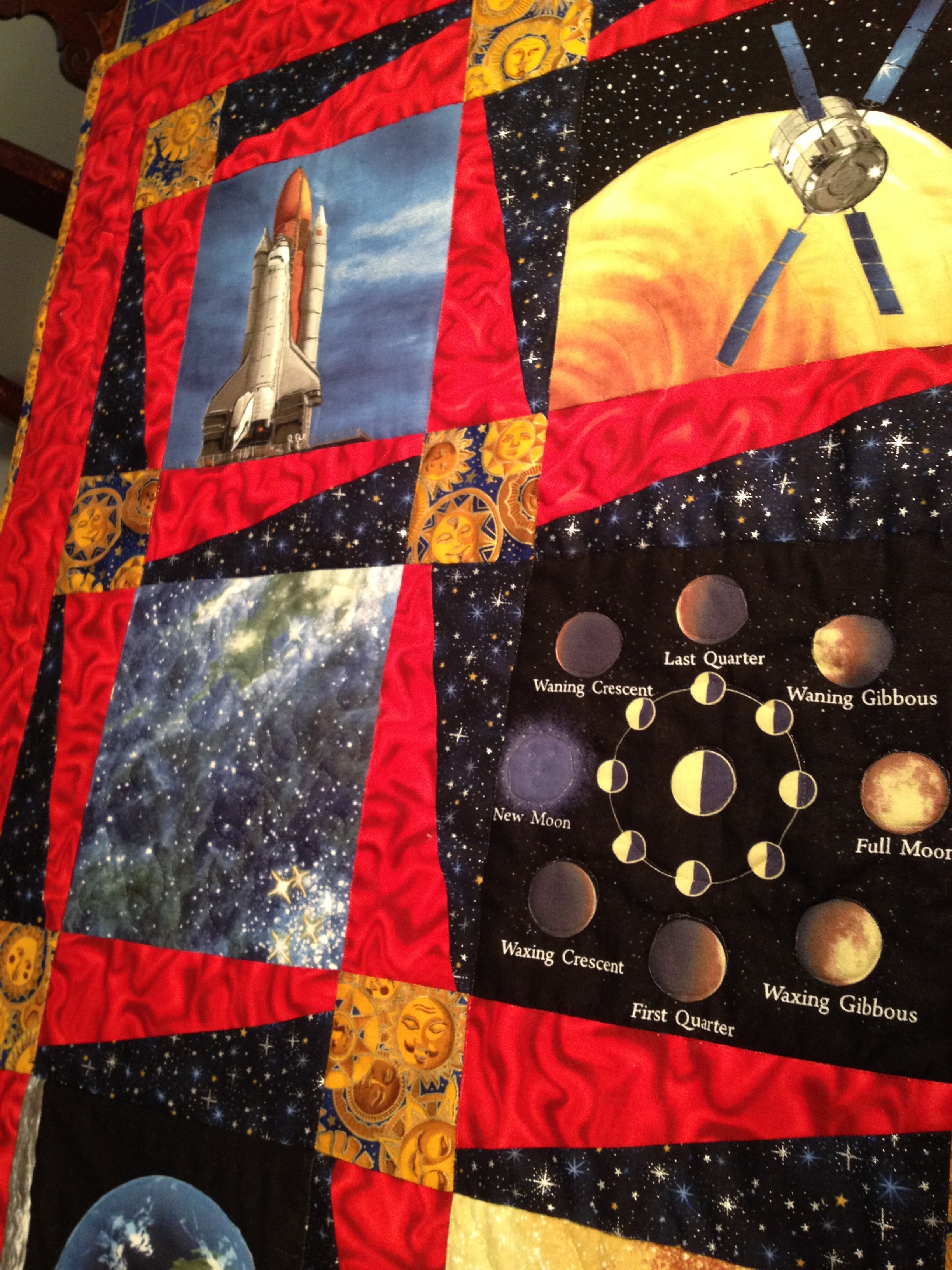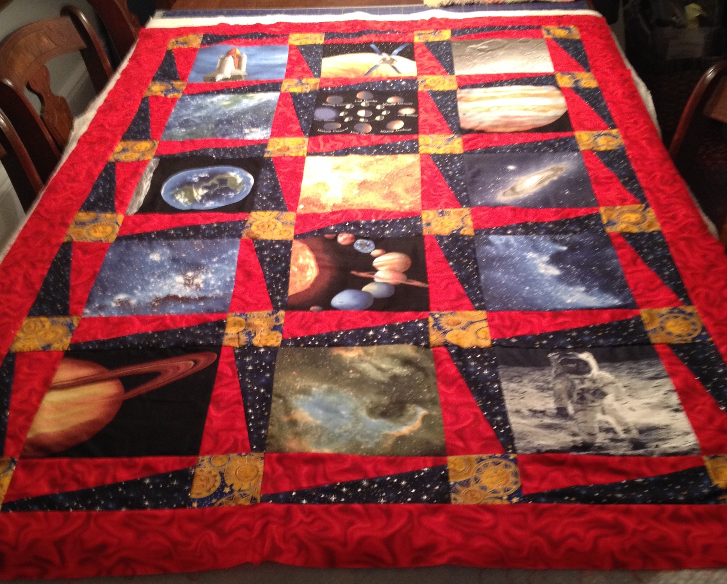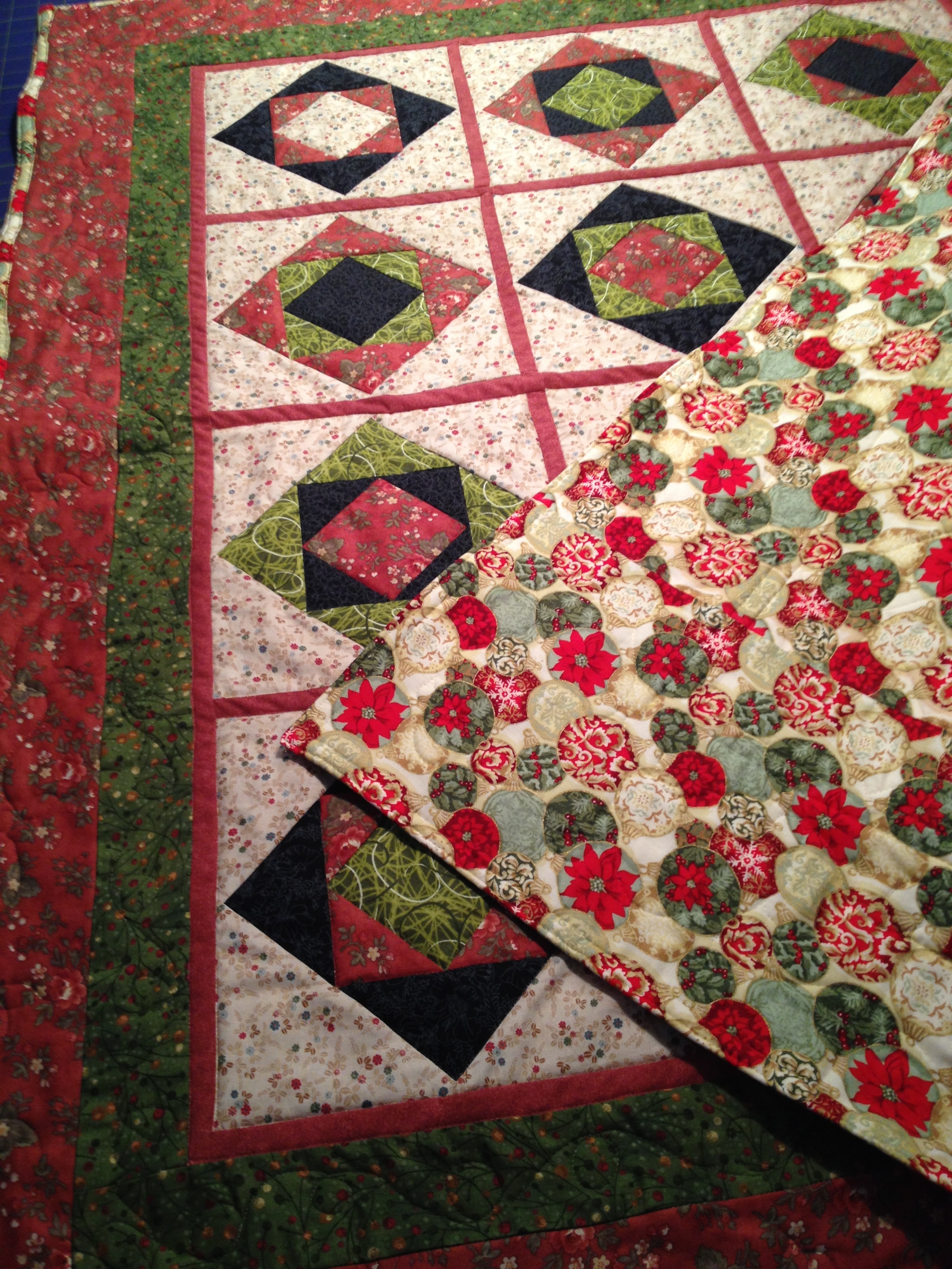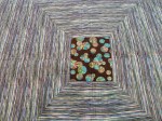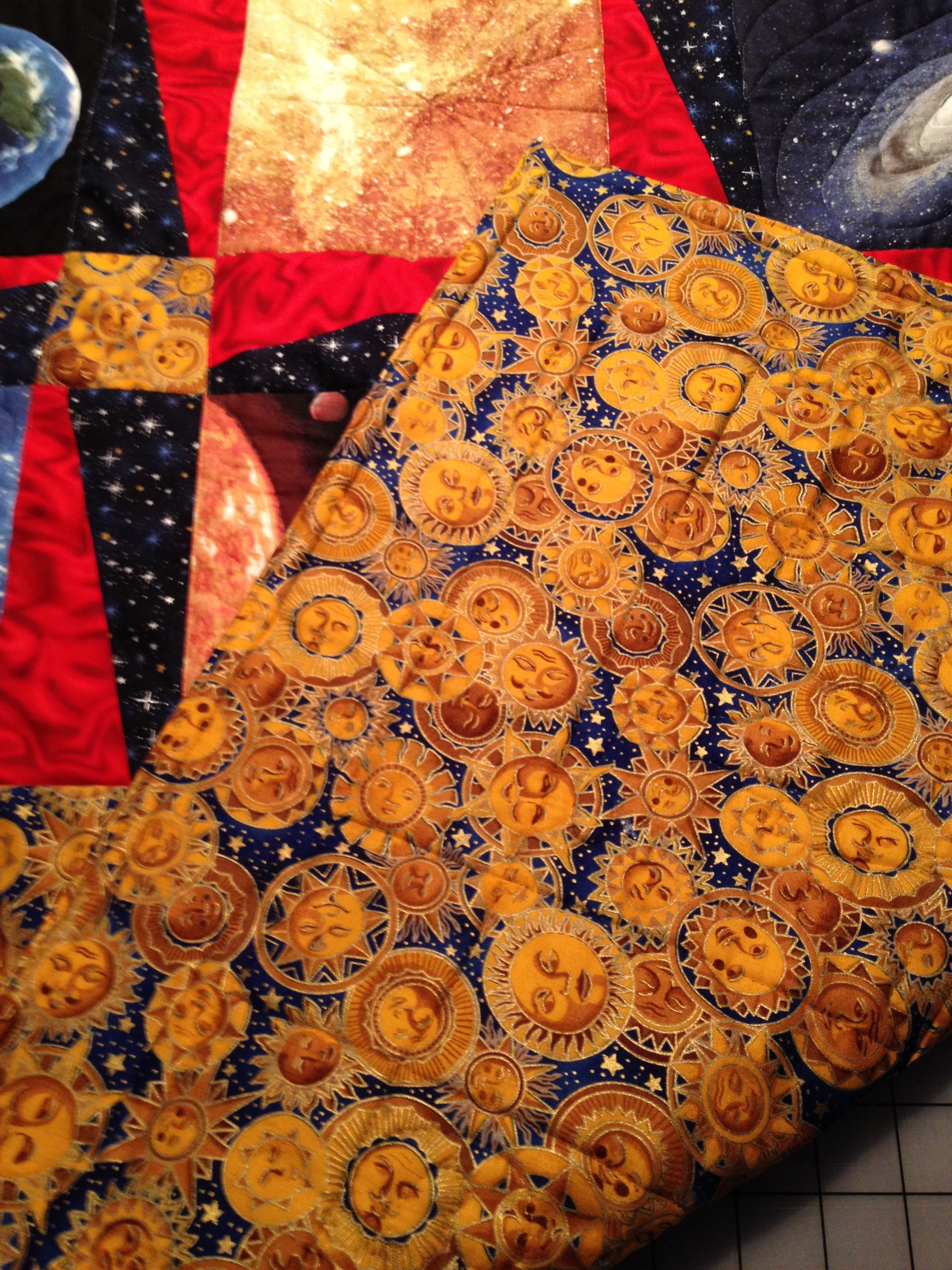 For a friend’s grandchild, I designed a really bright and playful quilt. I am not personally a fan of pastel quilts, because I know babies react to bright colors; so this square in a square in a square quilt was fun to do. An array of related prints framed in contrasting colors, some of which had appliquéd squares inserted onto the centers worked well for my concept. It was backed with a stash fabric of smaller bright squares in primary colors. The parents-to-be were very happy. I hope the baby will be too.