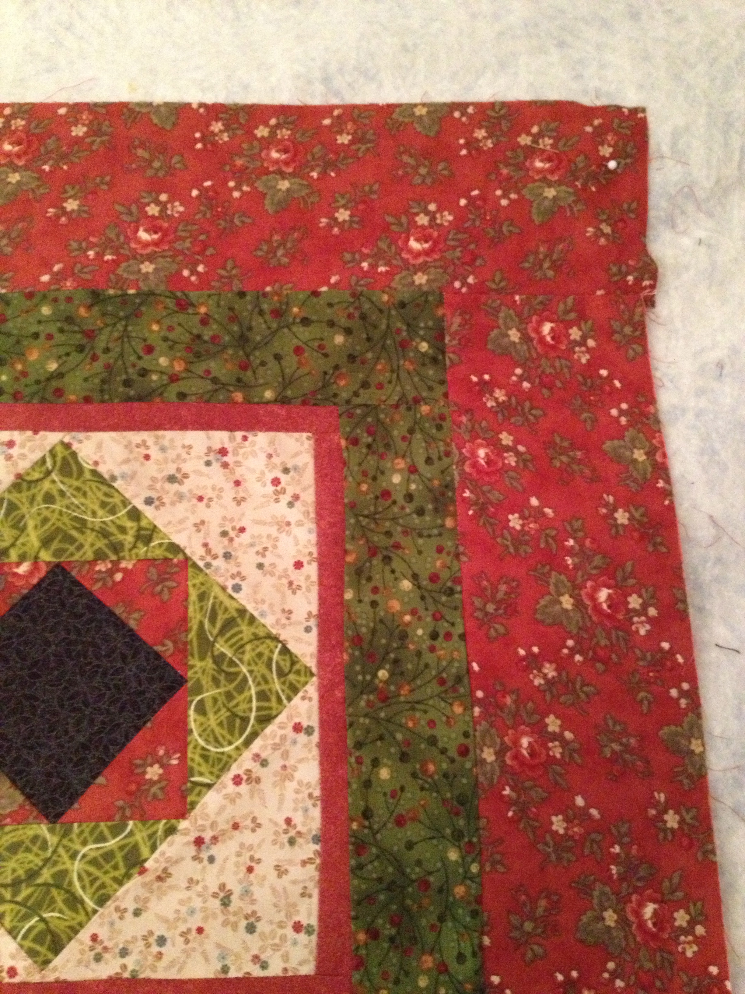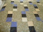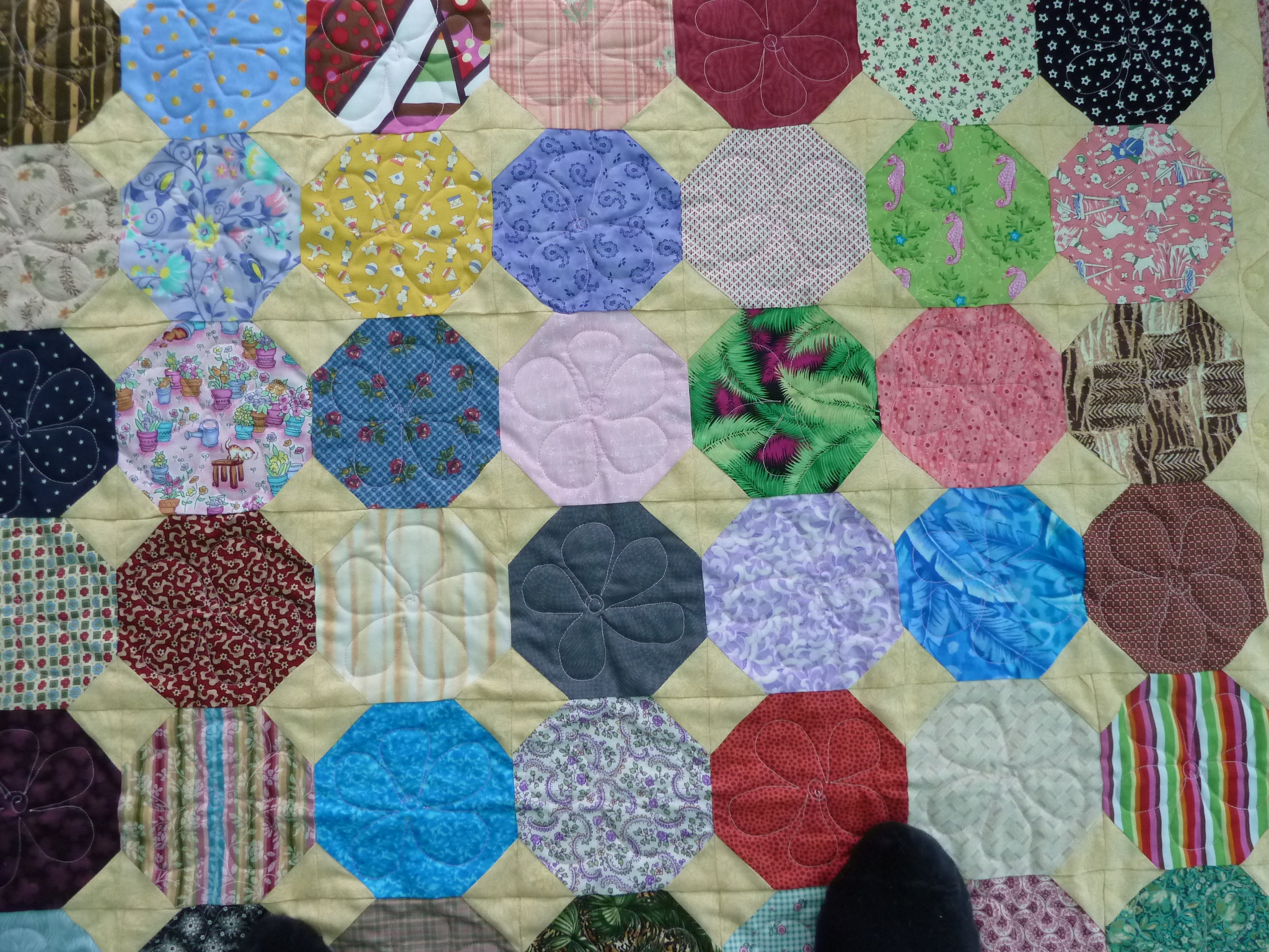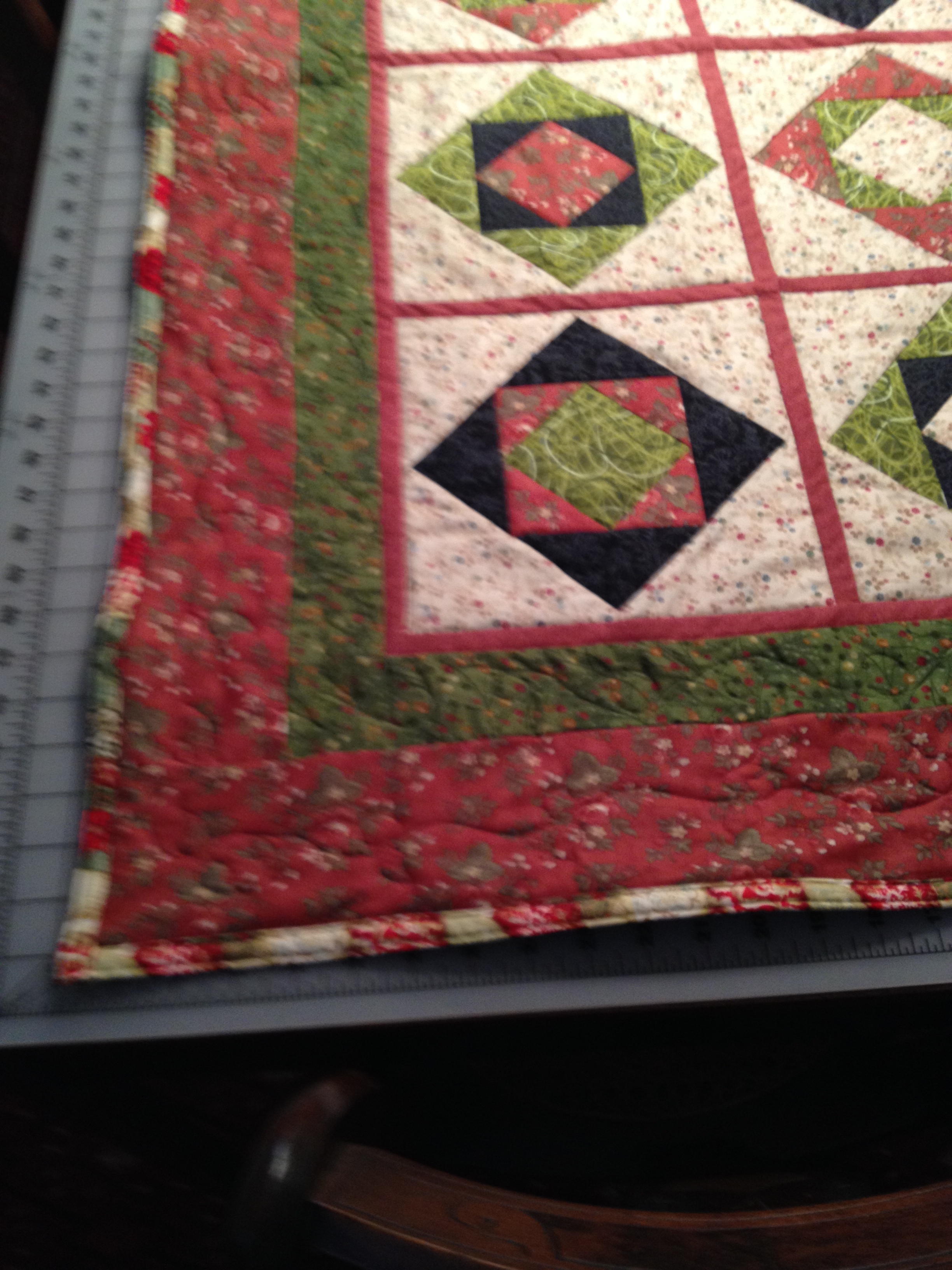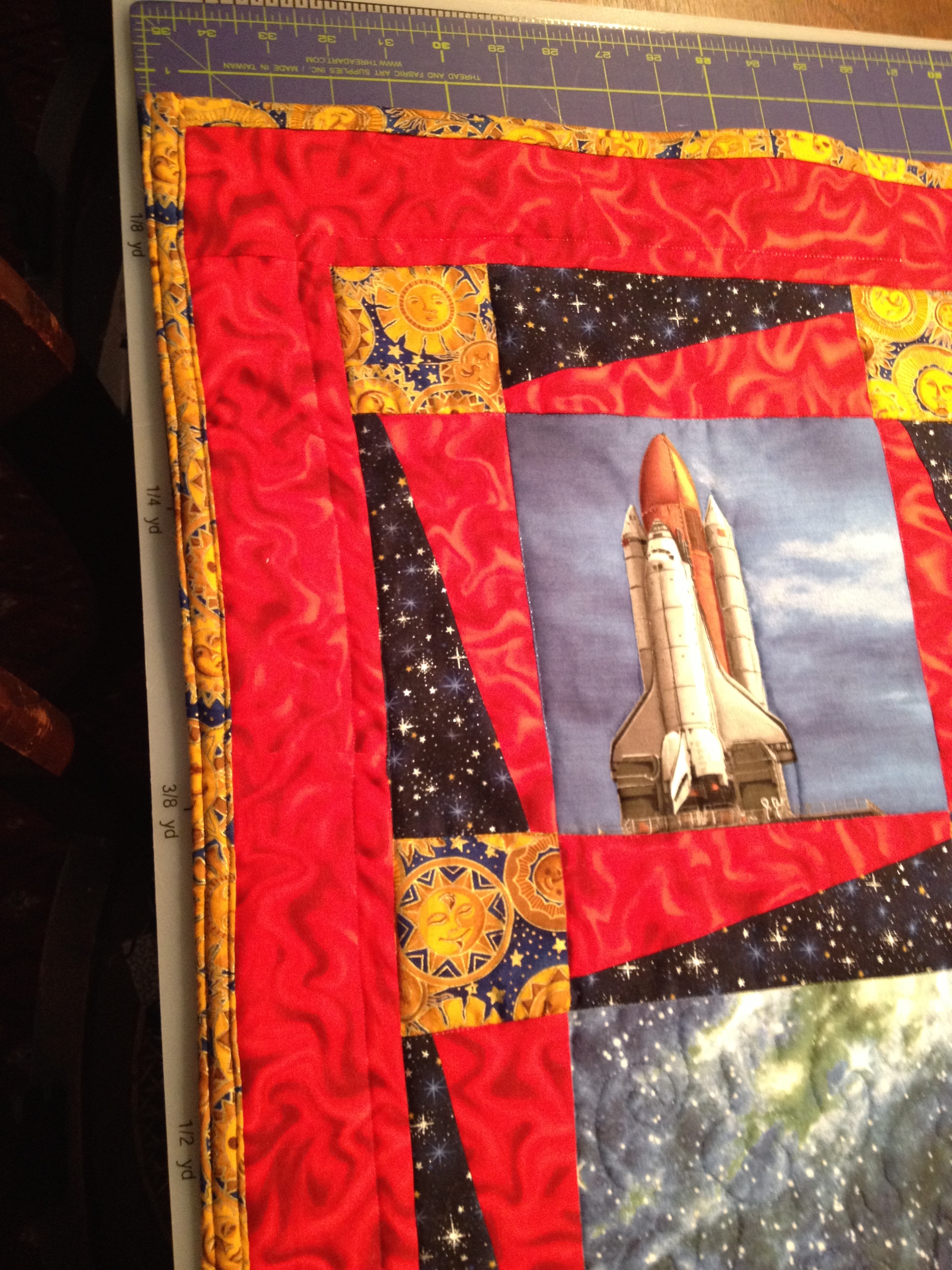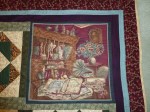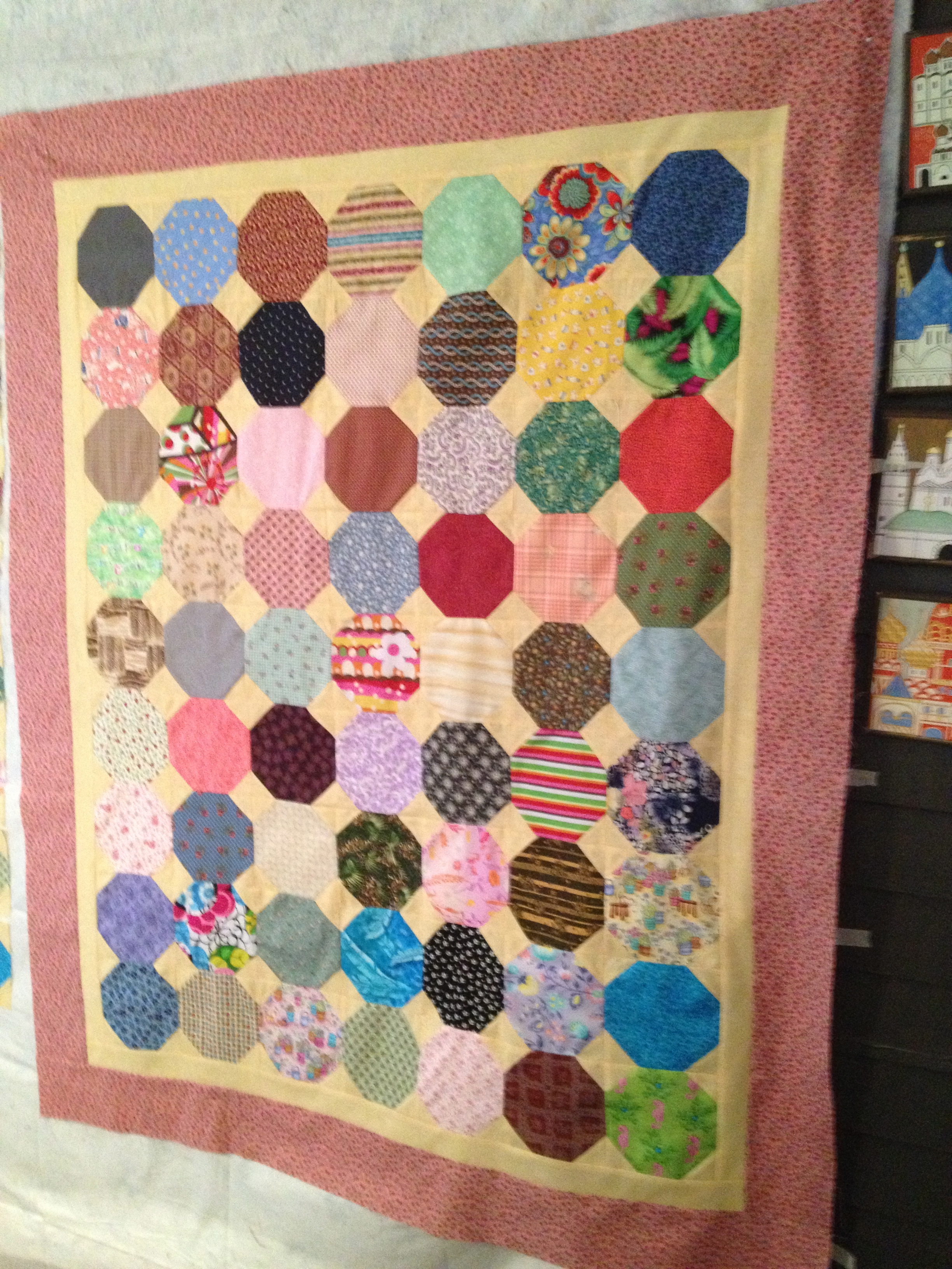For a friend’s grandchild, I designed a really bright and playful quilt. I am not personally a fan of pastel quilts, because I know babies react to bright colors; so this square in a square in a square quilt was fun to do. An array of related prints framed in contrasting colors, some of which had appliquéd squares inserted onto the centers worked well for my concept. It was backed with a stash fabric of smaller bright squares in primary colors. The parents-to-be were very happy. I hope the baby will be too.