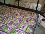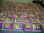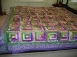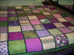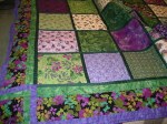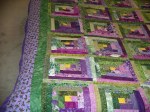 This king-size, reversible, Log Cabin quilt was made for my daughter Nikita. I chose greens, from mint to forest, and purples from palest lavender to deepest plum for the color scheme. Since she has many lilac bushes around her house, I settled on that as a theme, searching high and low for the appropriate fabrics. The core of each block is a sunny yellow, which quietly asserts itself among the cooler colors. Since it is very difficult for me to quilt such a large piece on my sewing machine, I used the “quilt-as-you-go” method. Cutting squares from each fabric, I pieced and quilted the log cabin blocks, one-by-one, until I had eighty.