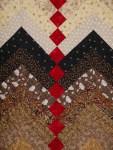 27 05 2010This quilt contains remnants of every quilt I ever made; a good use of my scrap basket. I sewed thin strips onto a seven-inch muslin foundation. I then cut the blocks in half on the diagonal, and joined those pieces to half-square triangles of bright jewel toned solids. As I sewed the blocks into rows and joined the rows together, the resultant image reminded me of a fleet of sailboats.