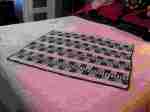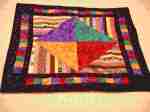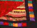 27 05 2010I made this piece as a hostess gift. I pieced seven-inch blocks with half inch strips on a foundation of muslin. I then cut the completed blocks on a diagonal and joined them with half square triangles. That called for a pieced border of the brightest colors, and, framed in black, makes this a jewel of a piece. It is an off-shoot of a much larger quilt on the same theme.
