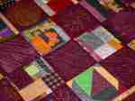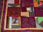 27 05 2010Half of the squares in this quilt are pieced “crazy quilt” style with bits and pieces from my scrap basket. They were too “busy” when put together, so I alternated blocks with a dark wine-colored print. That was a bit flat, so I decided to paint the red square with metallic paints using rubbing plaques and oil paint sticks. That was a lot of fun.