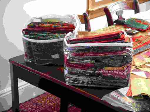 I have all sorts of bins for fabric stashes. These are my holiday bins. I have fabric stashed in the attic, the basement, in bureau draws, wherever I can get space.