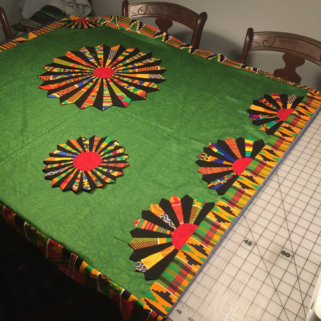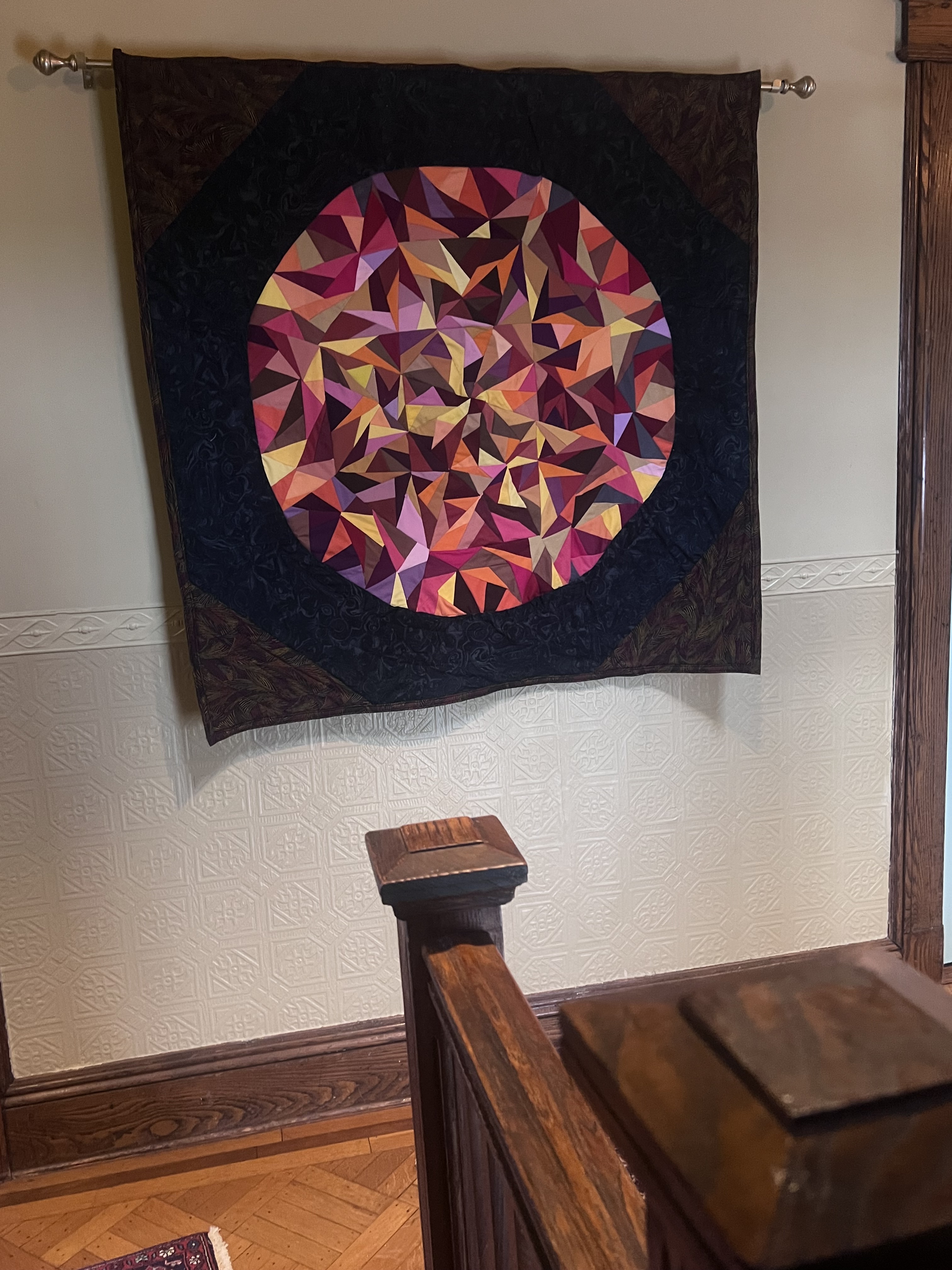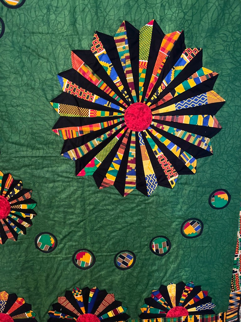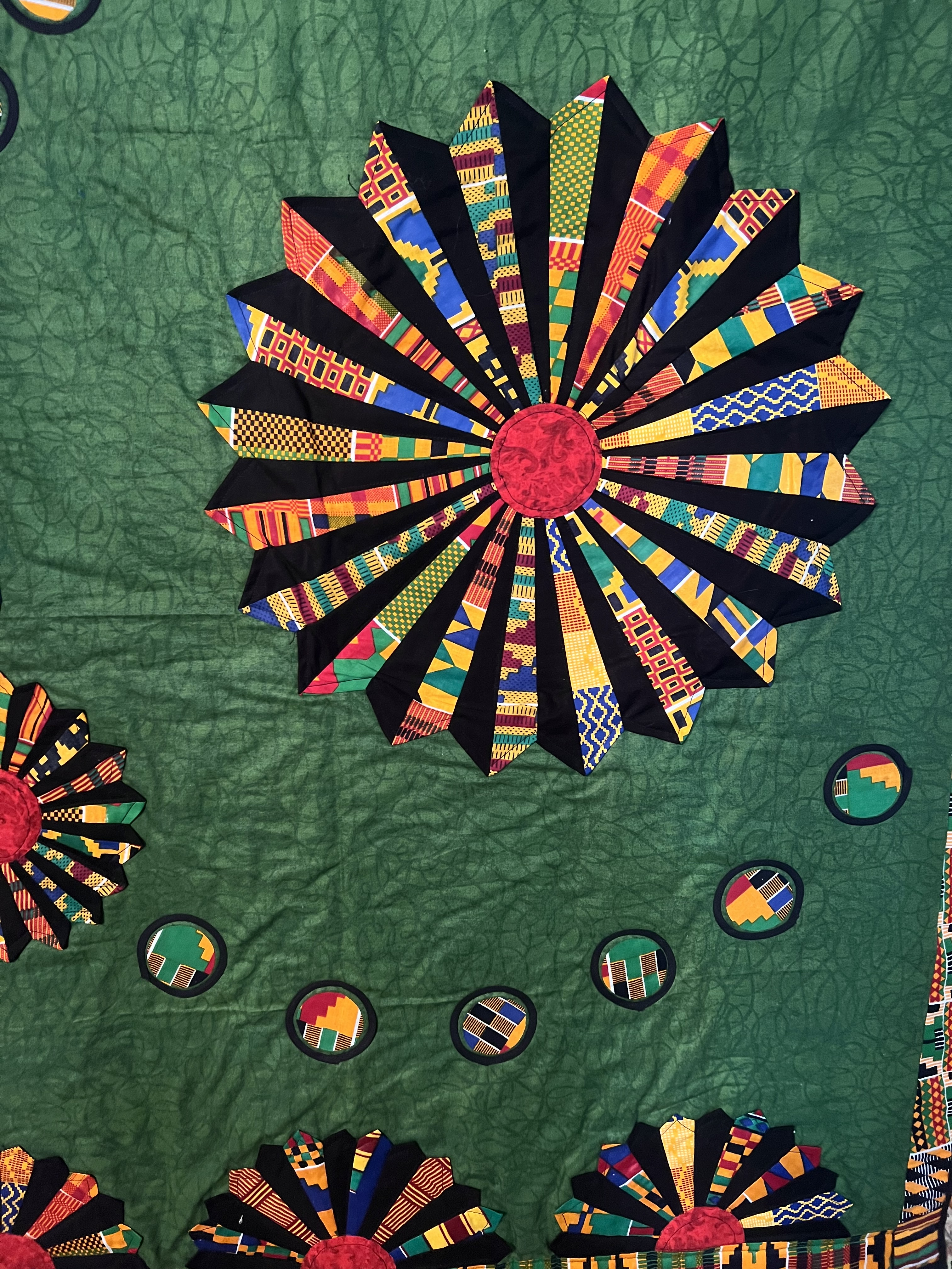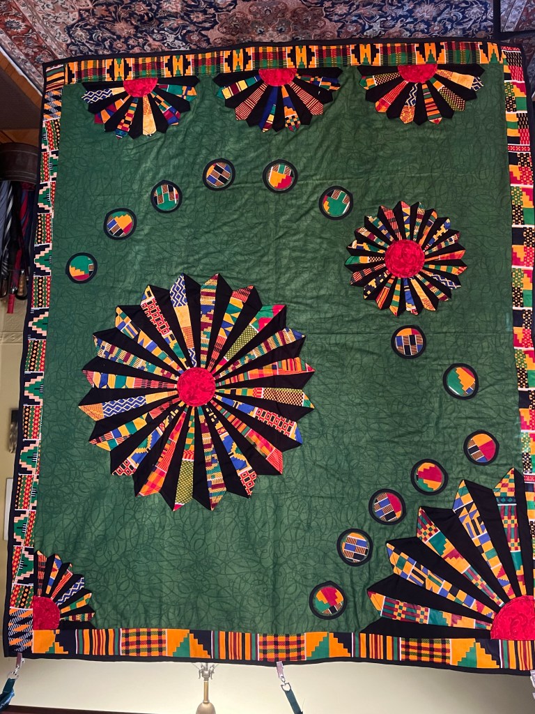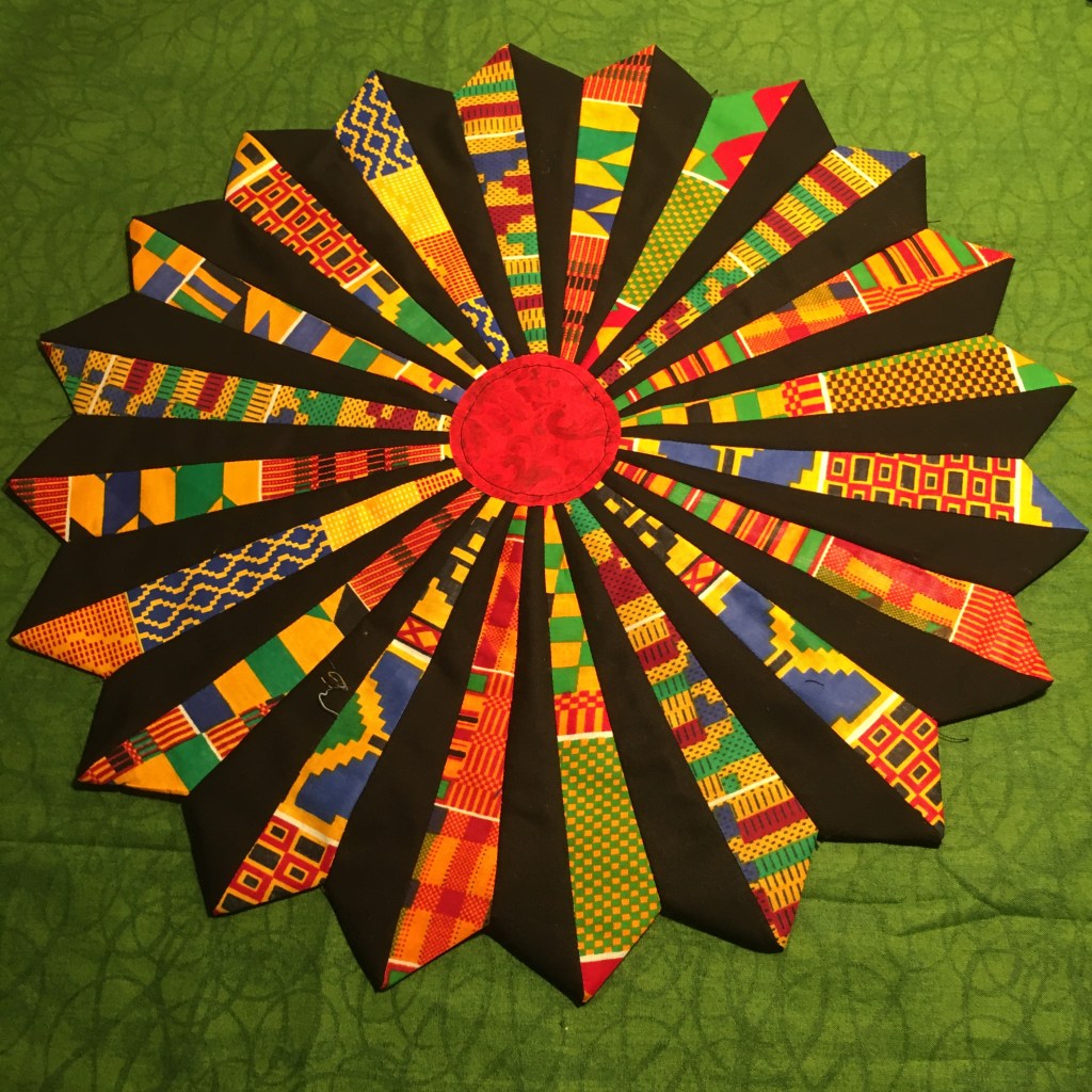This quilt began with a jellyroll of Kinte fabric strips. Using them with Amish black, making split blades, created dynamic Dresden plate designs in numerous configurations. This makes for a dramatic wall hanging.