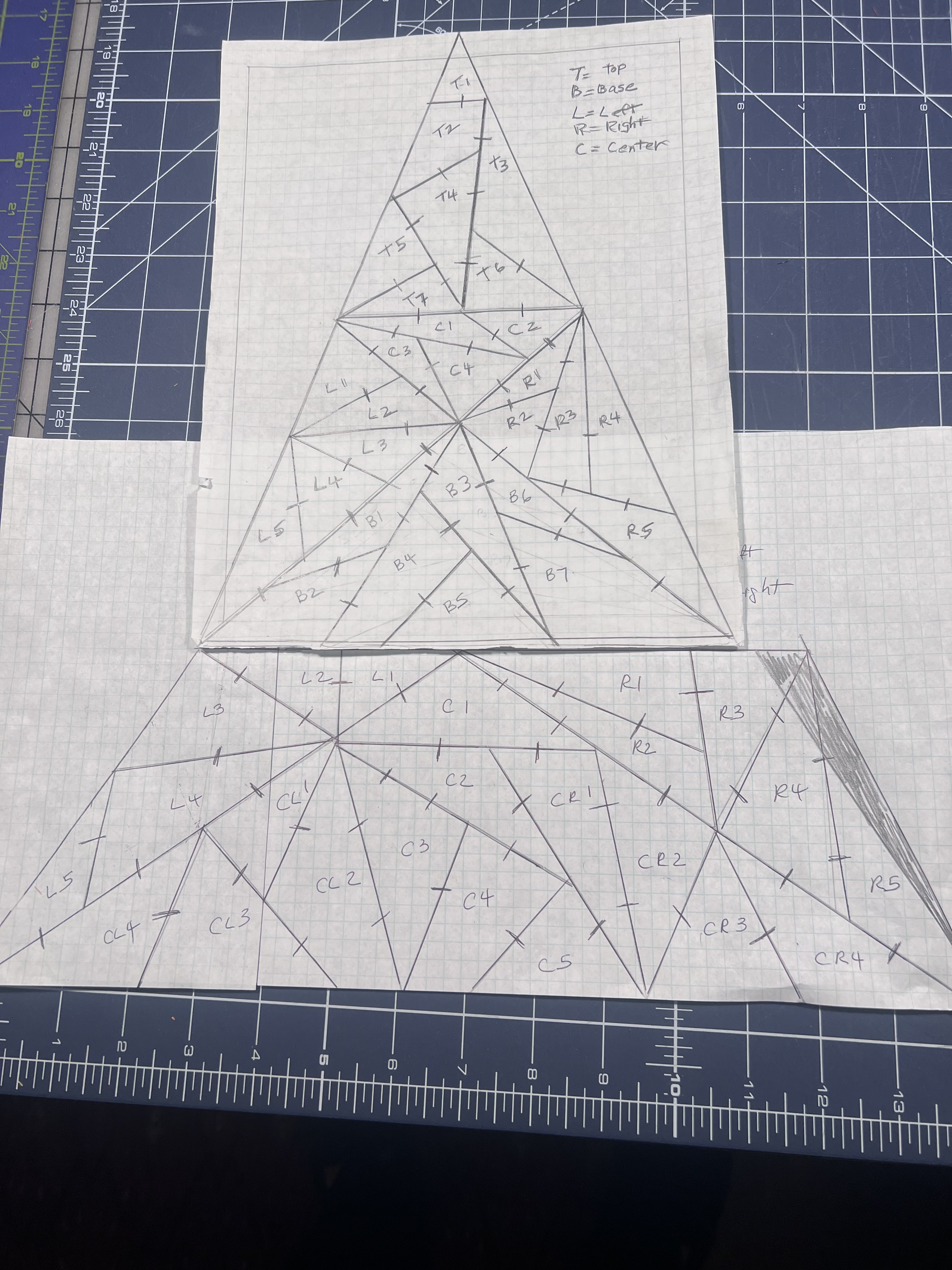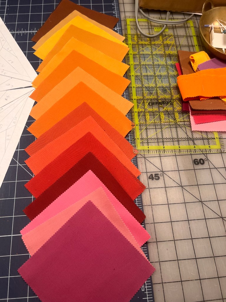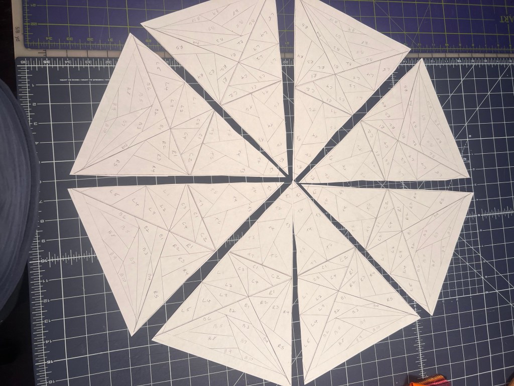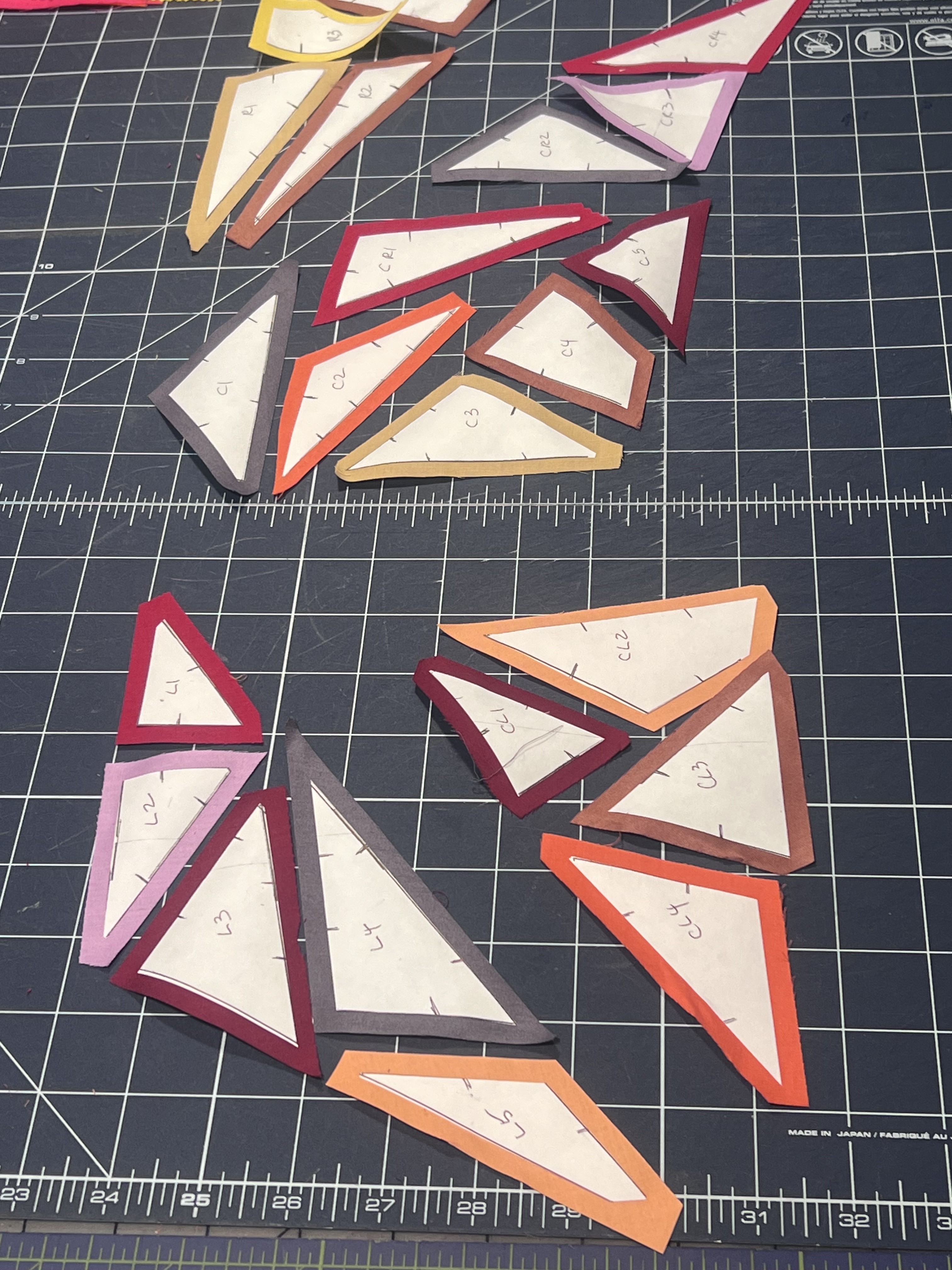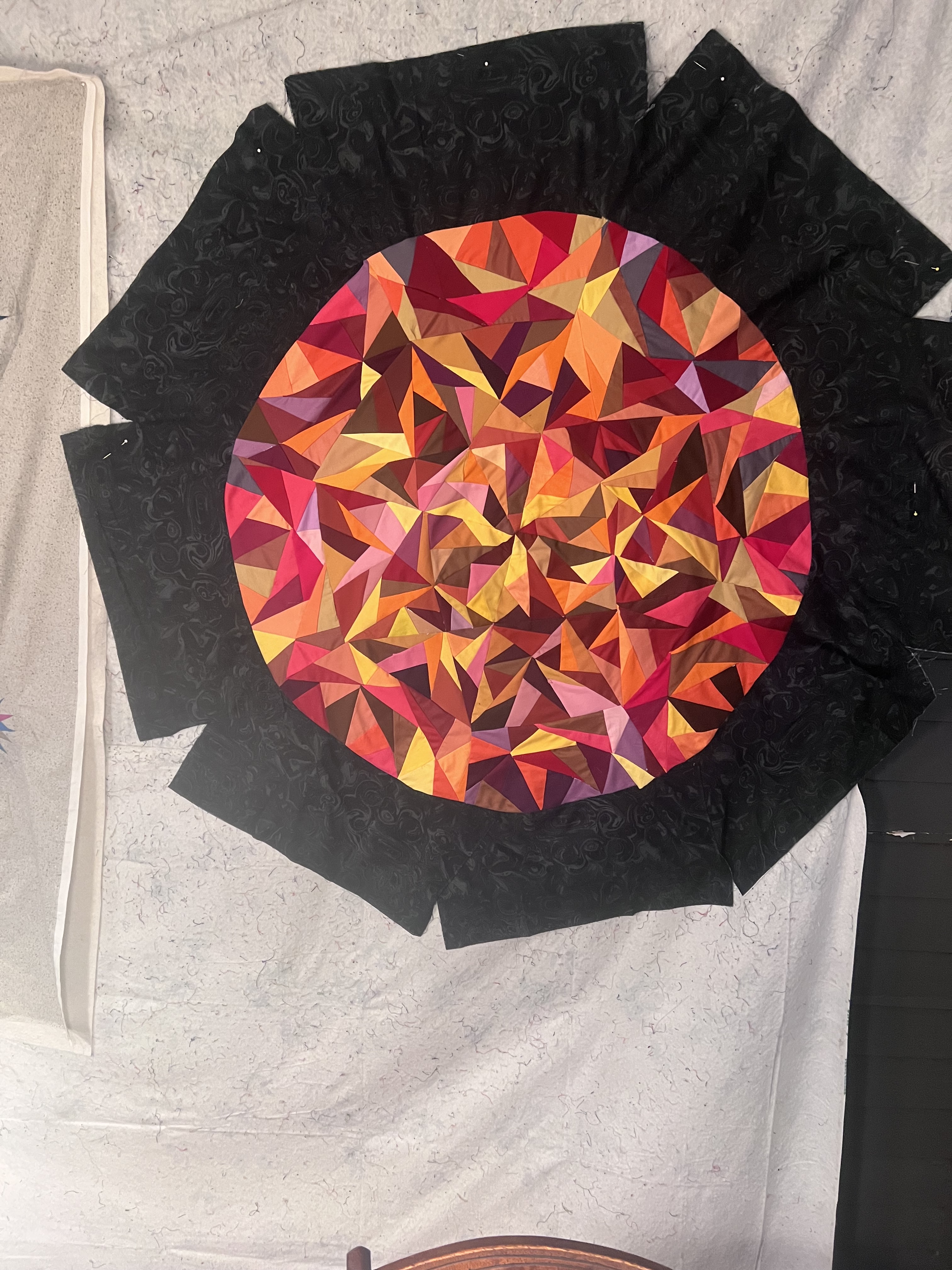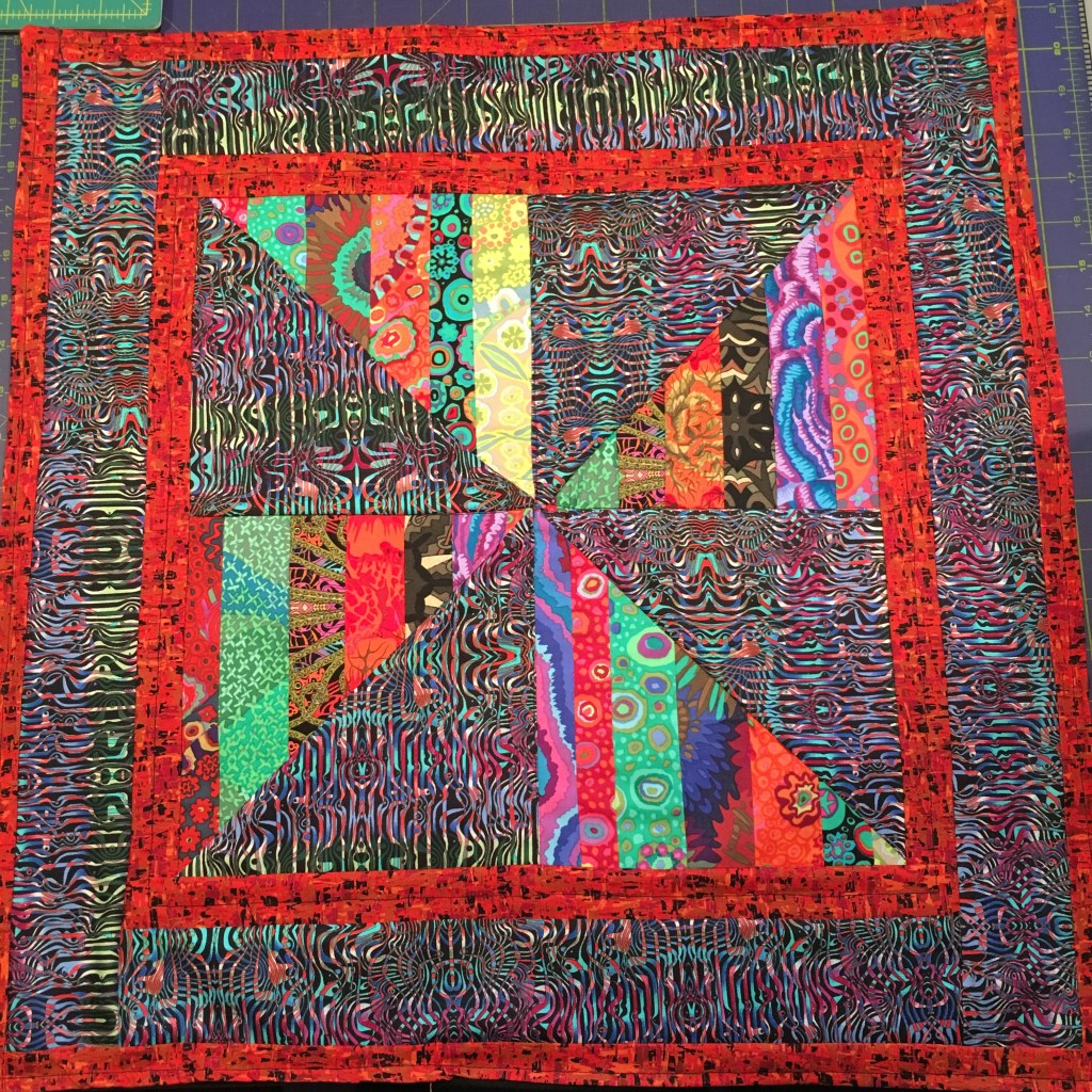 After hearing a lecture by MJ Kinman, who invented this technique, I was determined to try to create a gemstone. This photo set illustrates the method I used. I started drafting my design on graph paper; printing it out on sheets of freezer paper; cut and ironed the patches onto the freezer paper, and slowly, slowly, the segments were assembled. I was thrilled with the results!