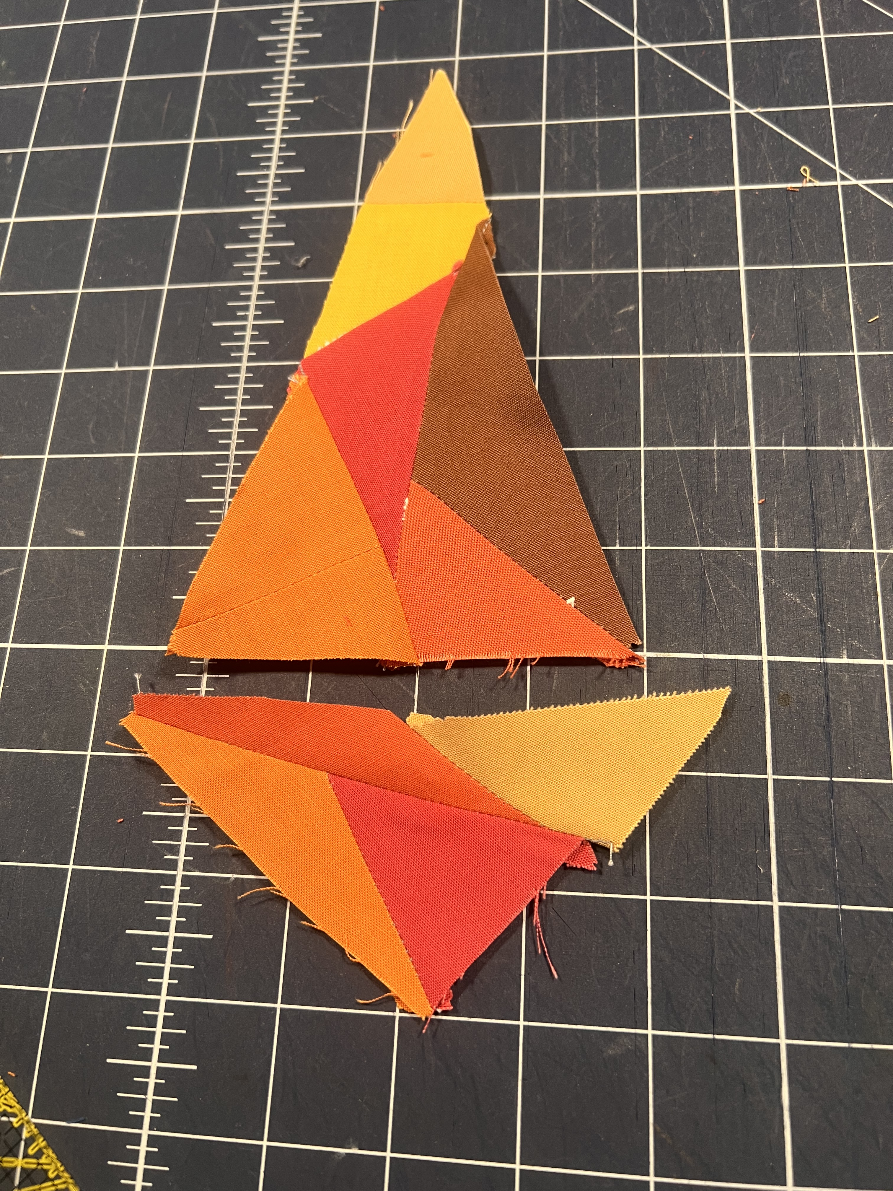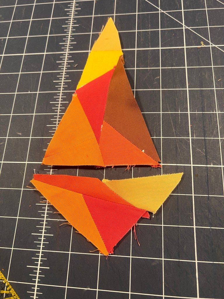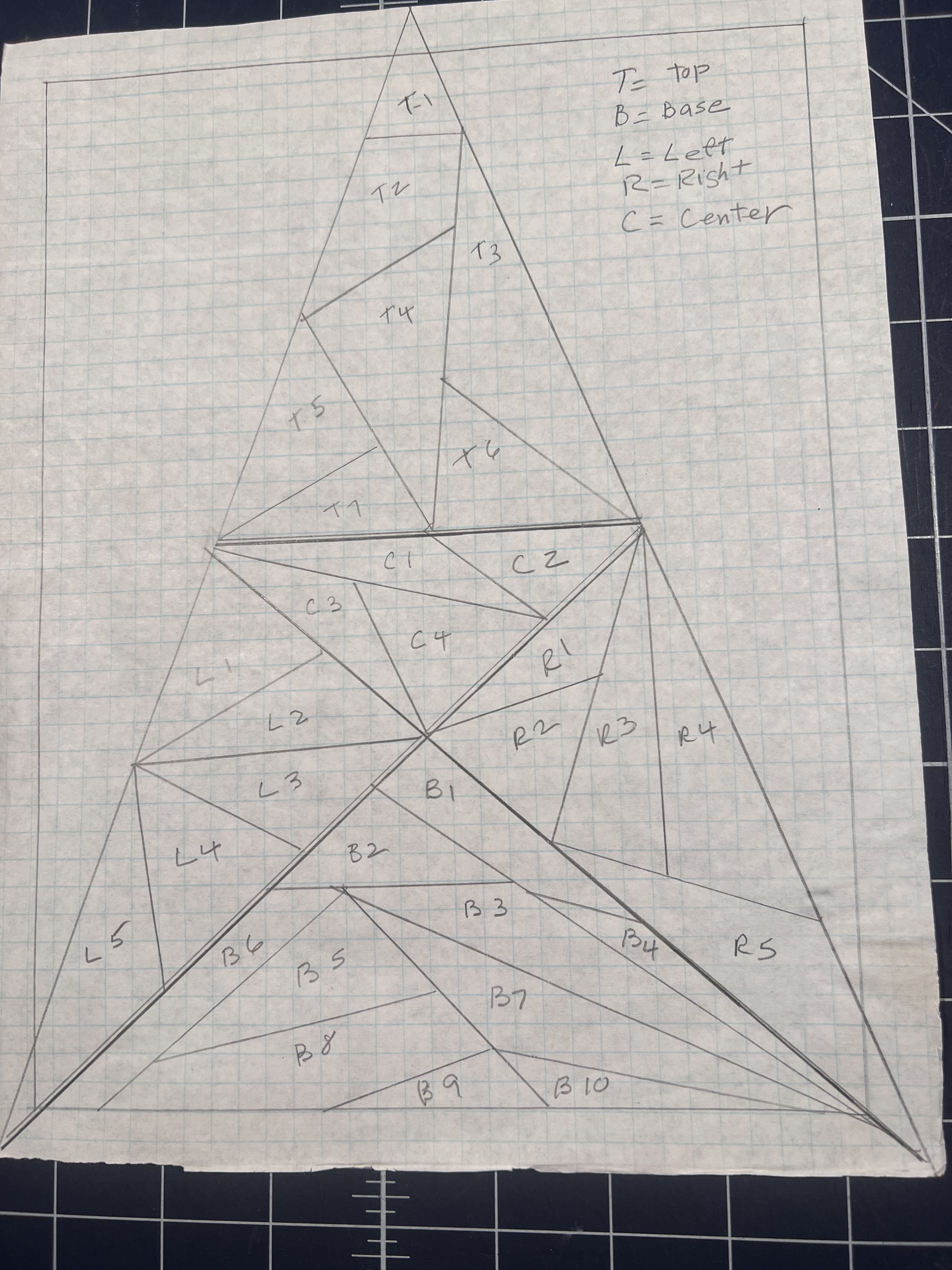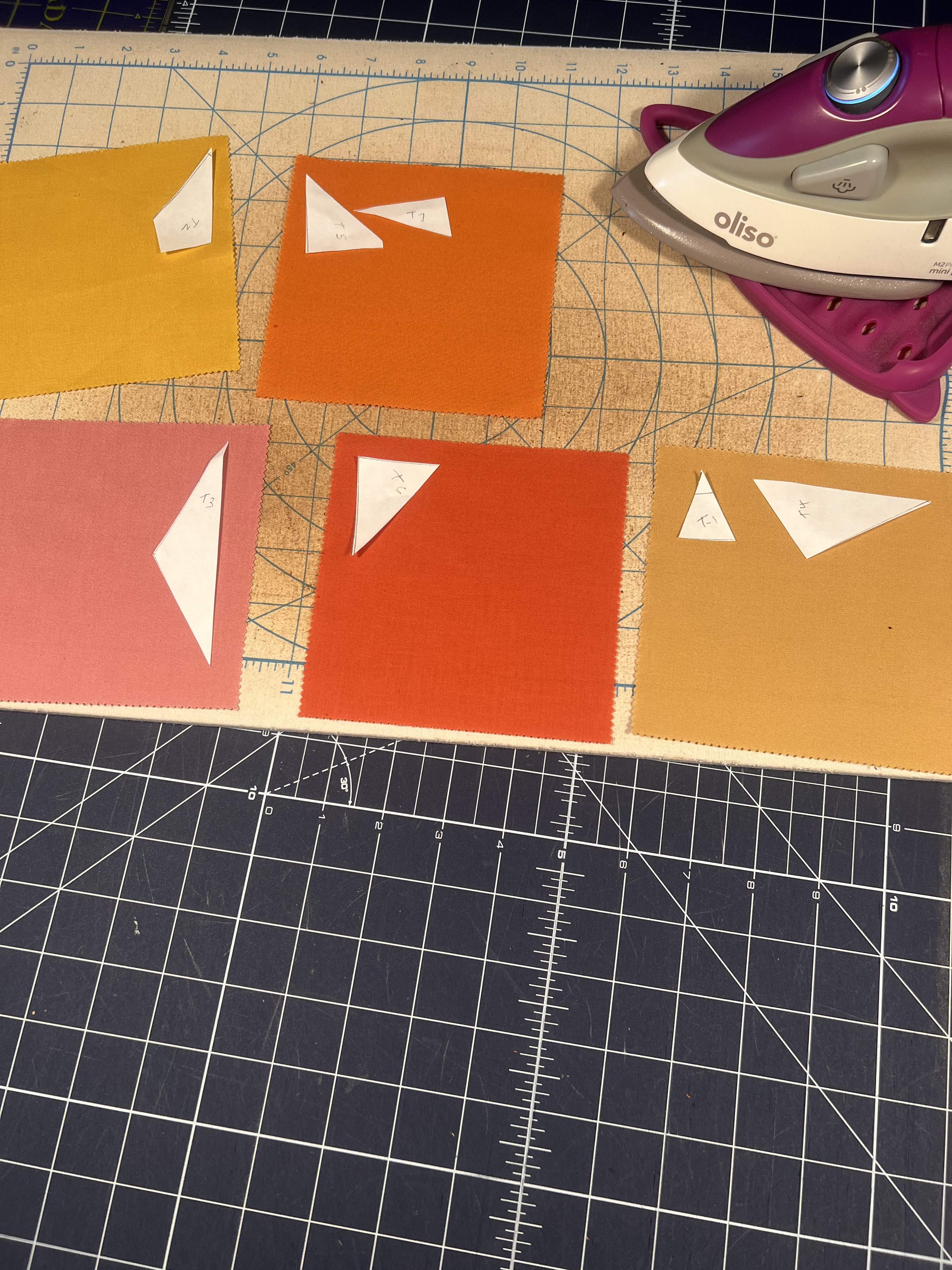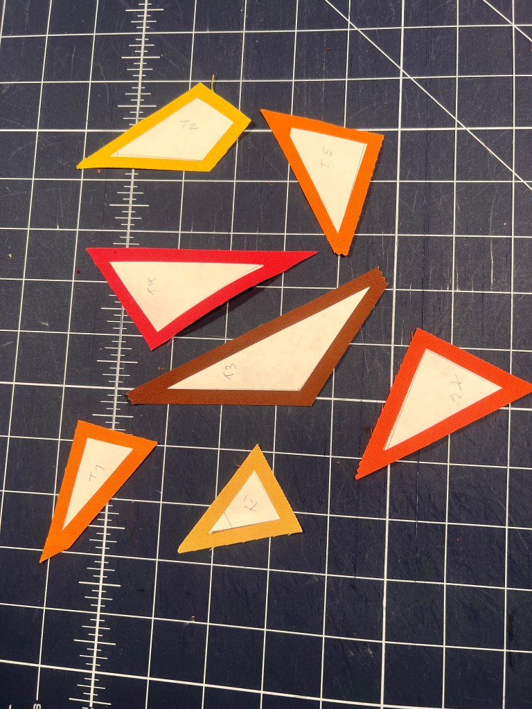 After hearing a lecture by MJ Kinman, who invented this technique, I was determined to try to create a gemstone. This photo set illustrates the method I used. I started drafting my design on graph paper; printing it out on sheets of freezer paper; cut and ironed the patches onto the freezer paper, and slowly, slowly, the segments were assembled. I was thrilled with the results!