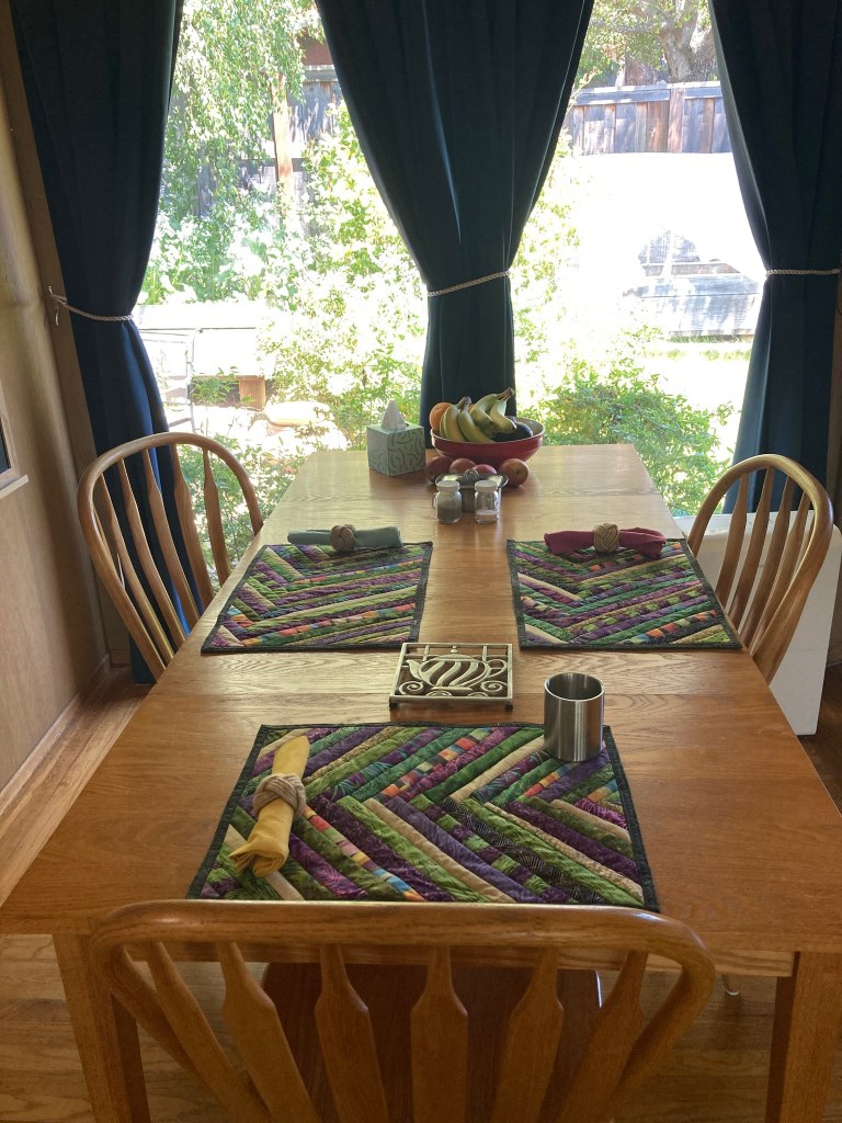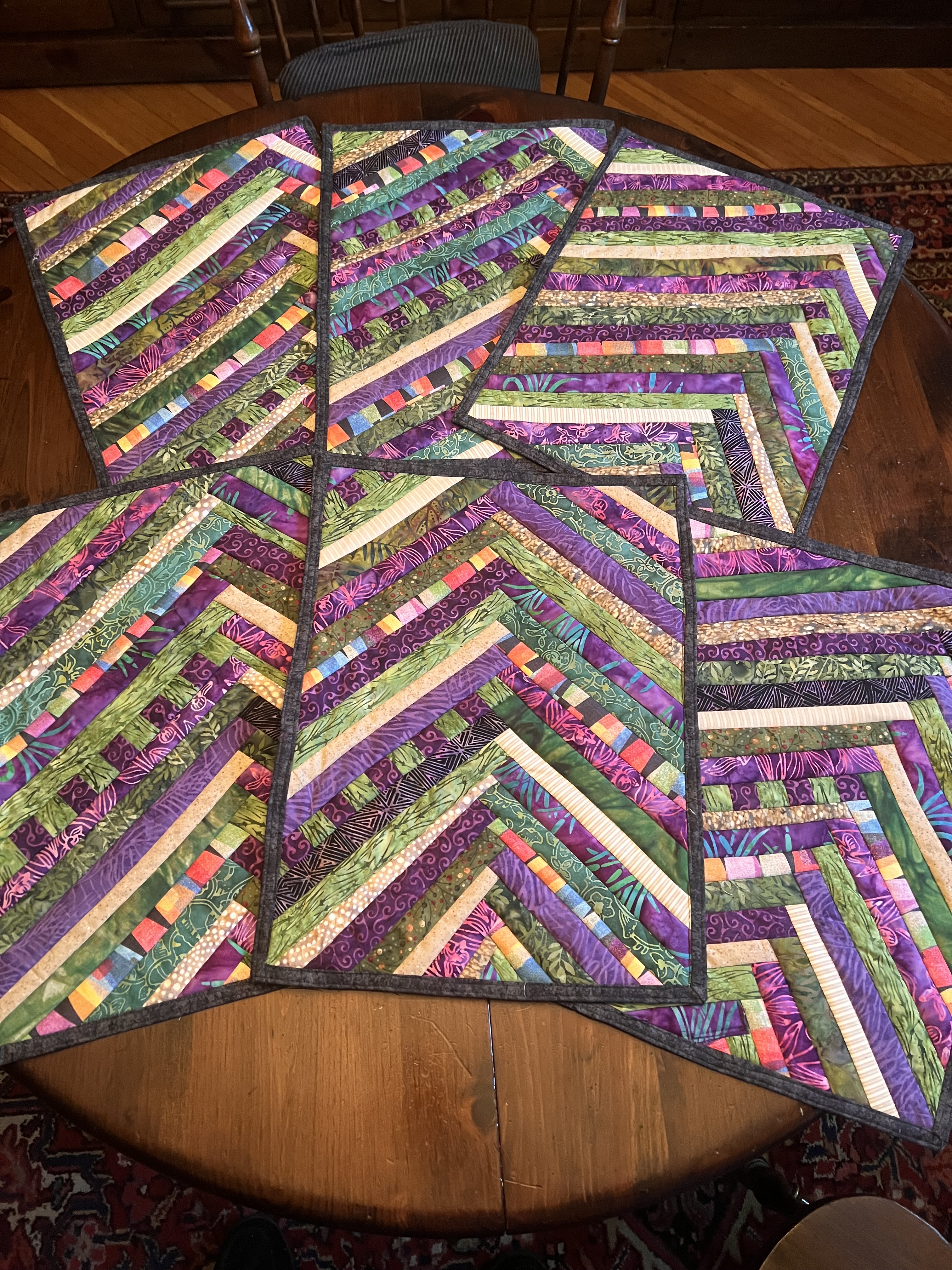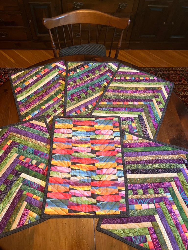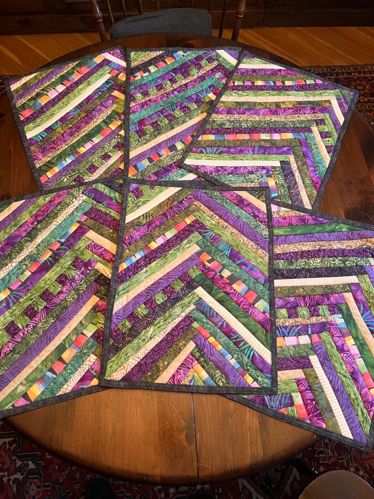 Our daughter requested a set of six placemats for her table. With a mind to her family’s concern with nature and earthy matters, I chose a subdued palette of muted colors in the green and purple range. On the backs, I chose a brighter pattern for a reversable set. I set piles and piles of one-inch strips on my work table, and the placemats came together very quickly, to her family’s delight.
