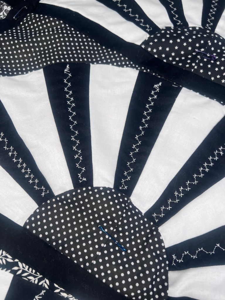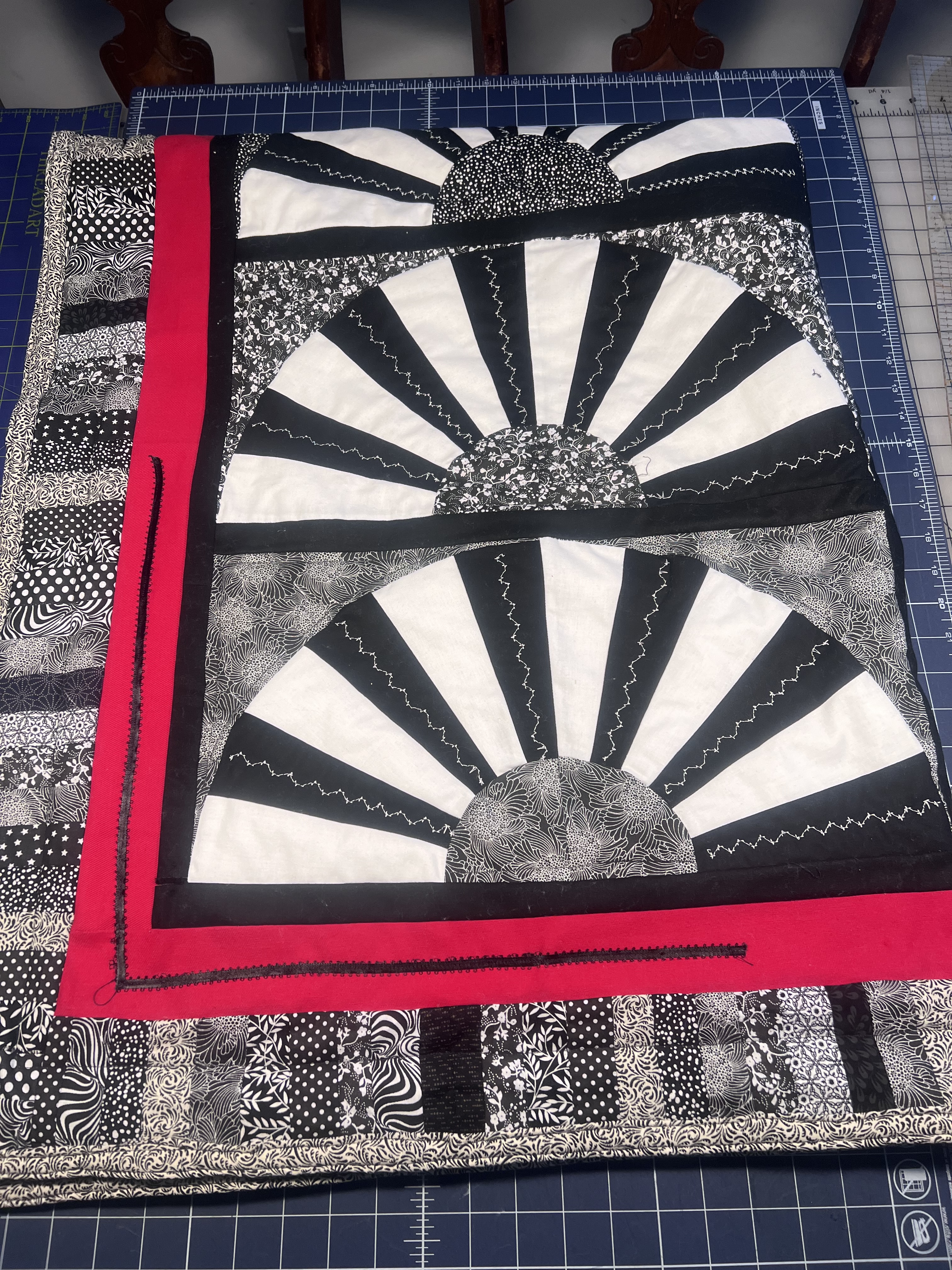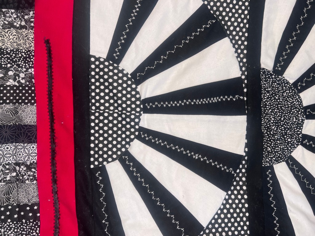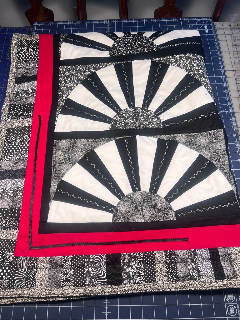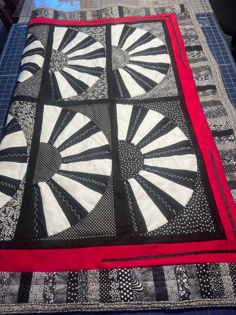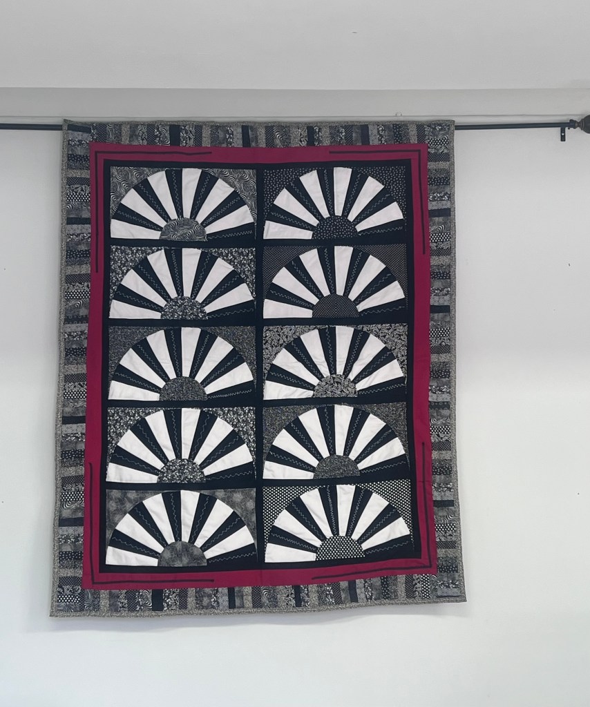 I have wanted to delve back into Black and White work for some time, and came up with the idea of fan blades. I utilized my Accuquilt GO fabric cutting machine and a “Block on Board” die for precise and easy preparation. Using a medley of black and white prints, and solid black and white, a red accent for an inner border, and piano key outer border, Arches was born. I used the embroidery stitches on my Viking sewing machine to emblish the blades. My quilt is now displayed in the front office of my NYS Assemblywoman, Jenifer Rajkumar, who supports the arts and artists in our community.
