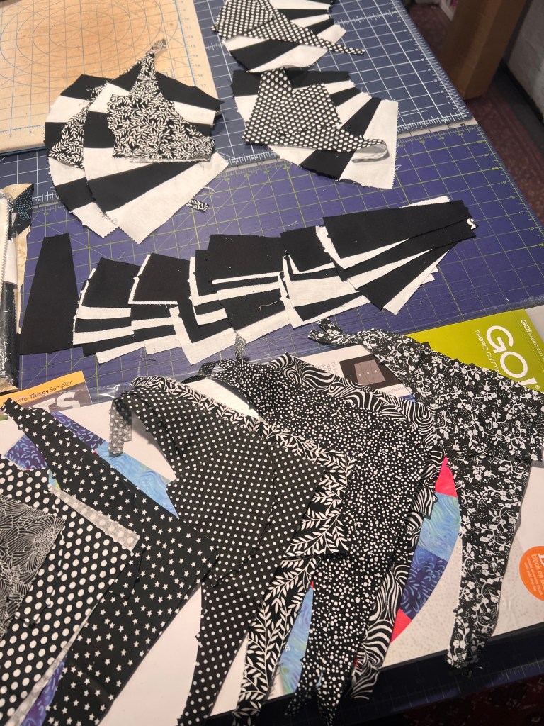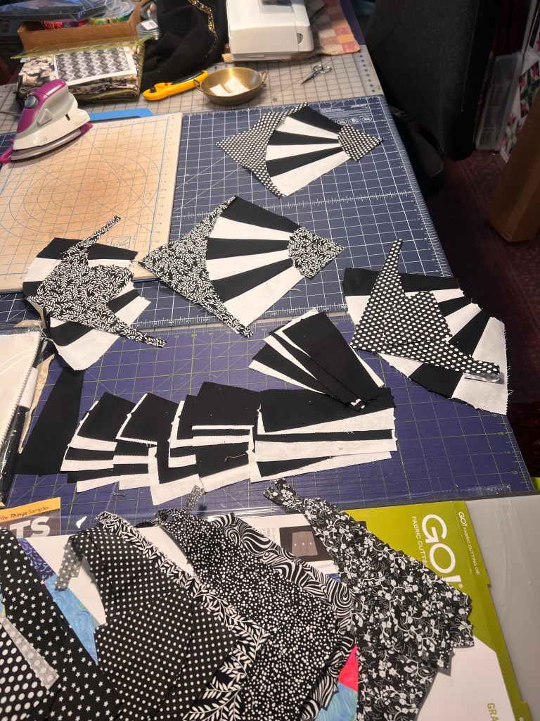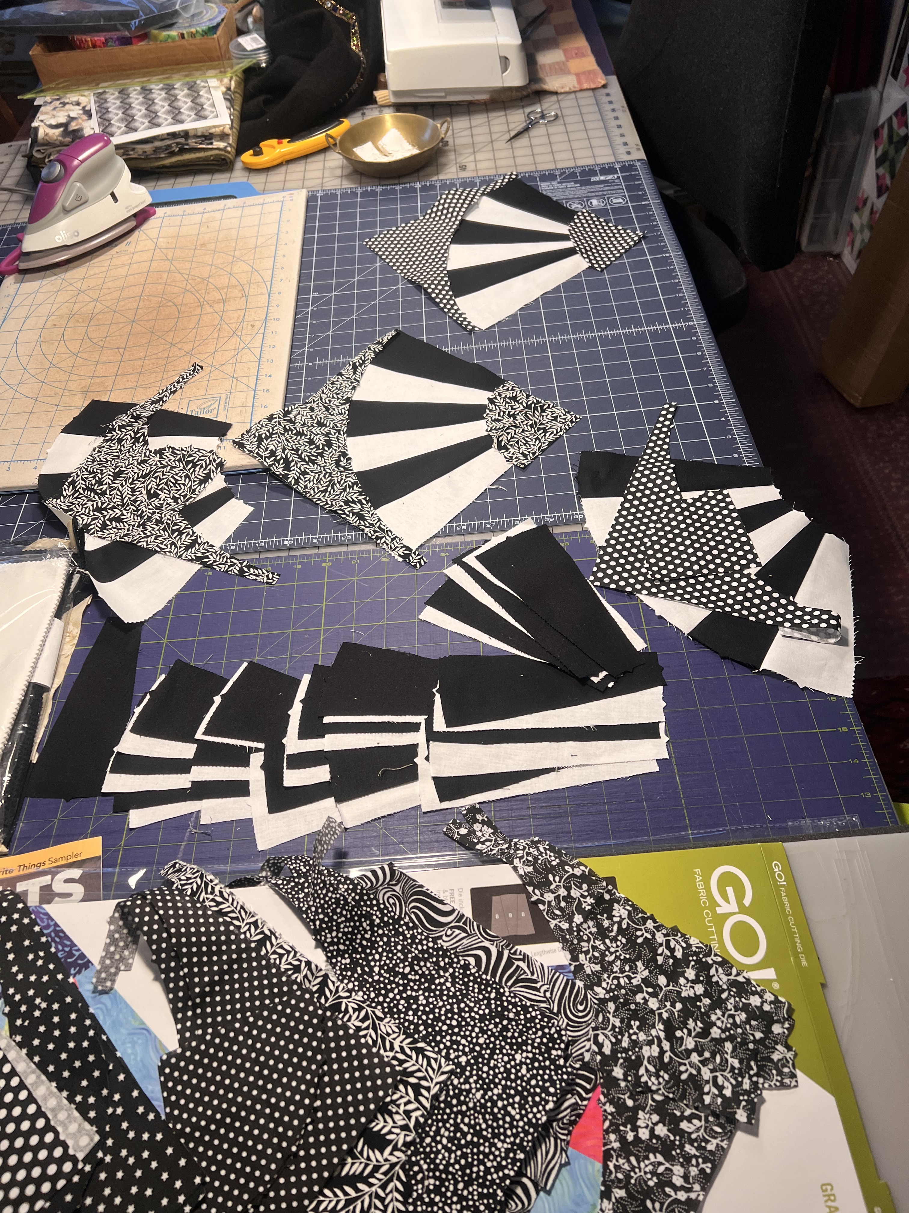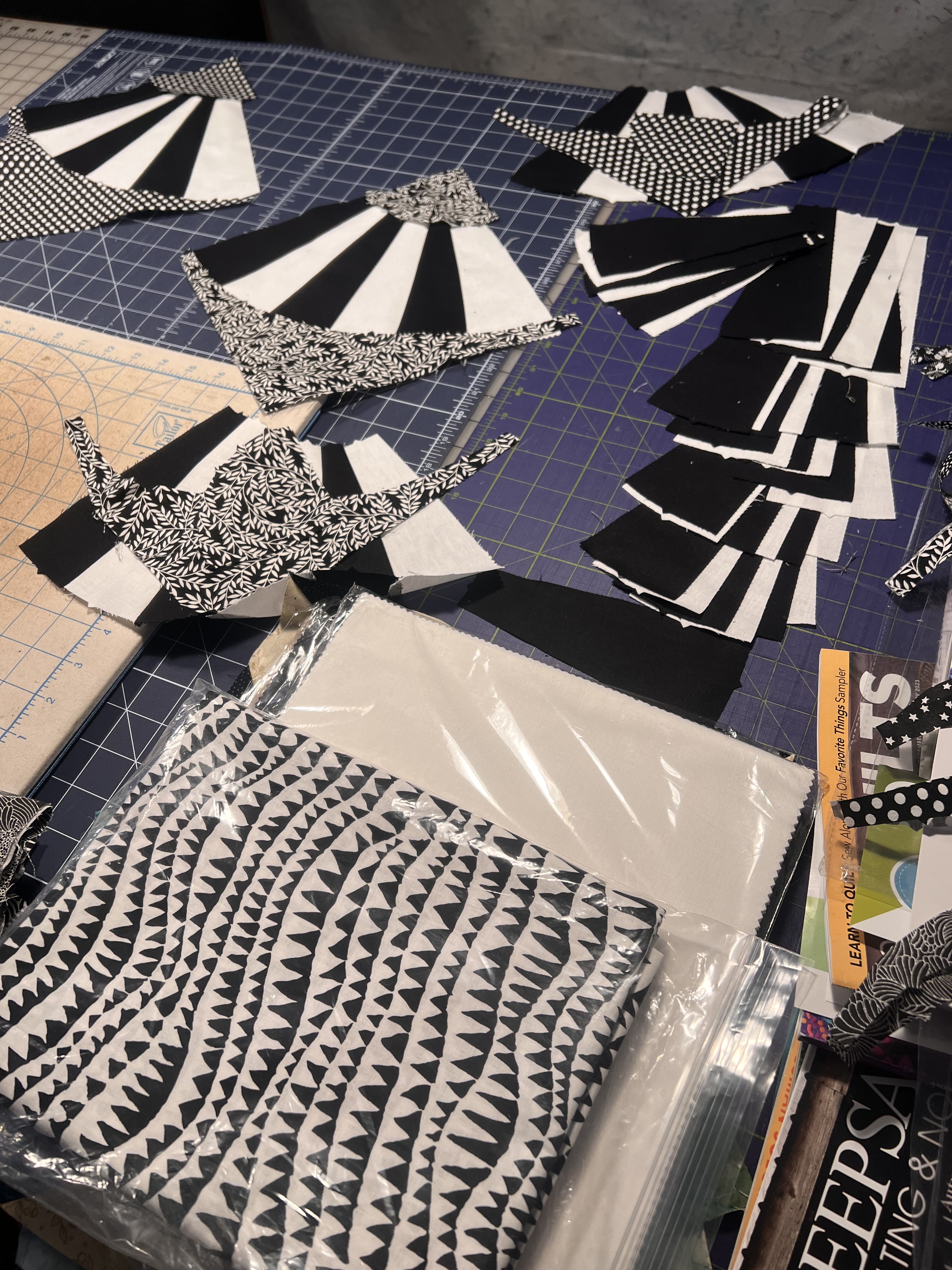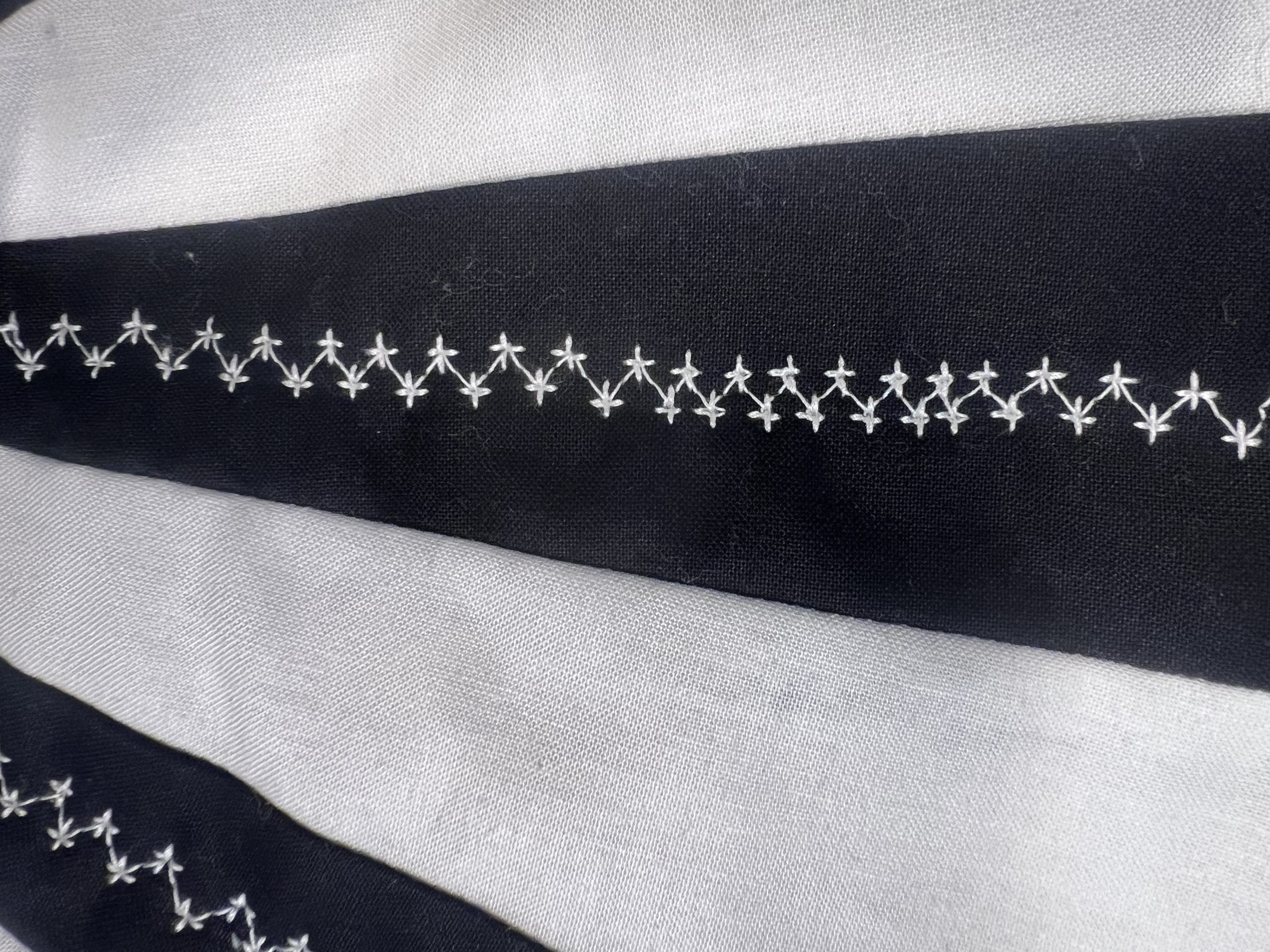 I have wanted to delve back into Black and White work for some time, and came up with the idea of fan blades. I utilized my Accuquilt GO fabric cutting machine and a “Block on Board” die for precise and easy preparation. Using a medley of black and white prints, and solid black and white, a red accent for an inner border, and piano key outer border, Arches was born. I used the embroidery stitches on my Viking sewing machine to emblish the blades. My quilt is now displayed in the front office of my NYS Assemblywoman, Jenifer Rajkumar, who supports the arts and artists in our community.