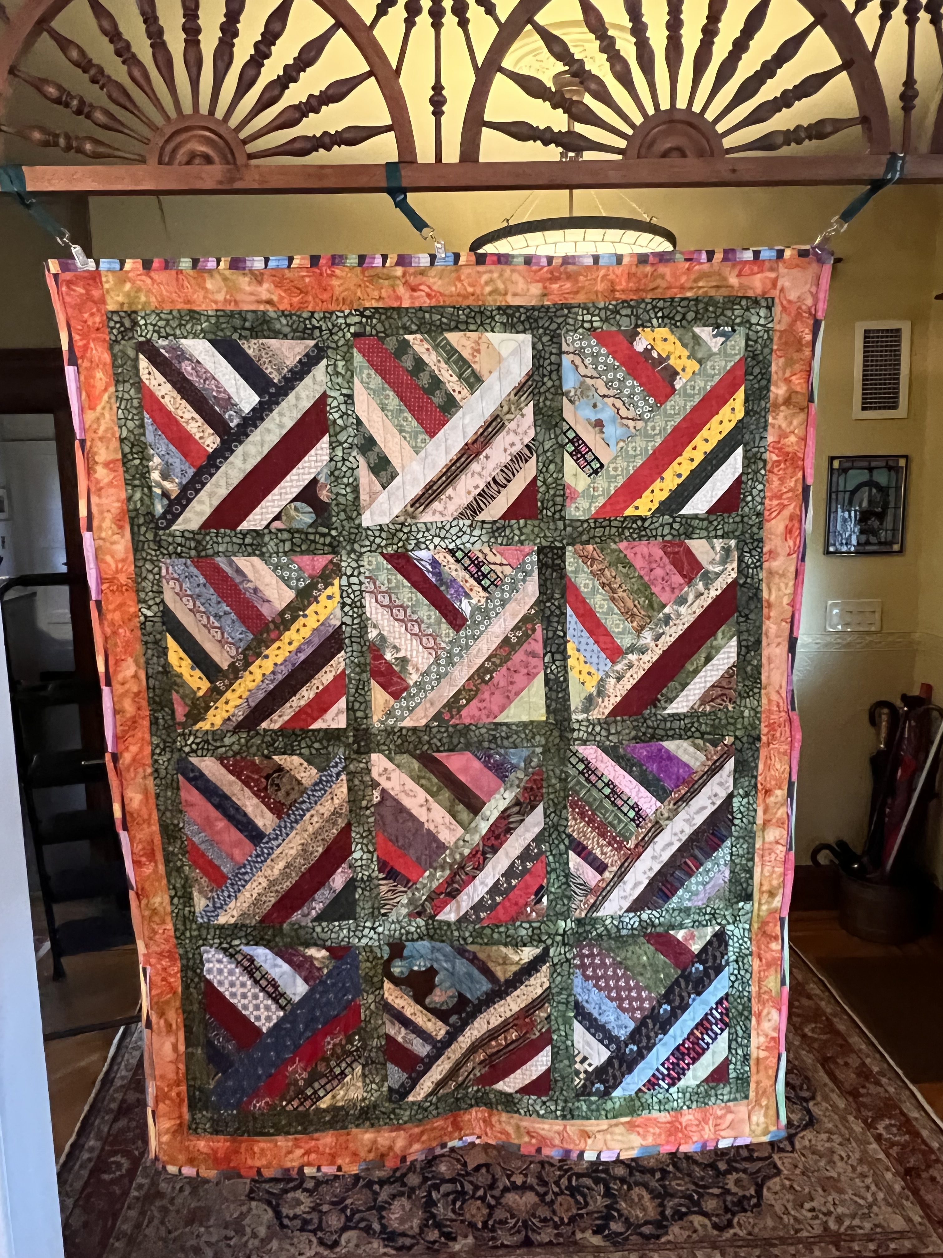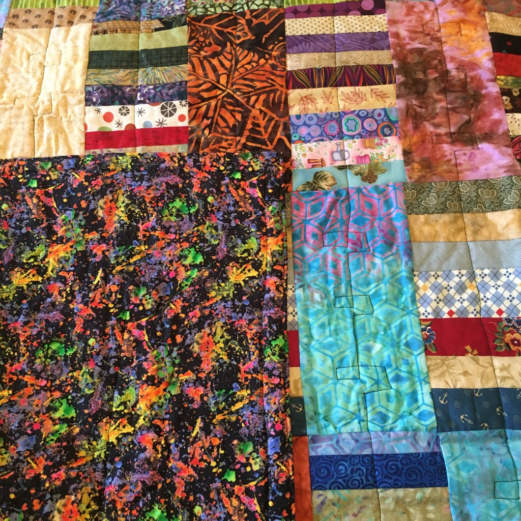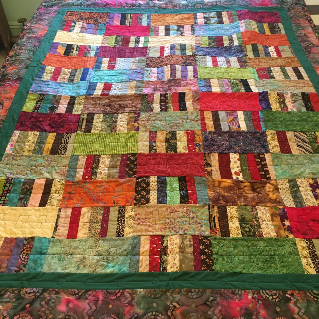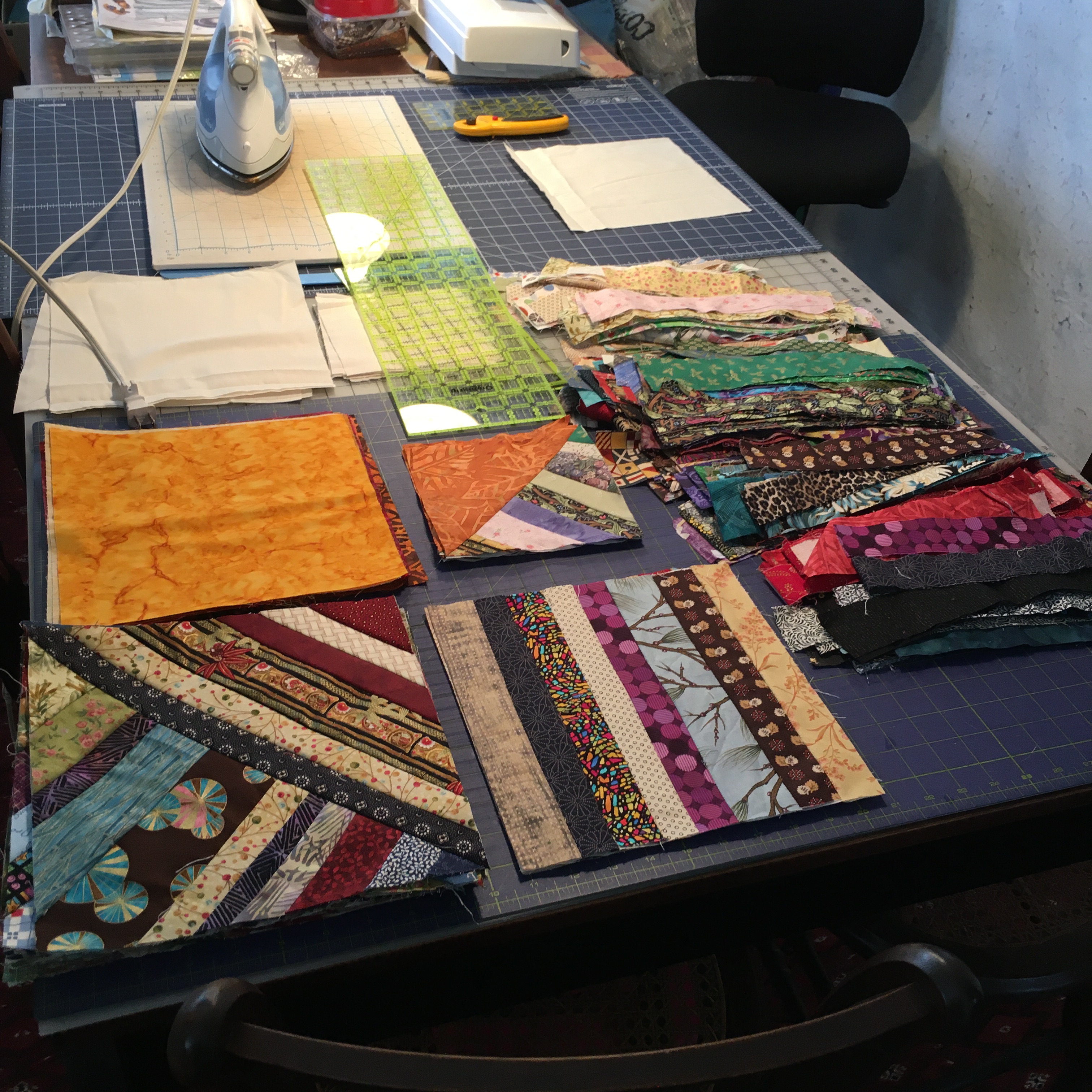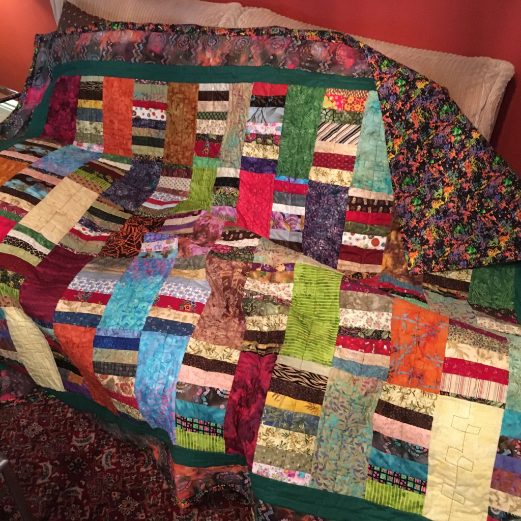 After many years of quilting, my scrap bag was quite full of strips and bits. During one long rainy week, I dumped it all out on my table, and started making squares using those pieces. I sewed the srips onto muslin backing, then assembled a number of quilt tops. I was amazed at how many quilts I could make out of those remnants. All those strips are memories of previous quilts.
