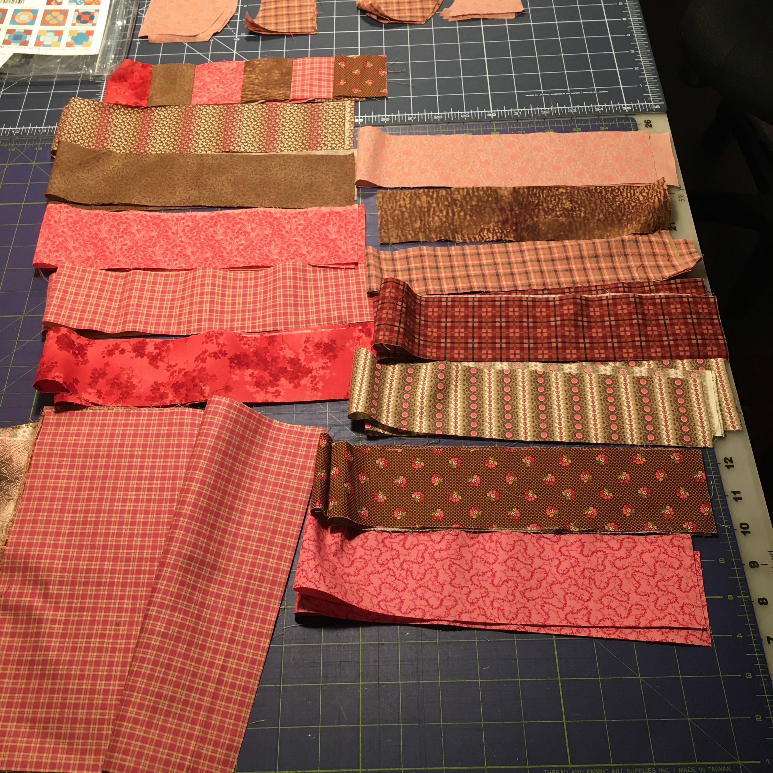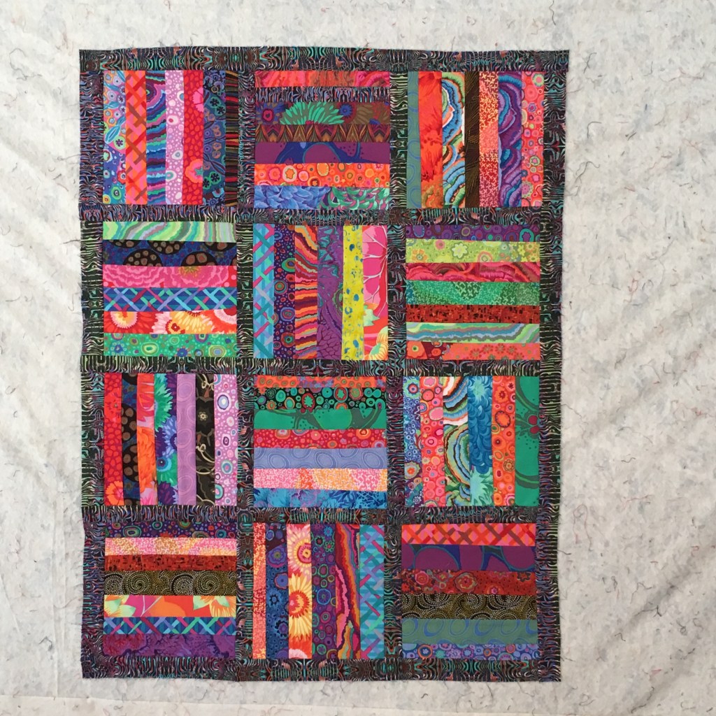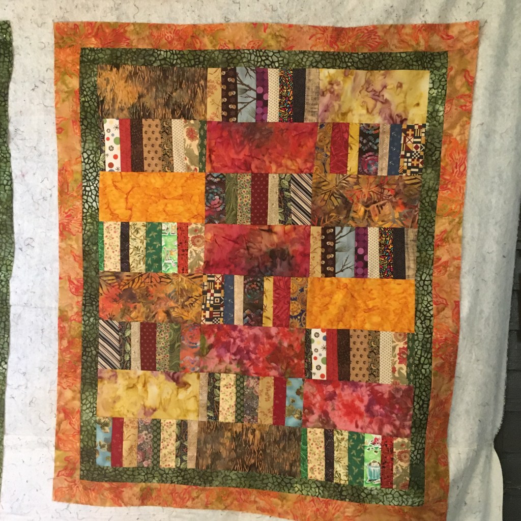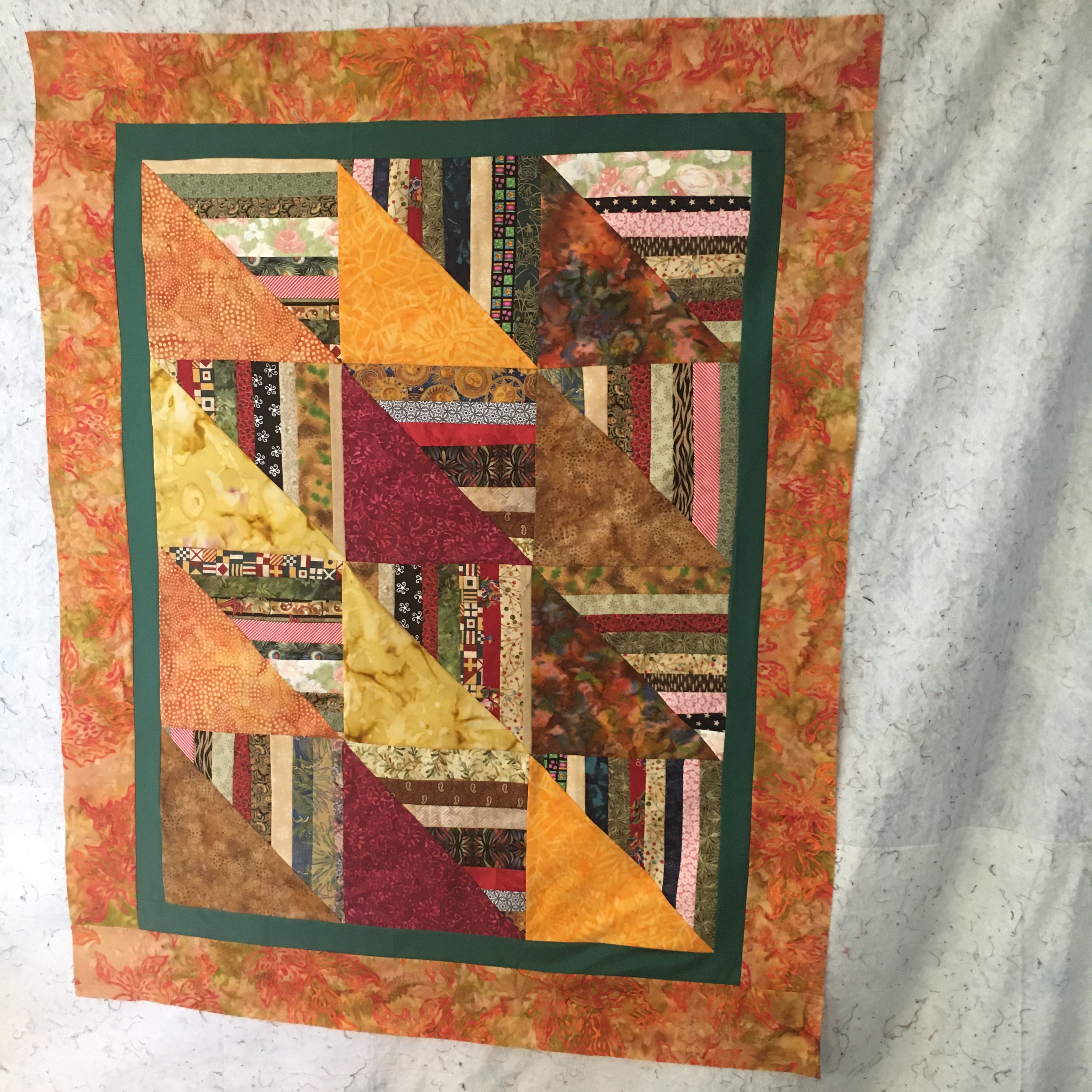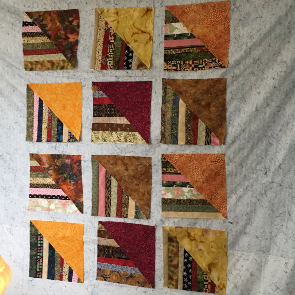 After many years of quilting, my scrap bag was quite full of strips and bits. During one long rainy week, I dumped it all out on my table, and started making squares using those pieces. I sewed the srips onto muslin backing, then assembled a number of quilt tops. I was amazed at how many quilts I could make out of those remnants. All those strips are memories of previous quilts.